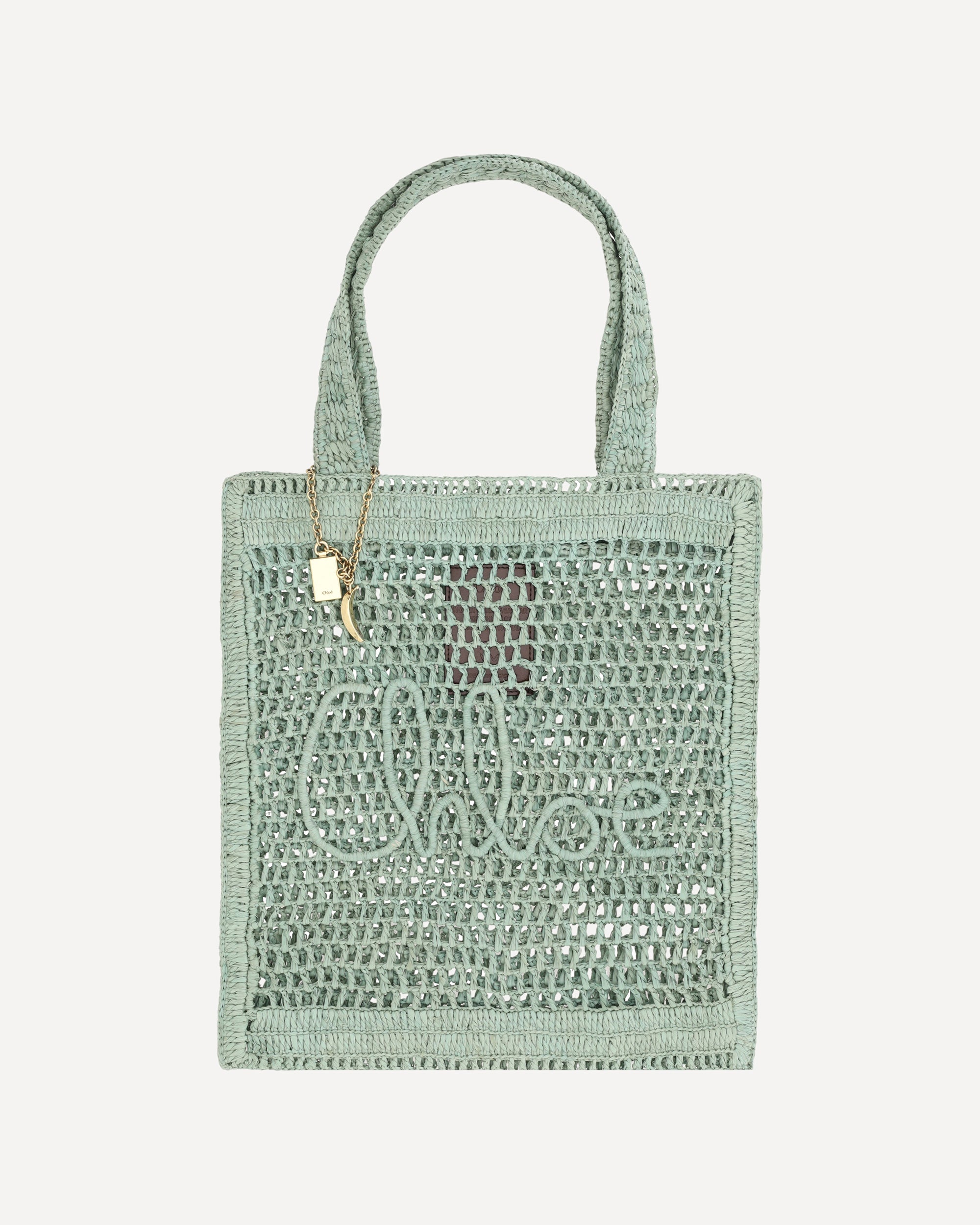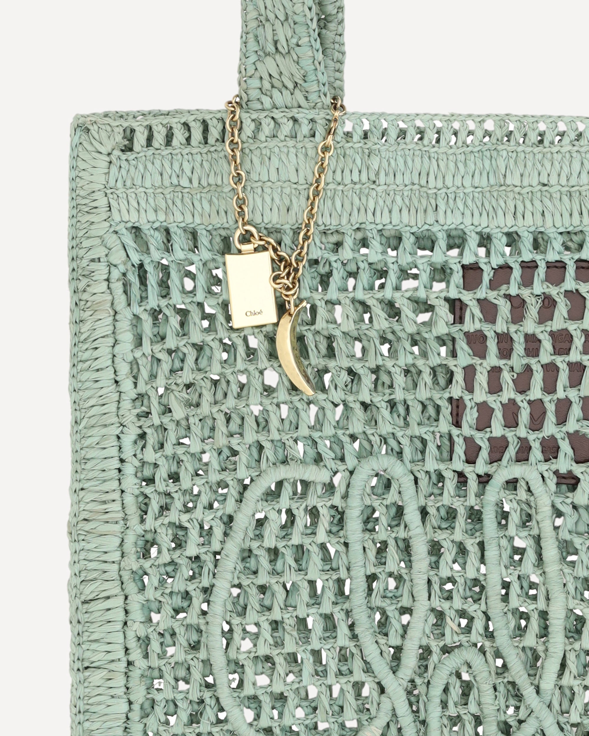 La Borsa Tote Summer Banana di Chloé è un accessorio elegante e fresco, realizzato in rafia con una trama traforata. Dispone di due manici superiori per un comodo trasporto e presenta l'iconico monogramma ricamato sul fronte. Un ciondolo a forma di banana dorata è applicato al manico, aggiungendo un tocco distintivo. All'interno, c'è un patch in pelle logata e un unico scomparto interno per riporre gli oggetti essenziali. Perfetta per l'estate, unisce praticità e stile.