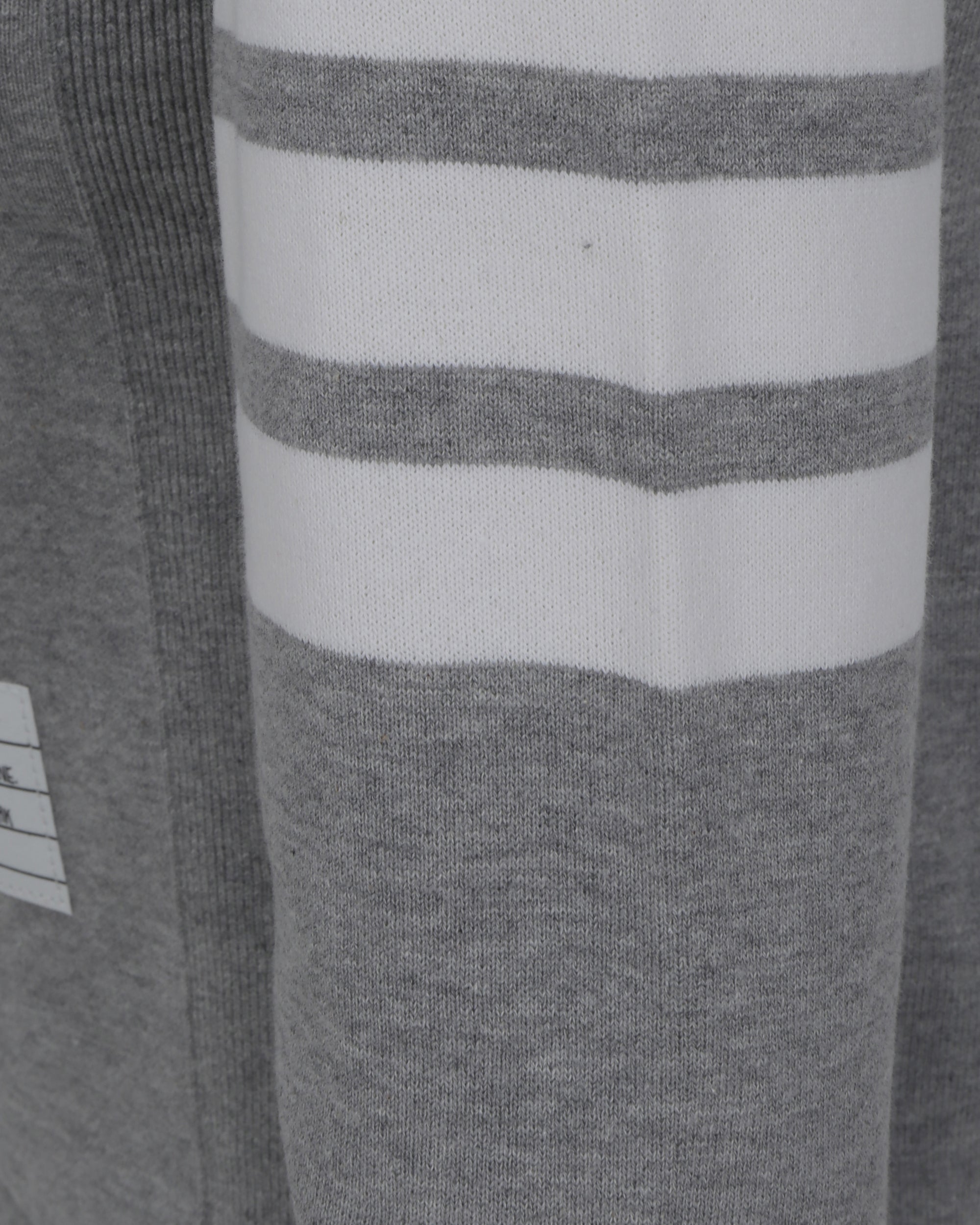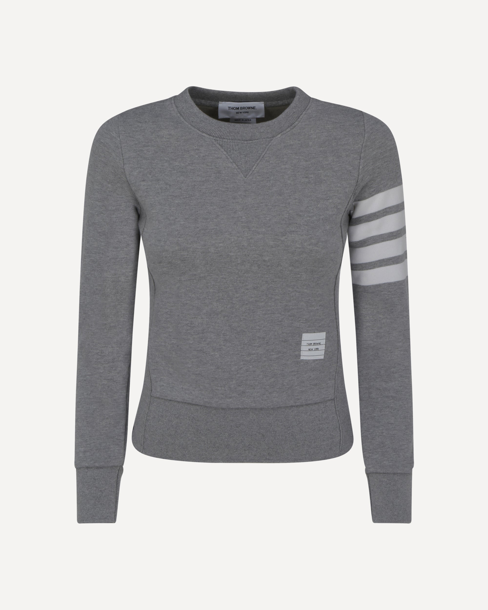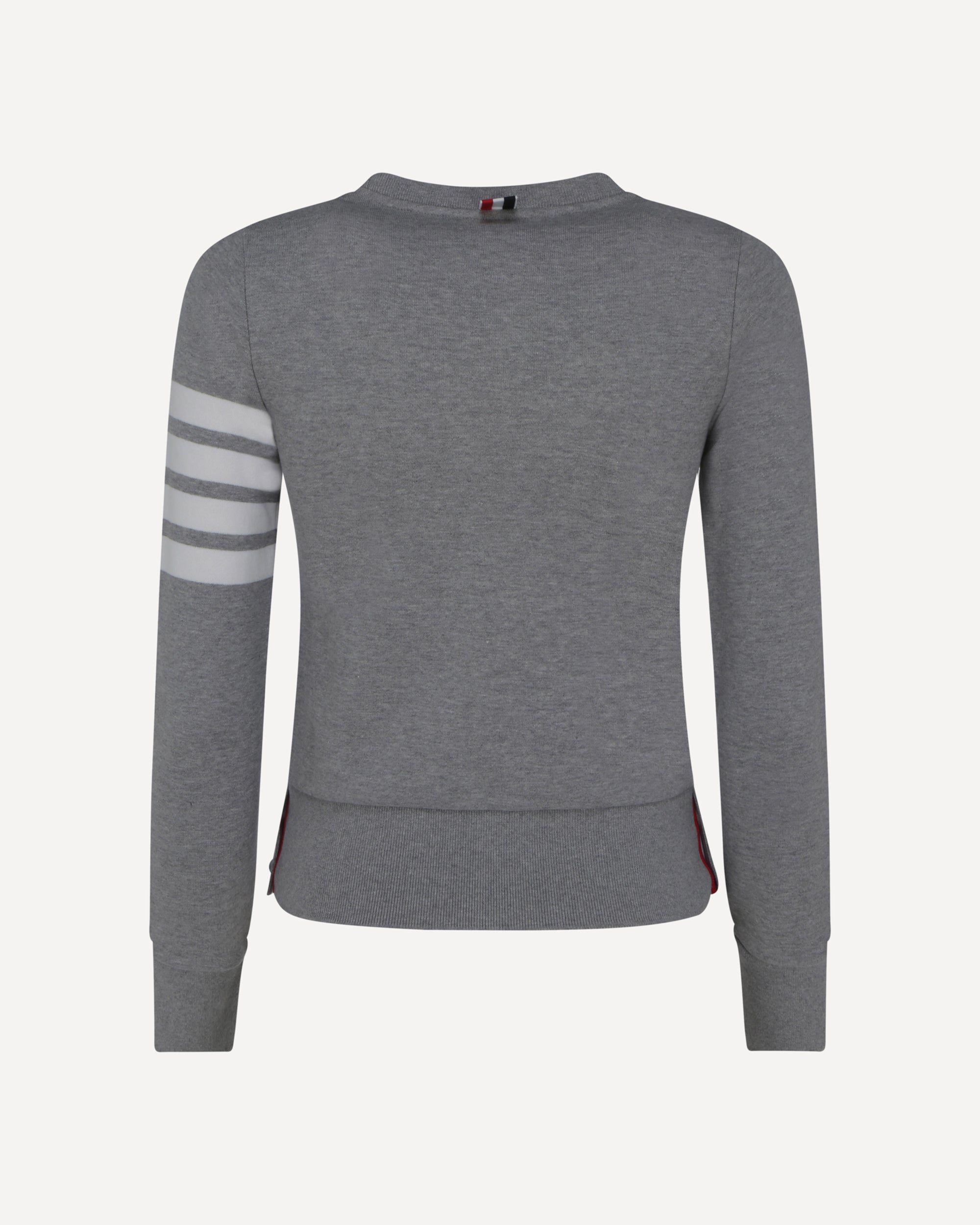 Felpa in Cotone di Thom Browne, girocollo a costine, iconiche bande a contrasto logo brand sul braccio, polsini a costine, bottoncini laterali per spacco, targhetta logo brand ricamata a contrasto sul fronte.