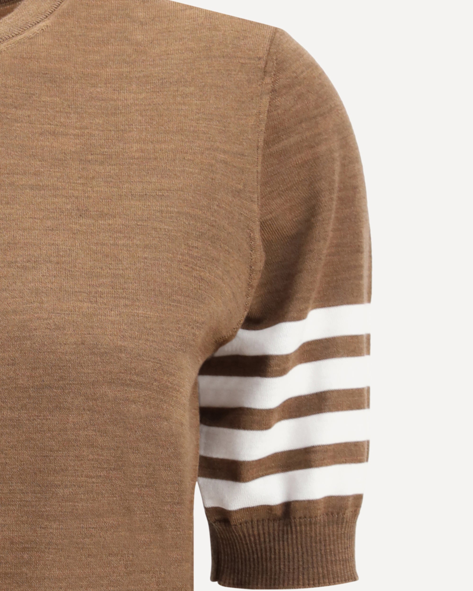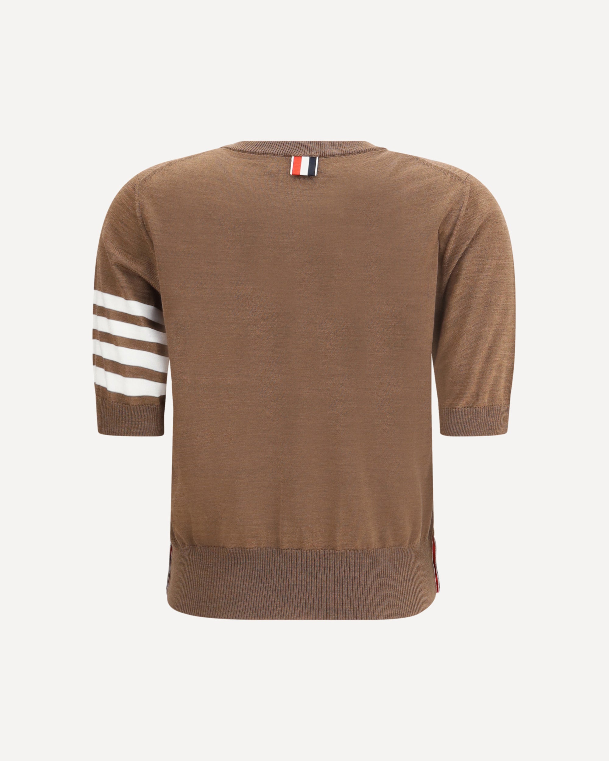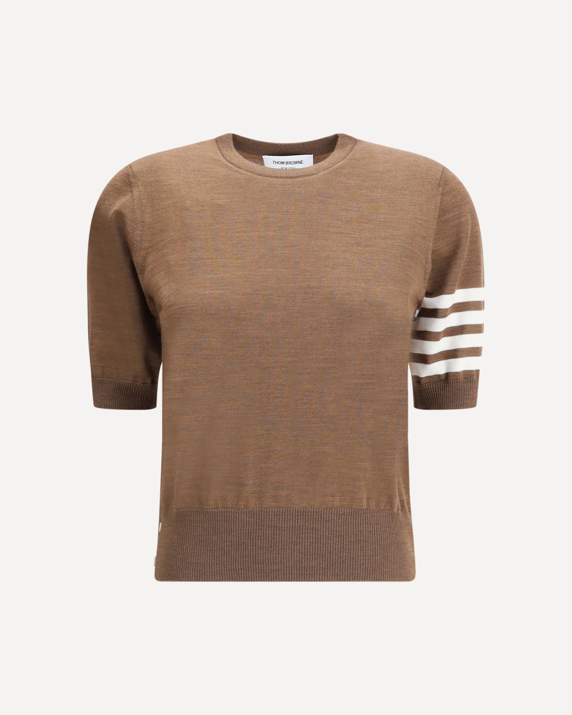 La T-Shirt in maglia di Thom Browne è un capo dallo stile pulito e distintivo. Con girocollo e orli a costine, presenta le iconiche bande del brand sulla manica sinistra, un dettaglio che ne sottolinea l'identità unica. L'orlo a costine con lievi spacchi laterali aggiunge un tocco di modernità e comfort, rendendola perfetta per un look casual ma ricercato. Un must-have versatile per ogni guardaroba.