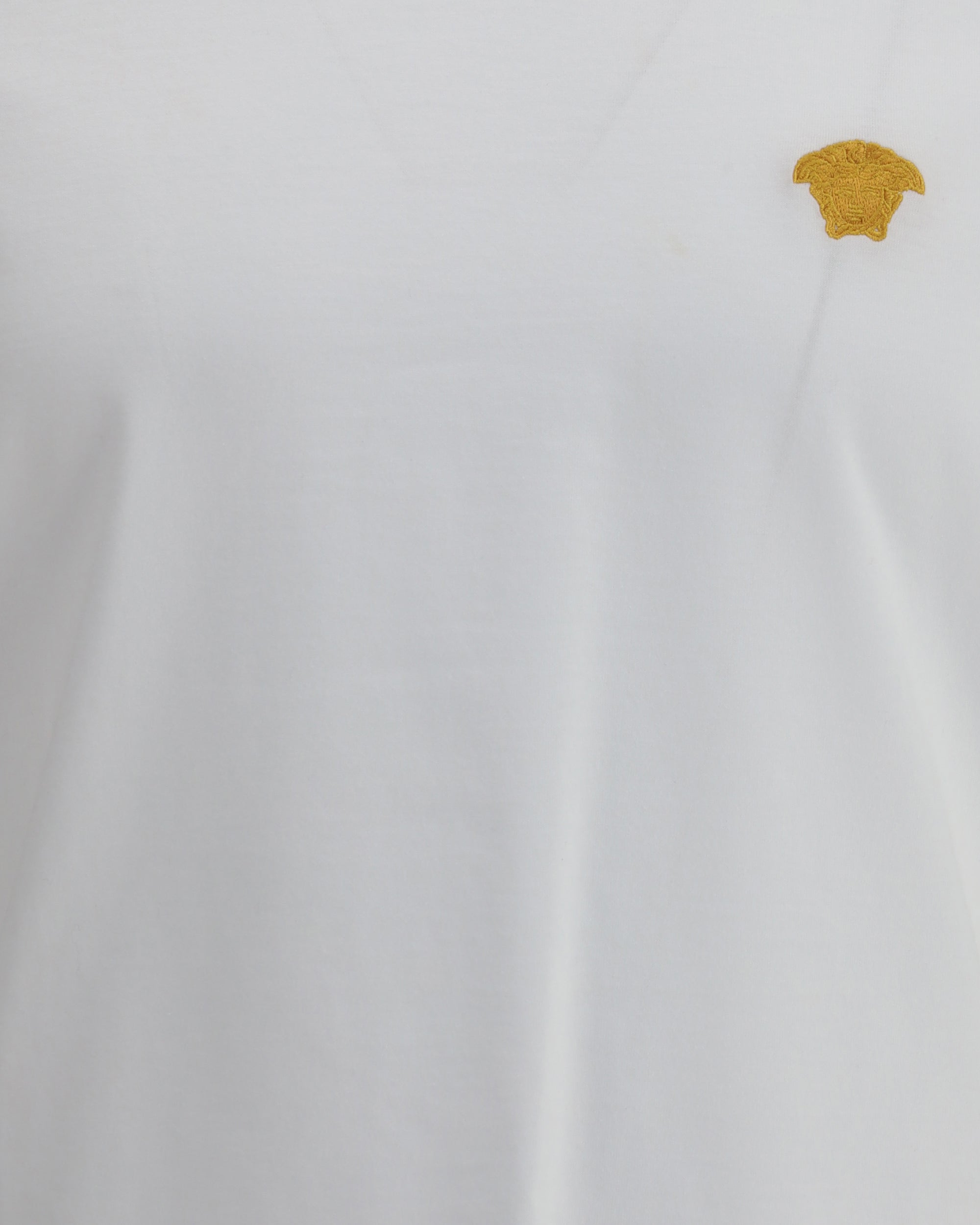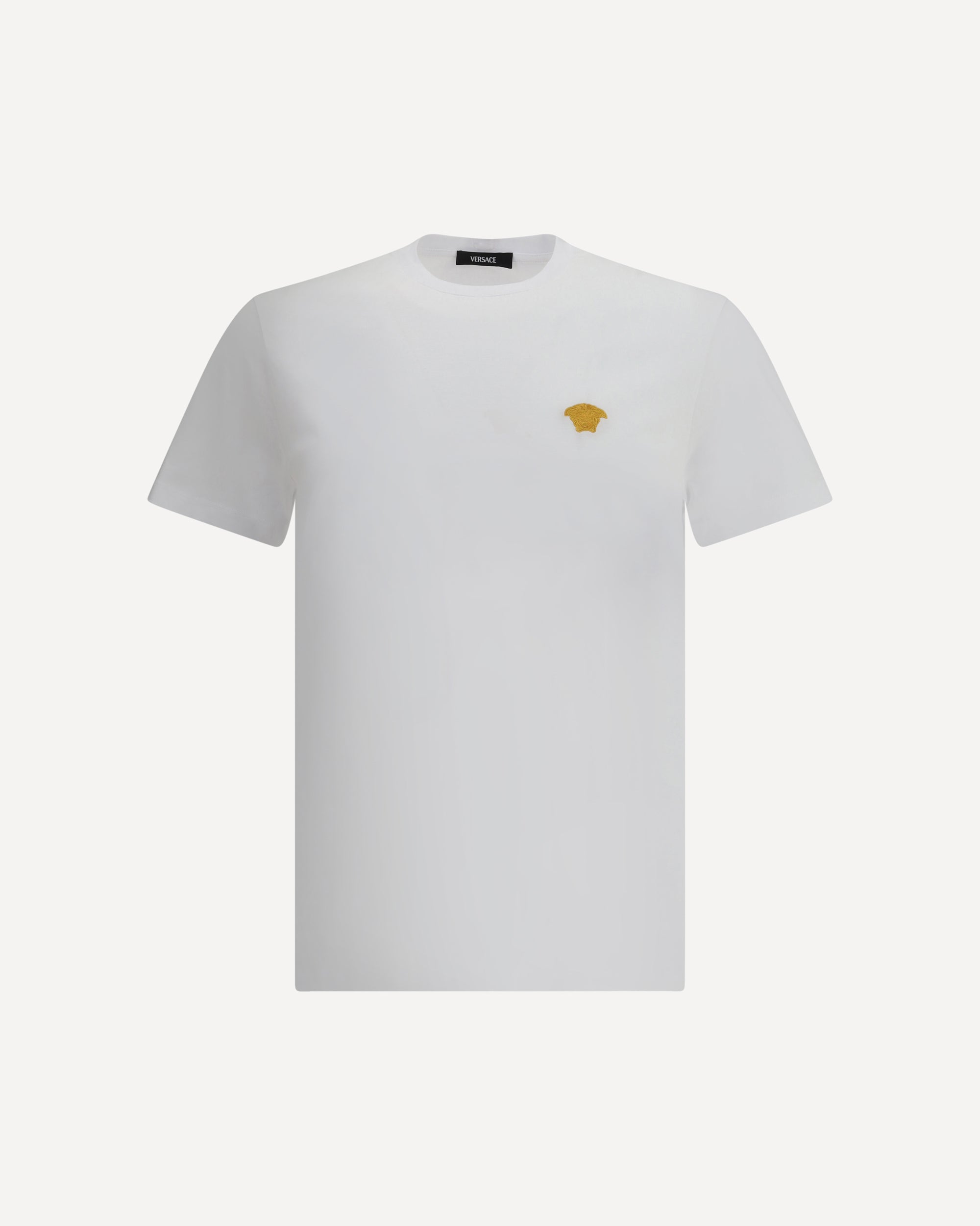 La T-Shirt in cotone di Versace unisce eleganza essenziale e identità distintiva in un capo casual di forte impatto. Realizzata in morbido cotone a fantasia monocromo, presenta un girocollo a costine e una vestibilità regular che garantisce comfort e versatilità. Sul fronte spicca una patch a contrasto con l’iconico logo Medusa, simbolo intramontabile della Maison. Un must-have contemporaneo, perfetto per completare il guardaroba quotidiano con un tocco di lusso riconoscibile.