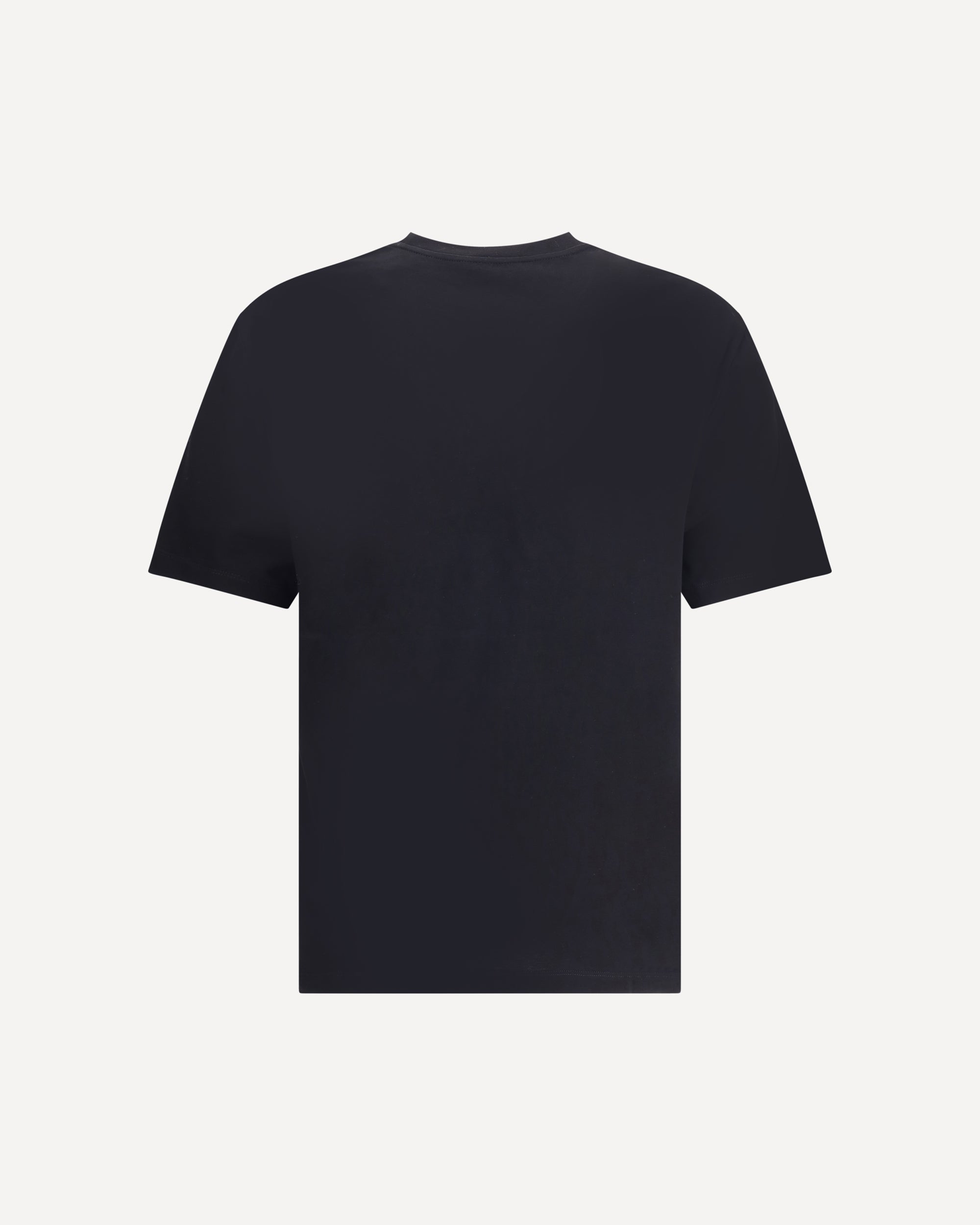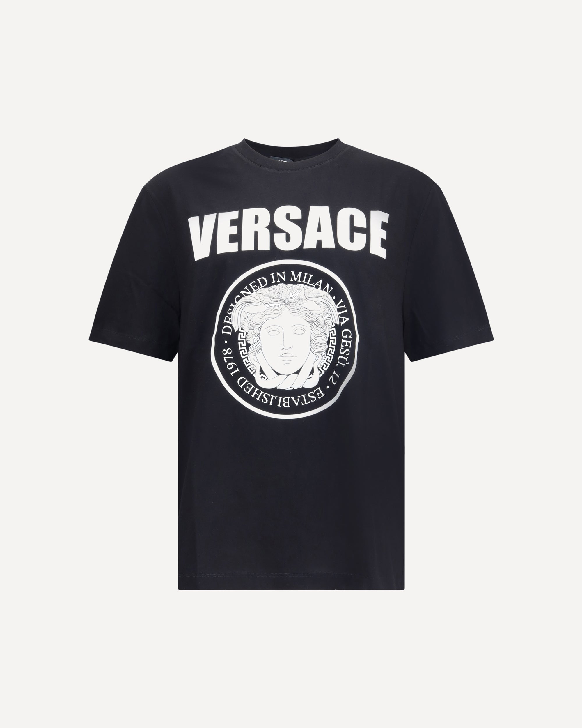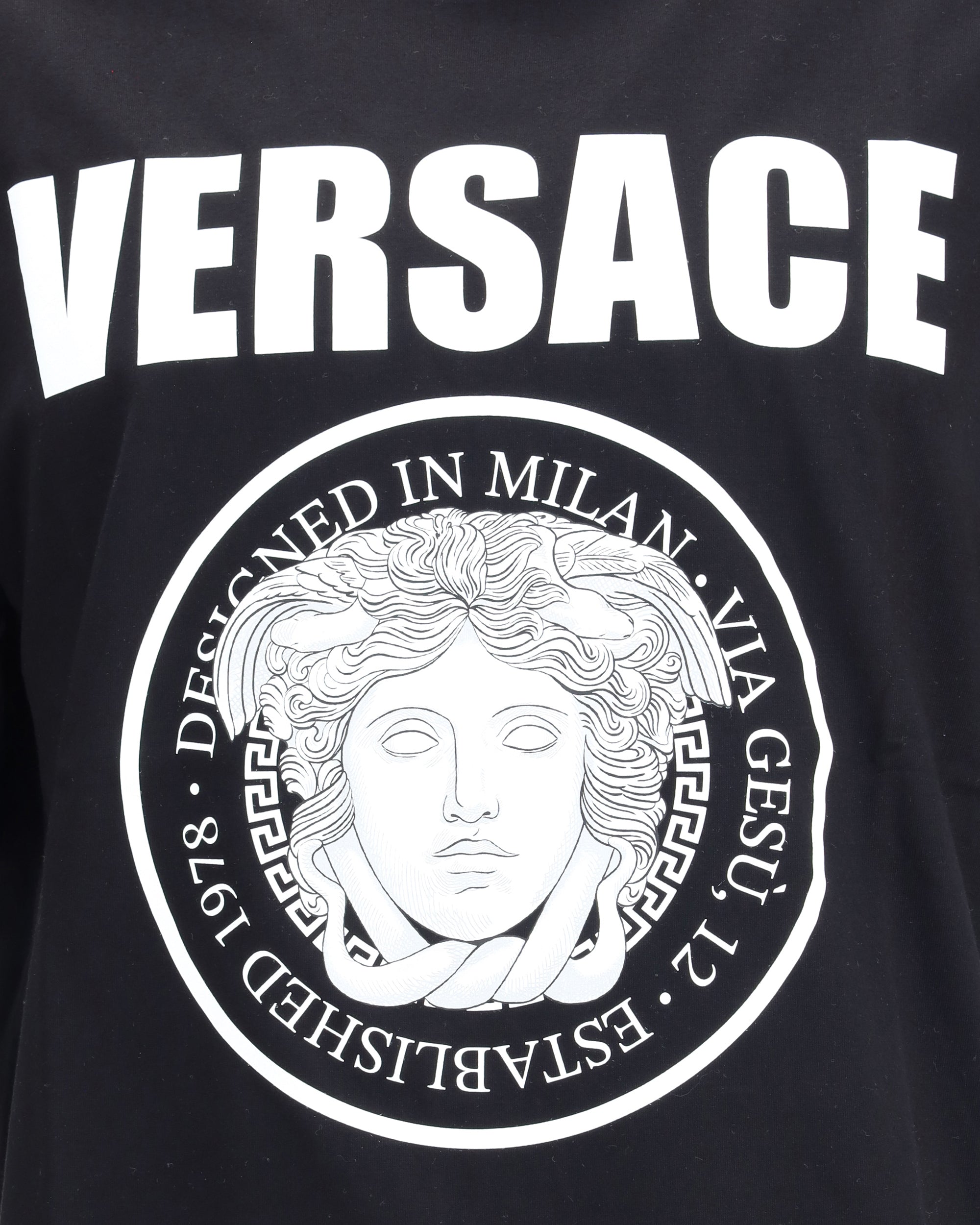 T-shirt in cotone di Versace con girocollo a costine e iconico monogramma a contrasto sul fronte, impreziosito dalla maxi testa Medusa. Un capo distintivo che unisce comfort e stile audace.