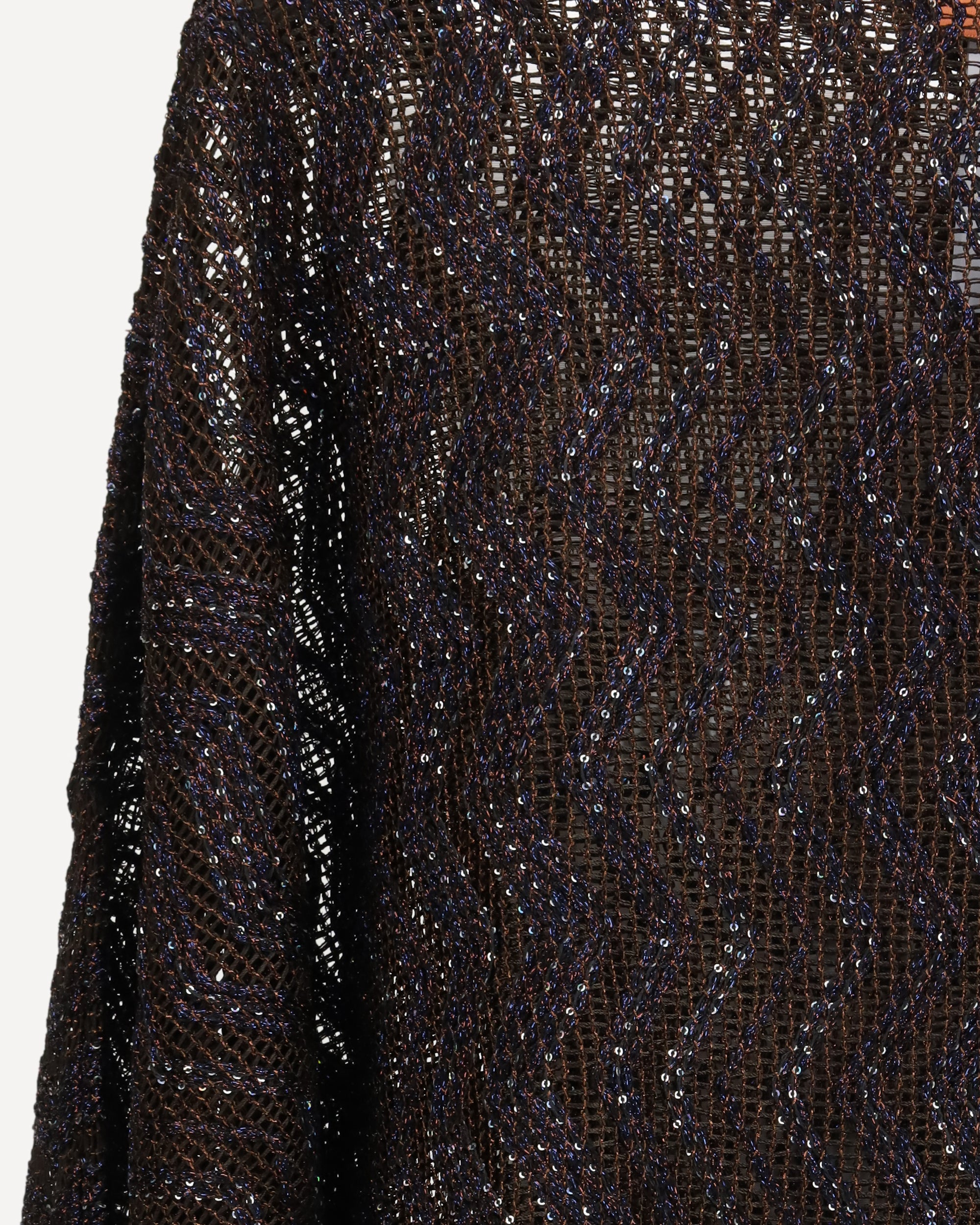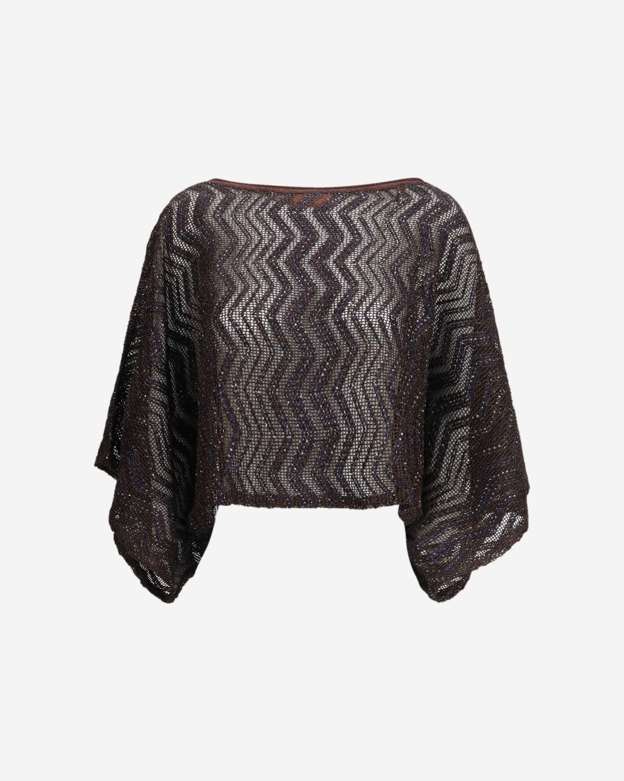 Il Top a rete in viscosa di Missoni, animato dall’iconico motivo zig zag e impreziosito da applicazioni di paillettes che catturano la luce con movimenti delicati. Le maniche ampie amplificano la leggerezza della silhouette, creando un equilibrio tra femminilità eterea e sofisticata artigianalità. Un capo luminoso e versatile, perfetto per completare look da sera o mise da resort dall’allure contemporanea.