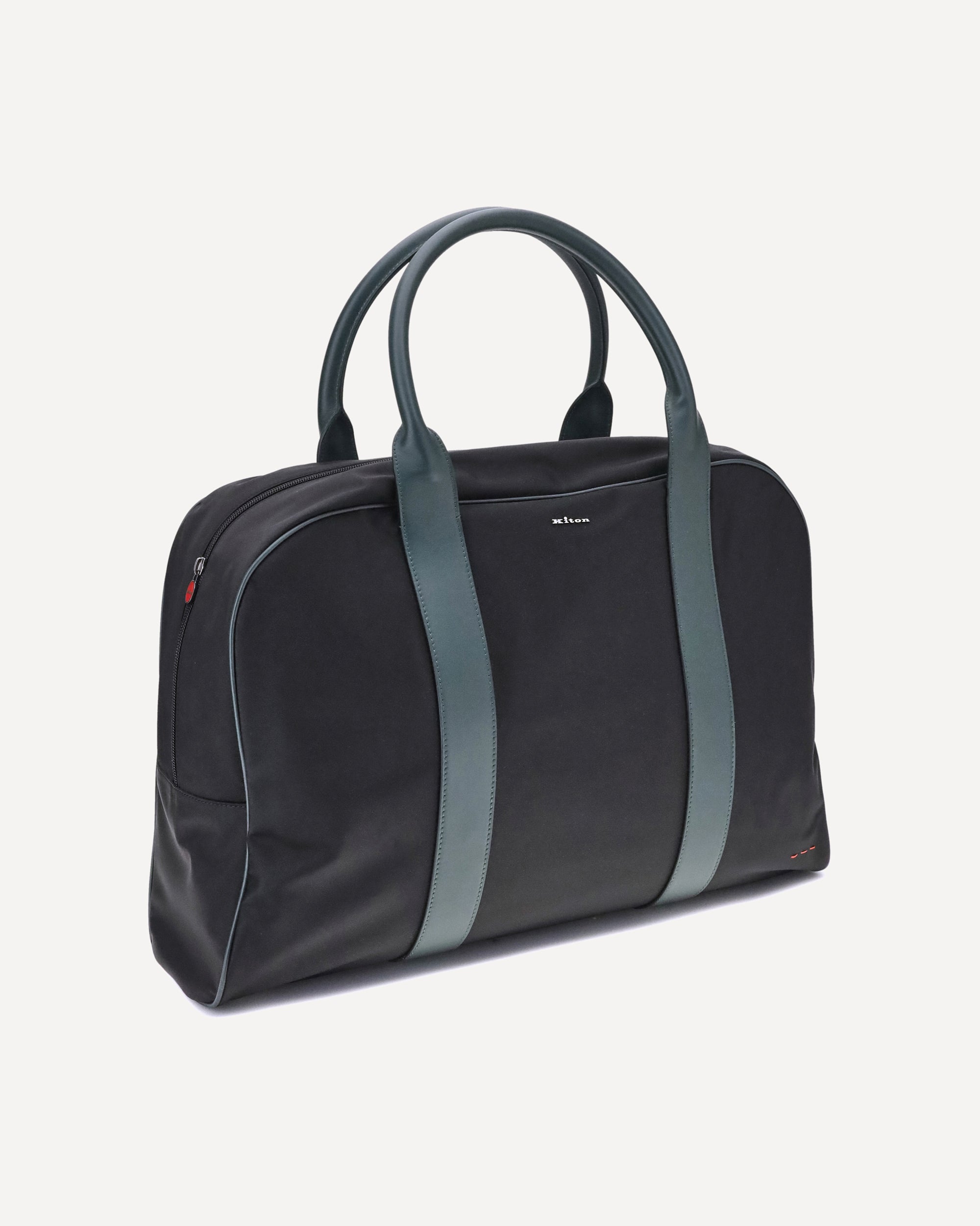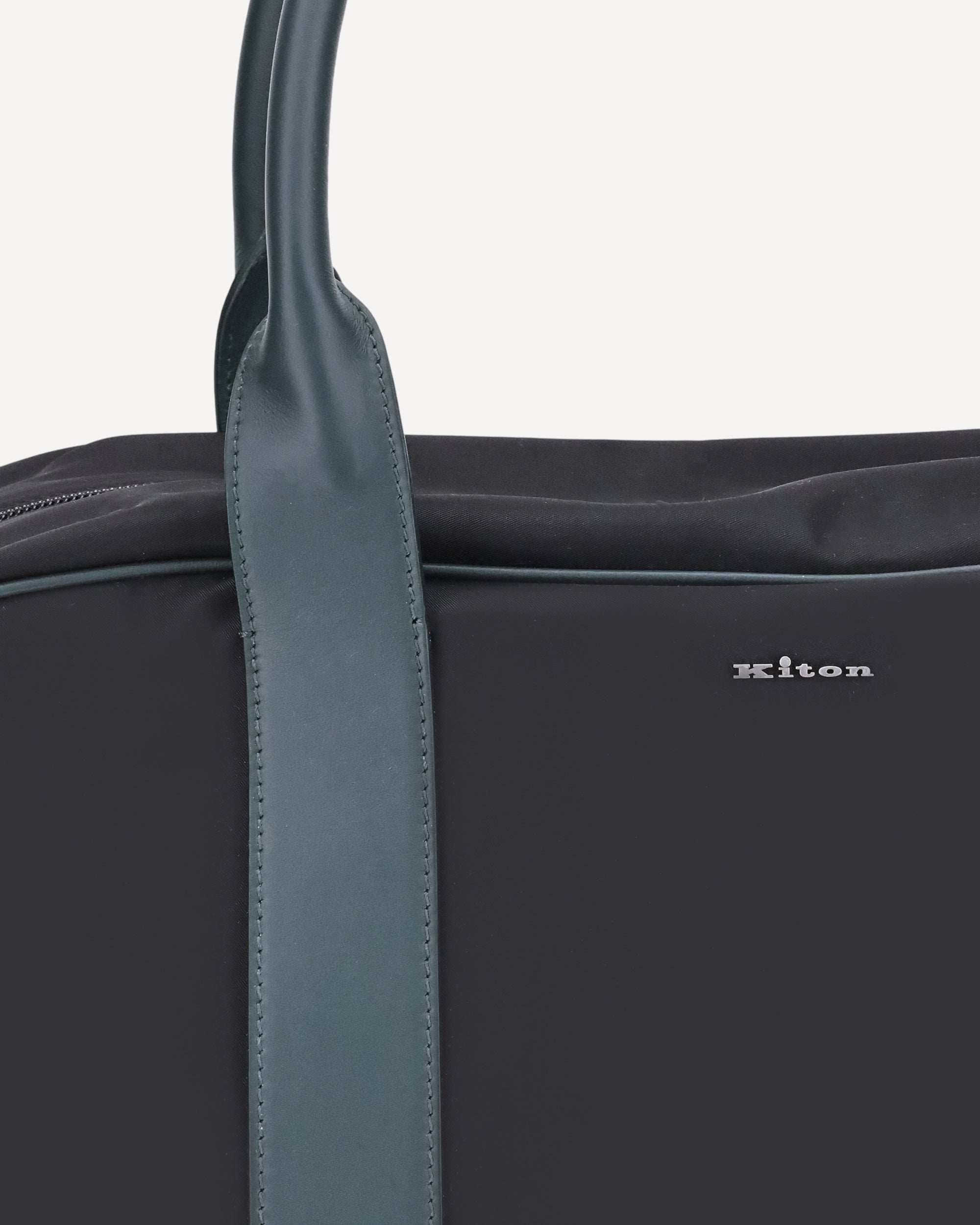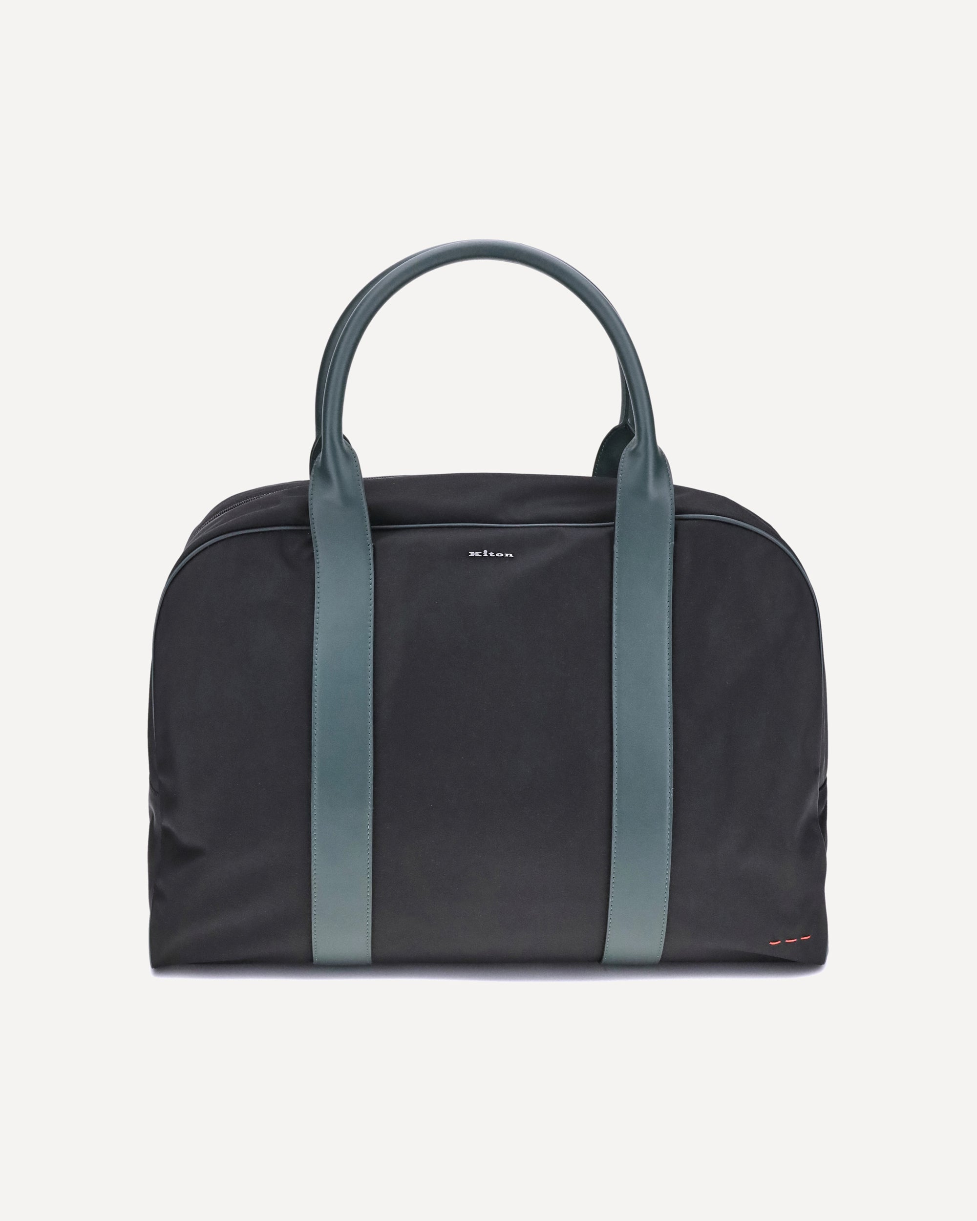 Borsa da viaggio in nylon di Kiton con due manici tubolari superiori in pelle, che si estendono sui pannelli frontale e posteriore per un design elegante e robusto. Sul fronte spicca l’iconico monogramma del brand. La chiusura superiore con cerniera garantisce sicurezza, mentre l’unico ampio scomparto interno offre spazio funzionale per tutti gli essentials di viaggio.