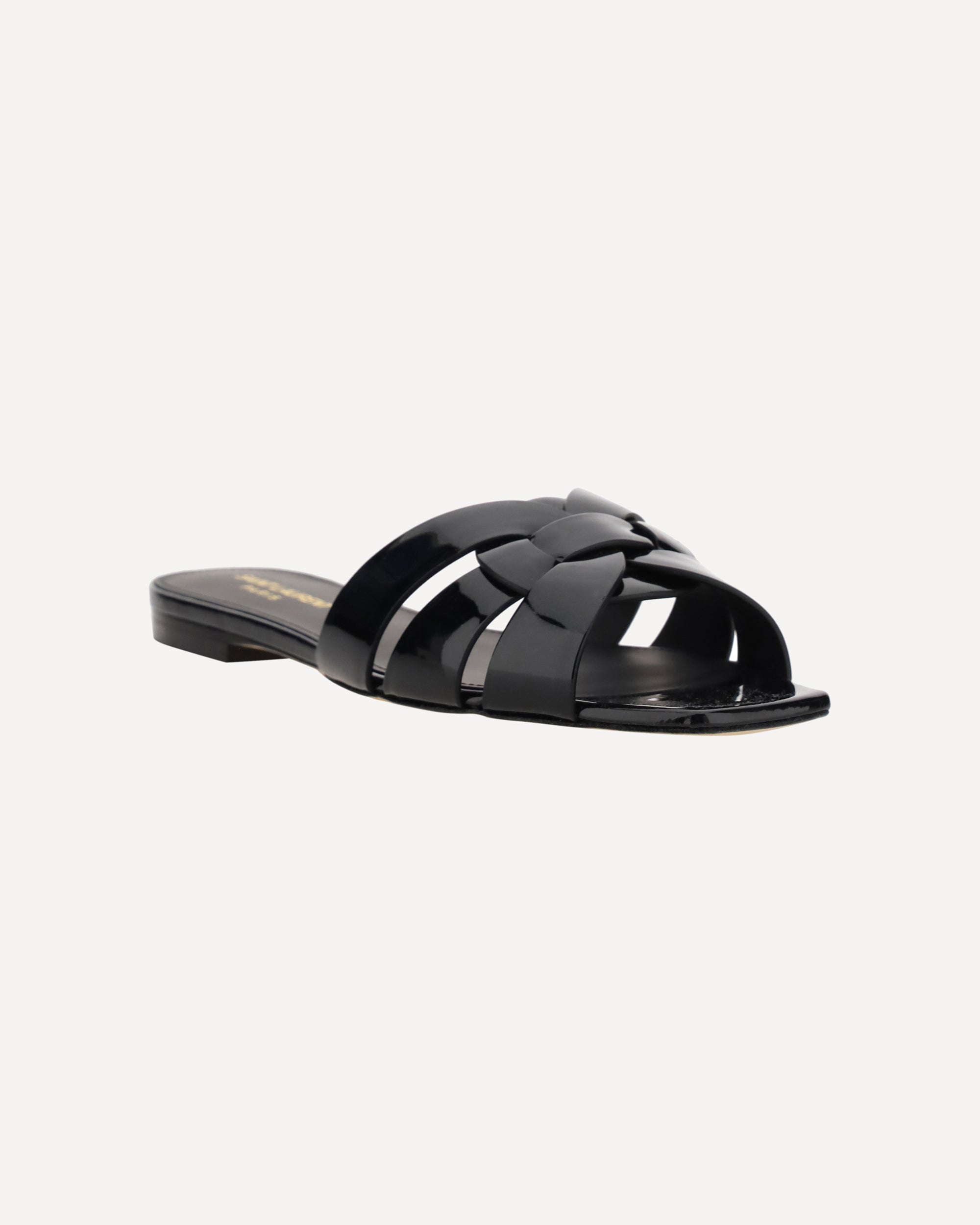 Sandali Tribute in Pelle di Saint Laurent, punta quadrata, suola piatta, intreccio sul fronte, soletta logata.