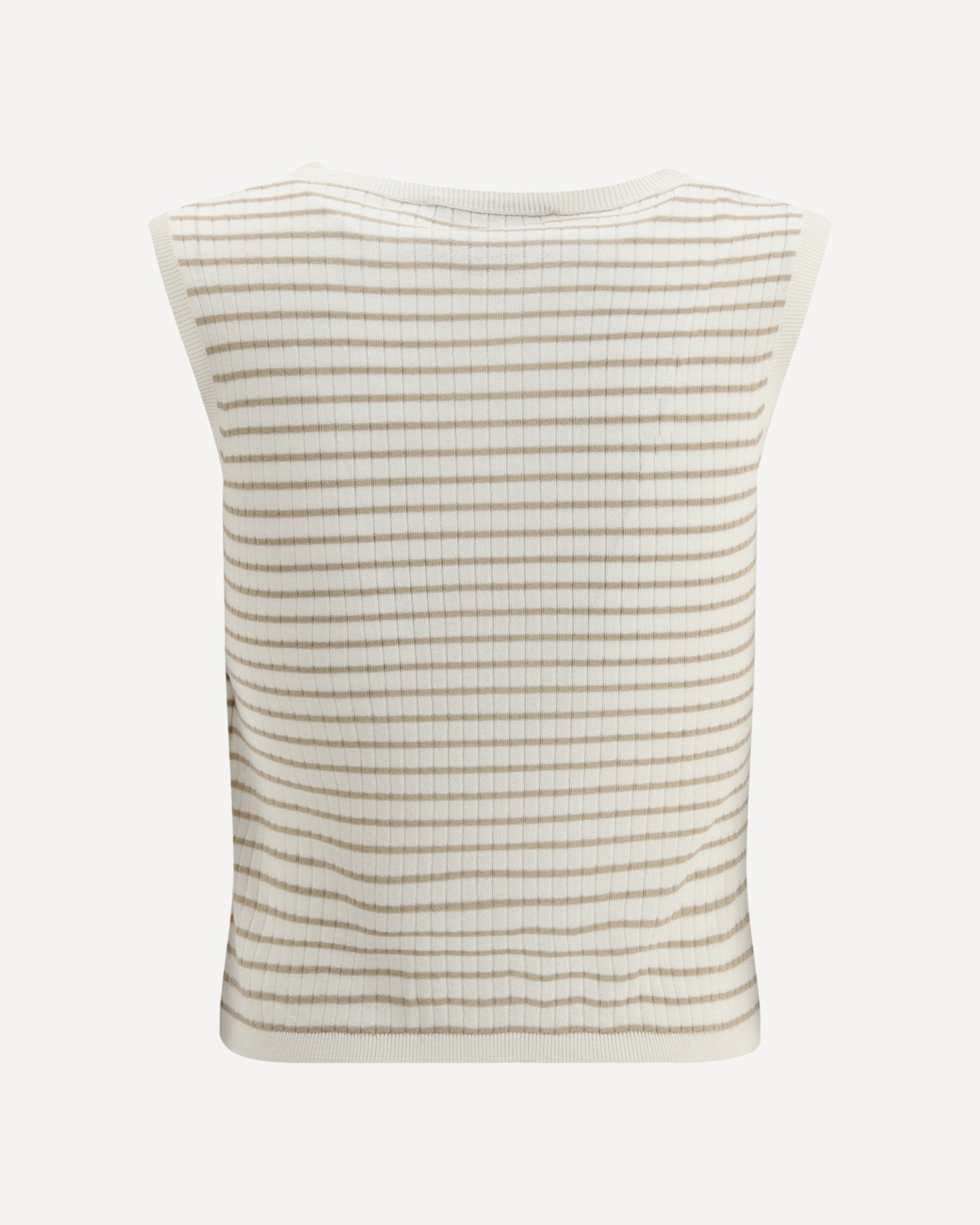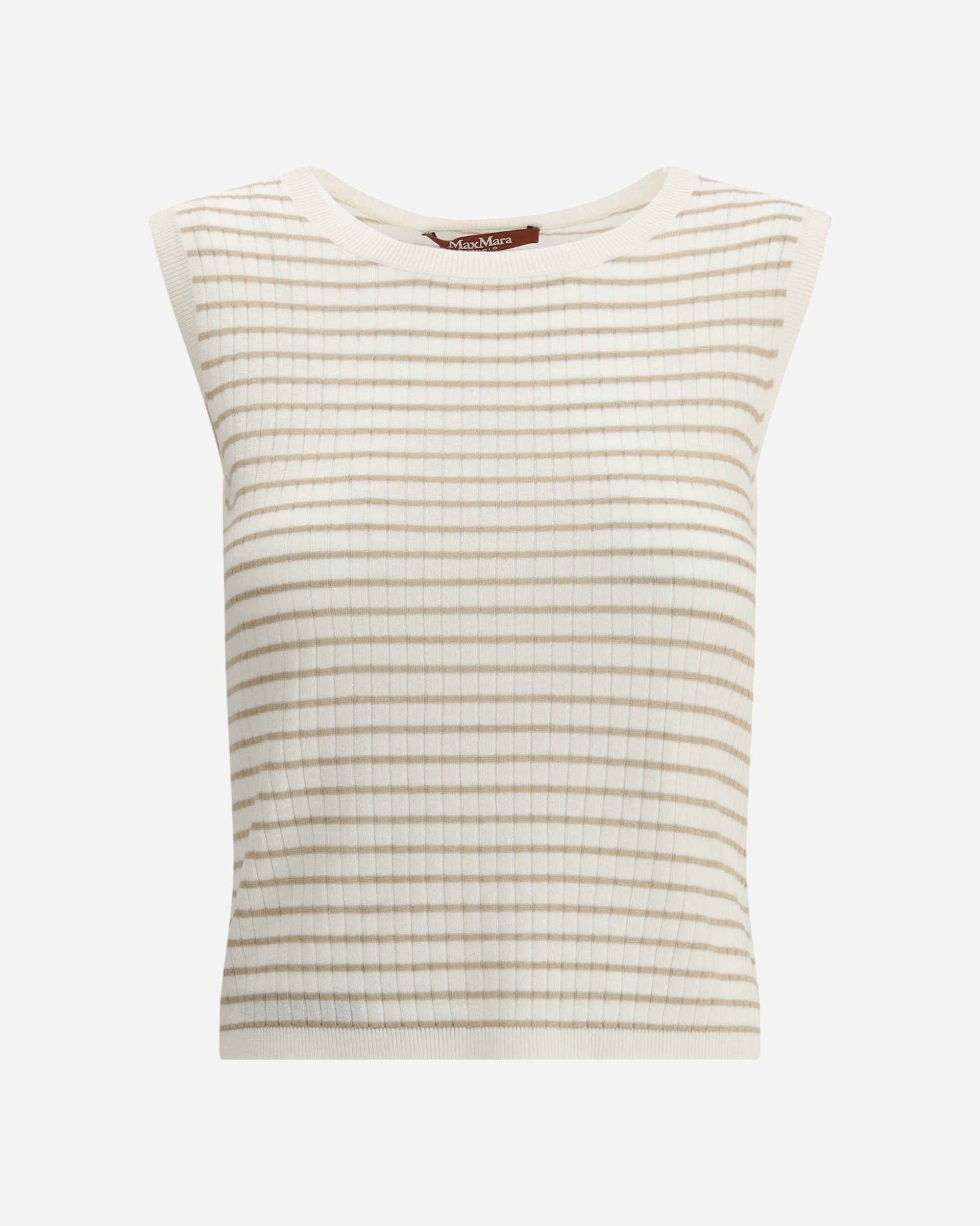 Il Top Valeria di Max Mara Studio è un capo elegante e sofisticato, perfetto per un look moderno e raffinato. Il modello smanicato e il girocollo a costine creano una silhouette pulita e definita, mentre l'orlo a costine aggiunge un dettaglio di stile discreto. Il design a coste, insieme alla fantasia a righe, dona texture e movimento al top, conferendo un tocco dinamico e chic.