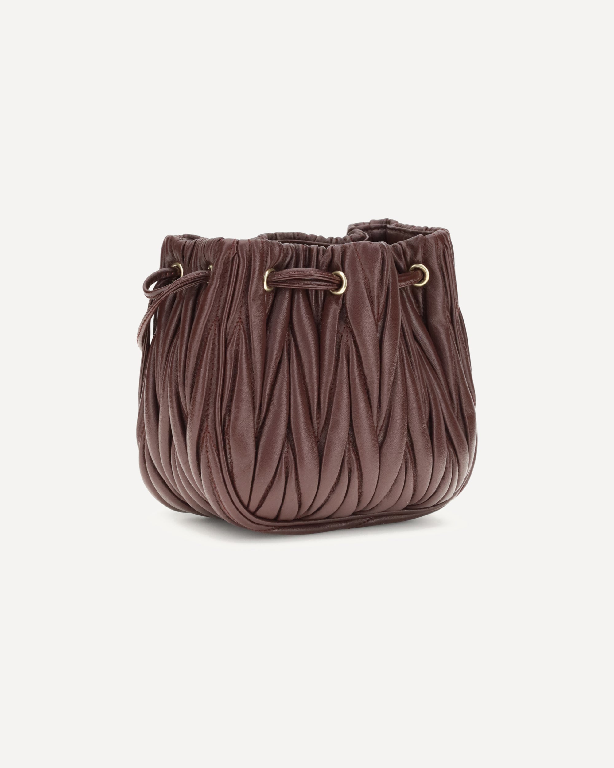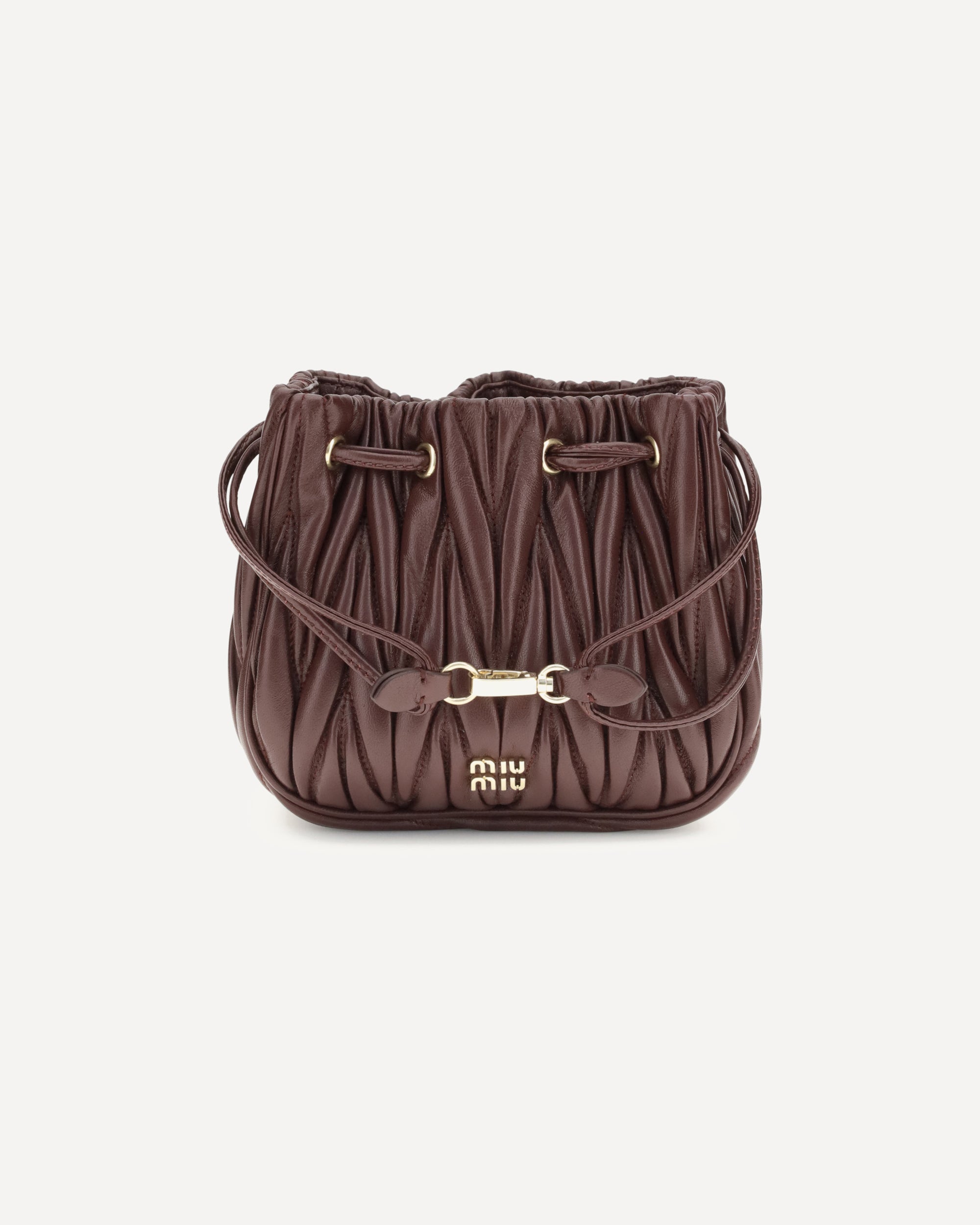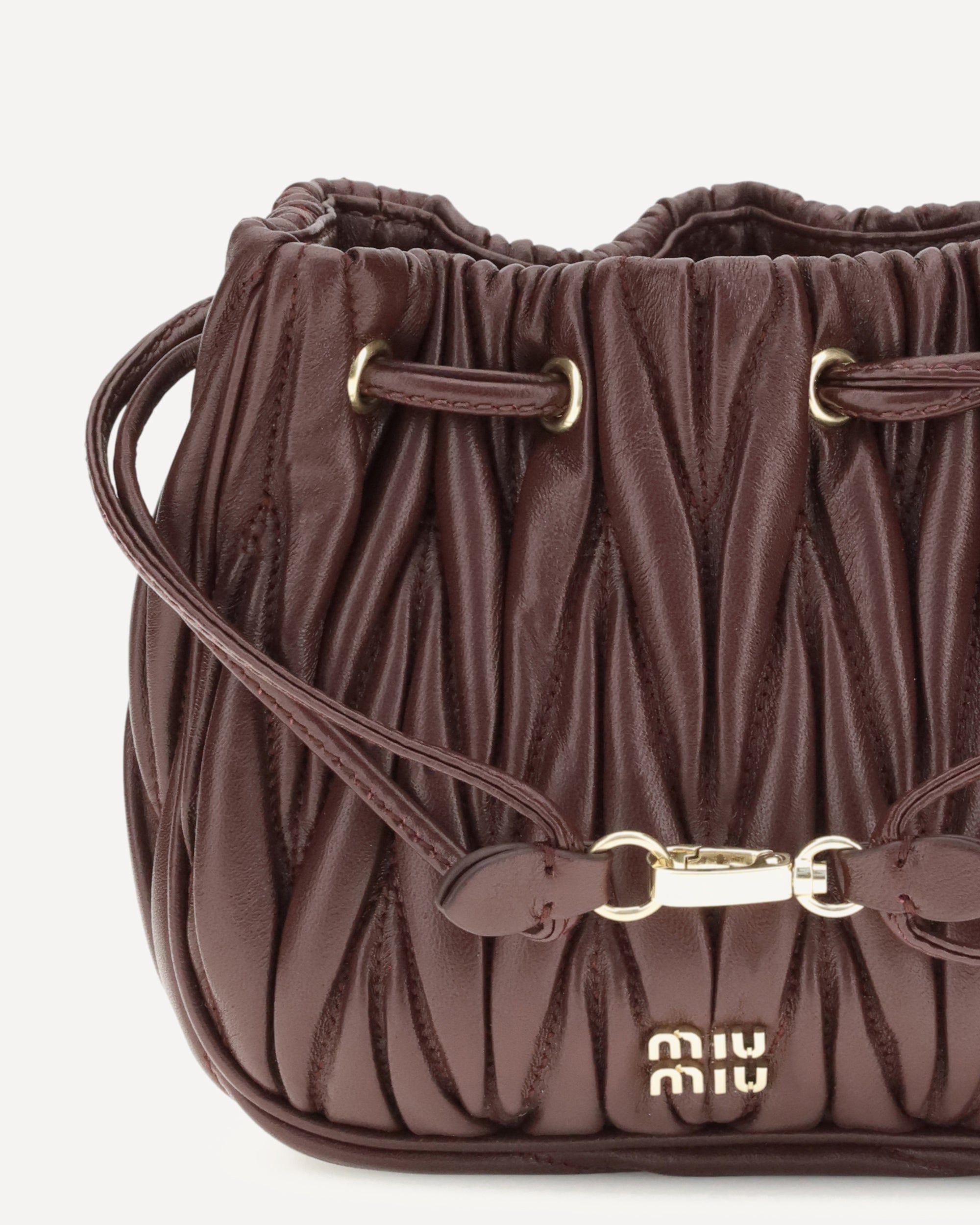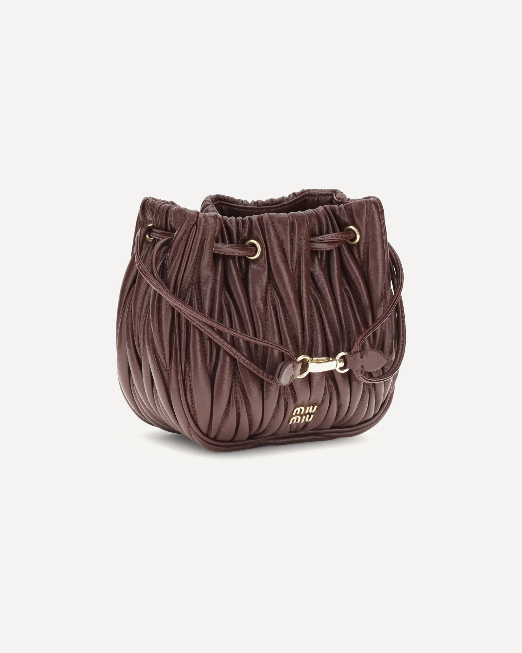 La Pouch in nappa matelassé di Miu Miu reinterpreta un’icona del brand in chiave pratica e raffinata. La caratteristica lavorazione matelassé dona texture e profondità al design compatto, mentre la chiusura con coulisse aggiunge un tocco funzionale e femminile. Completano il modello le finiture curate e il logo in metallo, firma discreta ma distintiva dello stile Miu Miu.