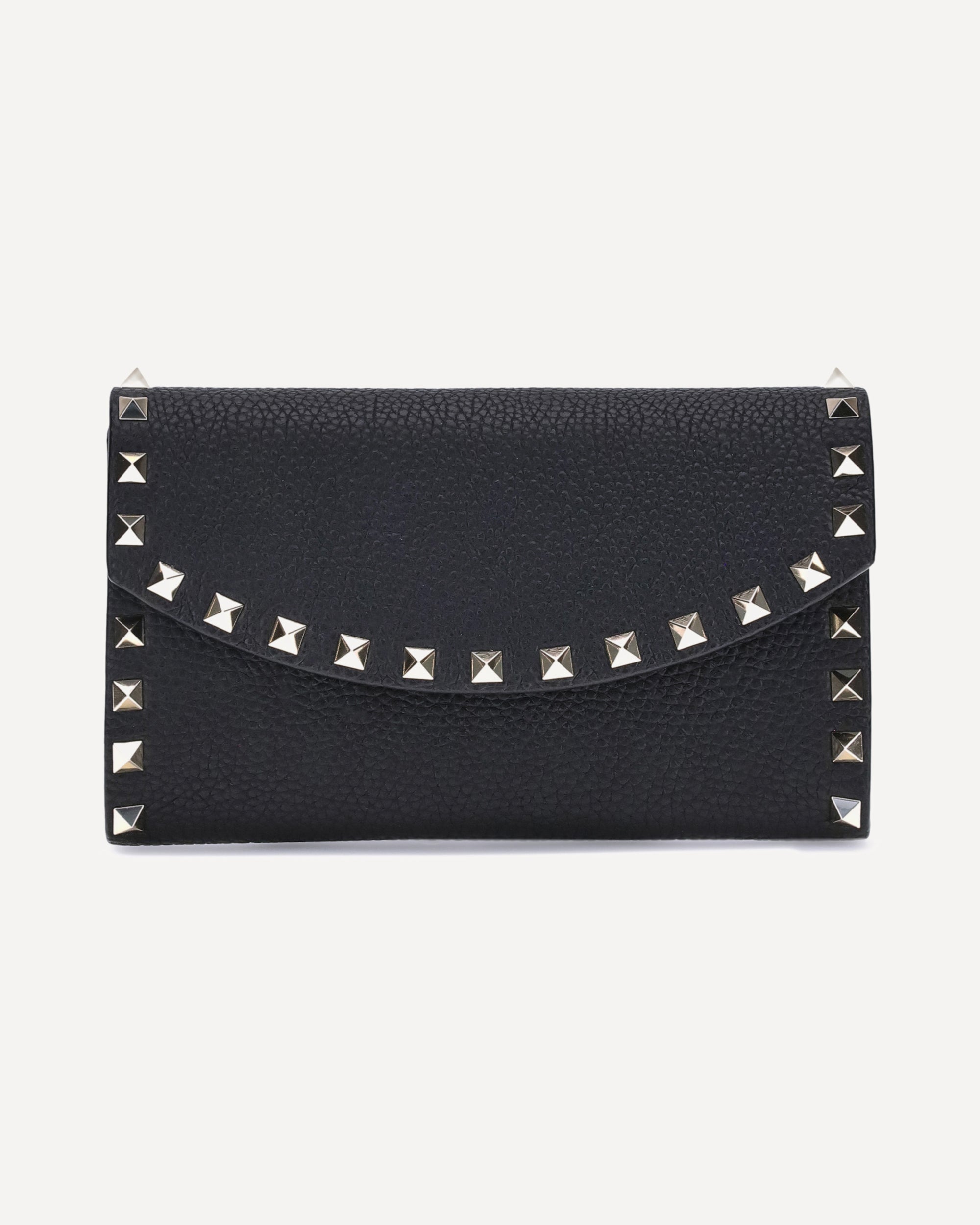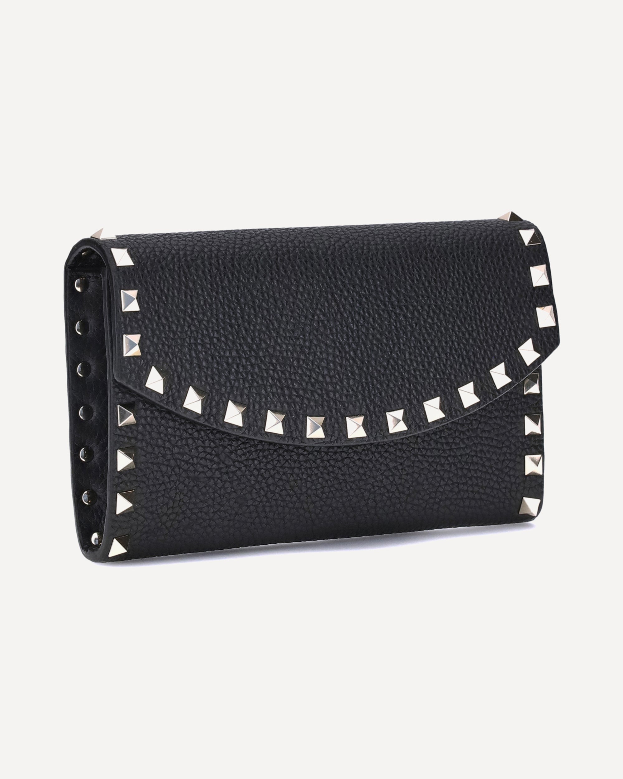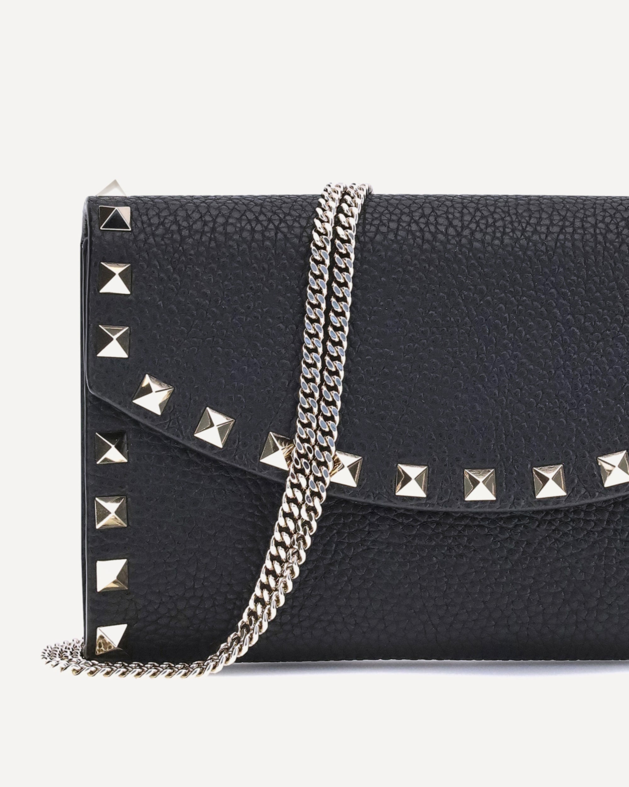 Portafoglio in pelle martellata di Valentino Garavani con tracolla a catena removibile per una doppia modalità di utilizzo. Presenta chiusura frontale con patta magnetica e iconiche borchie Rockstud applicate sul perimetro per un design grintoso ed elegante. All’interno, un unico scomparto con slot portacarte per organizzare al meglio i tuoi oggetti essenziali.