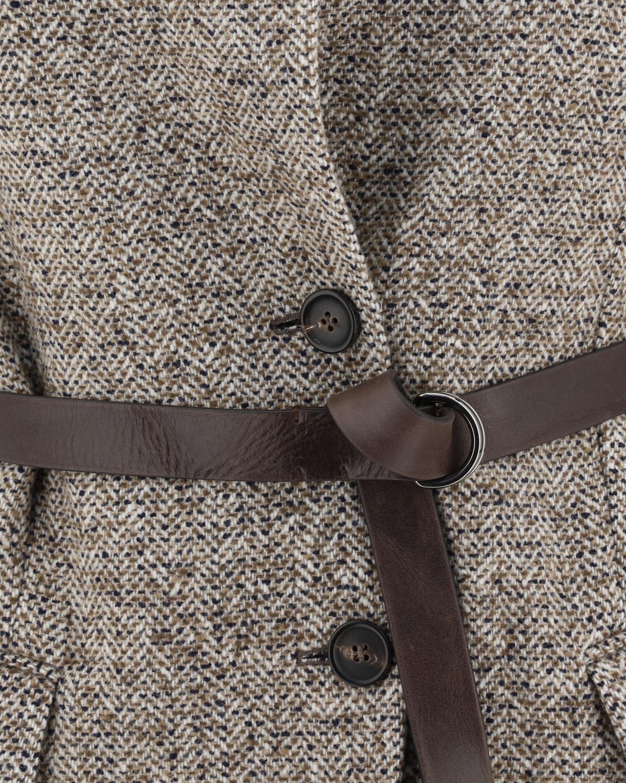 Il Gilet in lana di Brunello Cucinelli è un capo elegante e versatile, con chiusura frontale a bottoni e revers a lancia. Le due tasche frontali a fileto con pattina aggiungono un tocco di classe, mentre la cintura in pelle abbinata, regolabile e removibile, permette di personalizzare la vestibilità. La fantasia spigata completa il design, rendendolo perfetto per occasioni formali e casual.