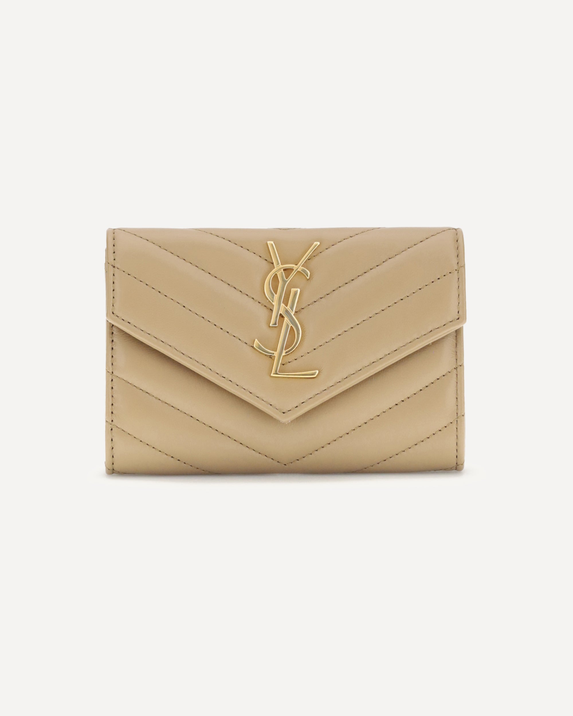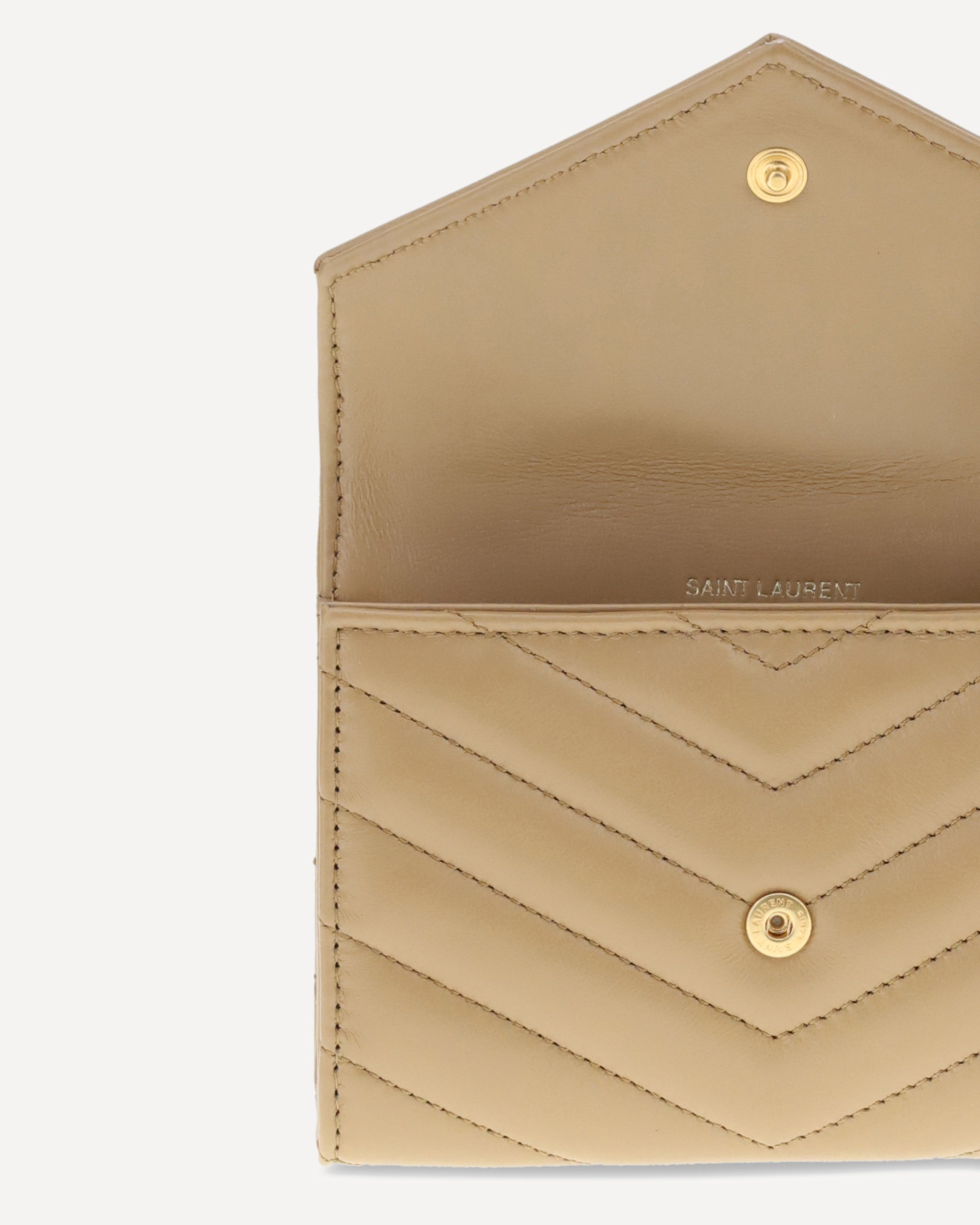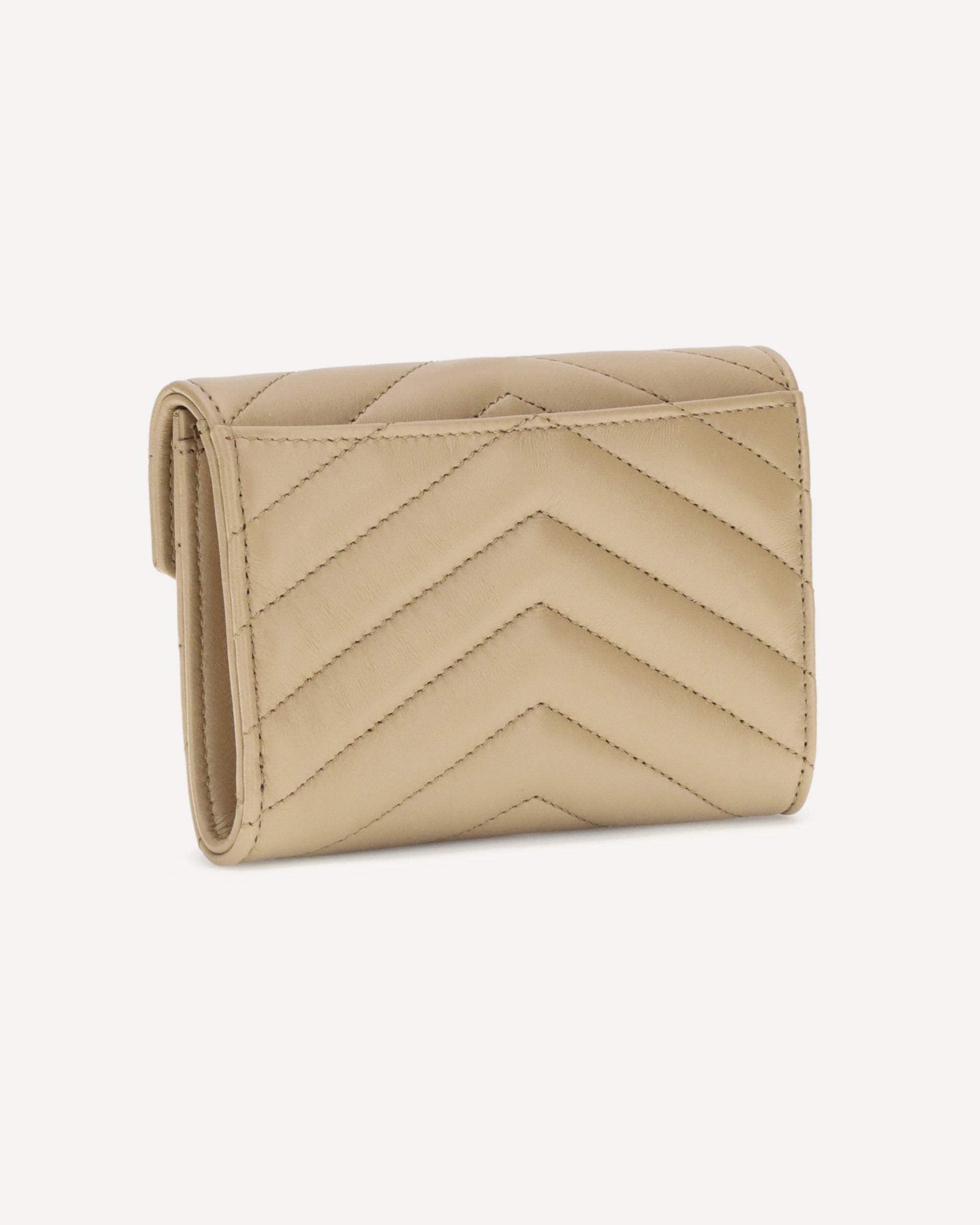 Il Portafogli Cassandre in pelle di Saint Laurent unisce eleganza e funzionalità con un design matelassé trapuntato e la pattina frontale con chiusura magnetica. Impreziosito dall’iconico logo YSL tridimensionale in metallo, presenta all’interno uno scomparto portamonete, slot portacarte e spazi dedicati alle banconote. Completa il modello una tasca a filetto sul retro, per un tocco di praticità in più.