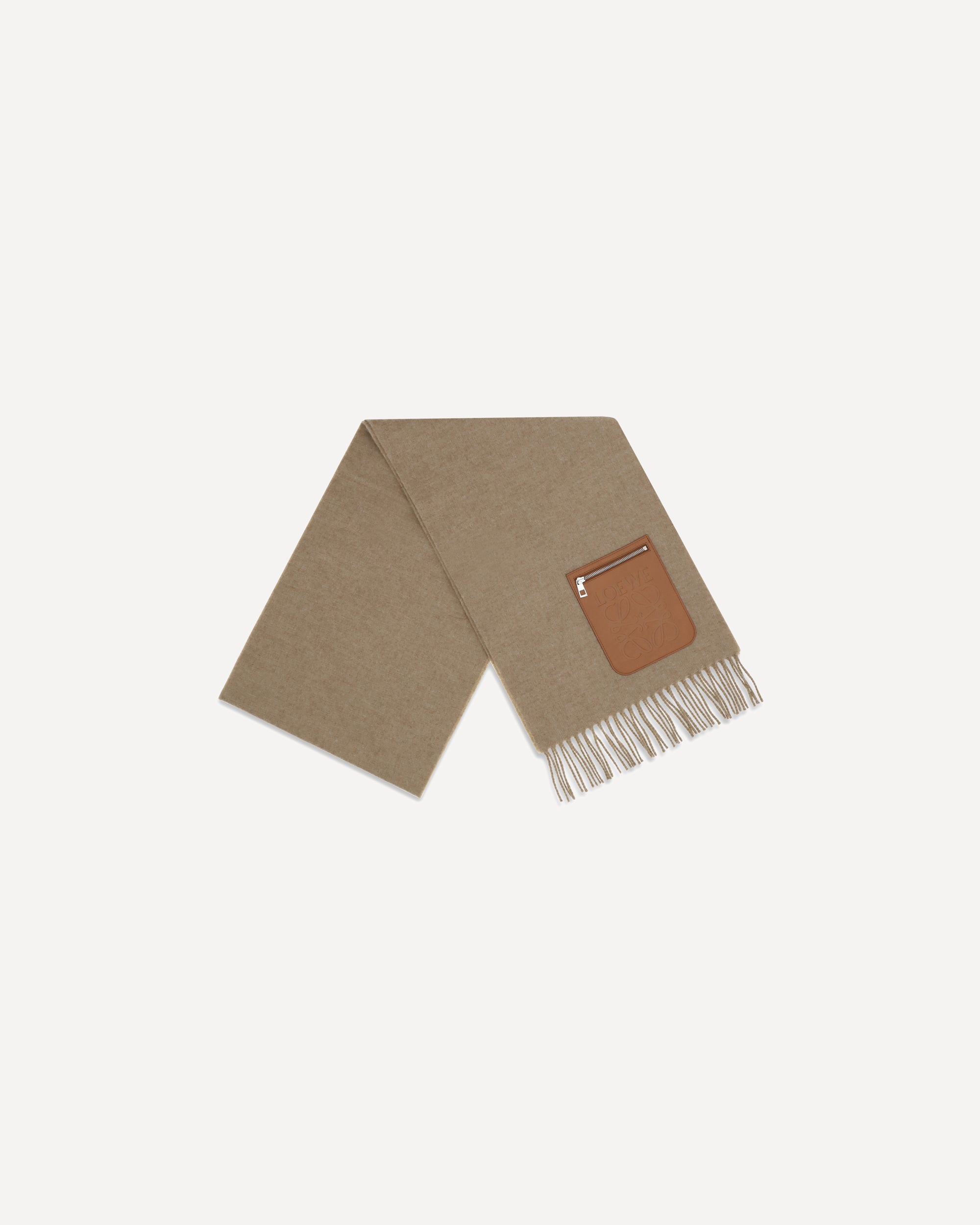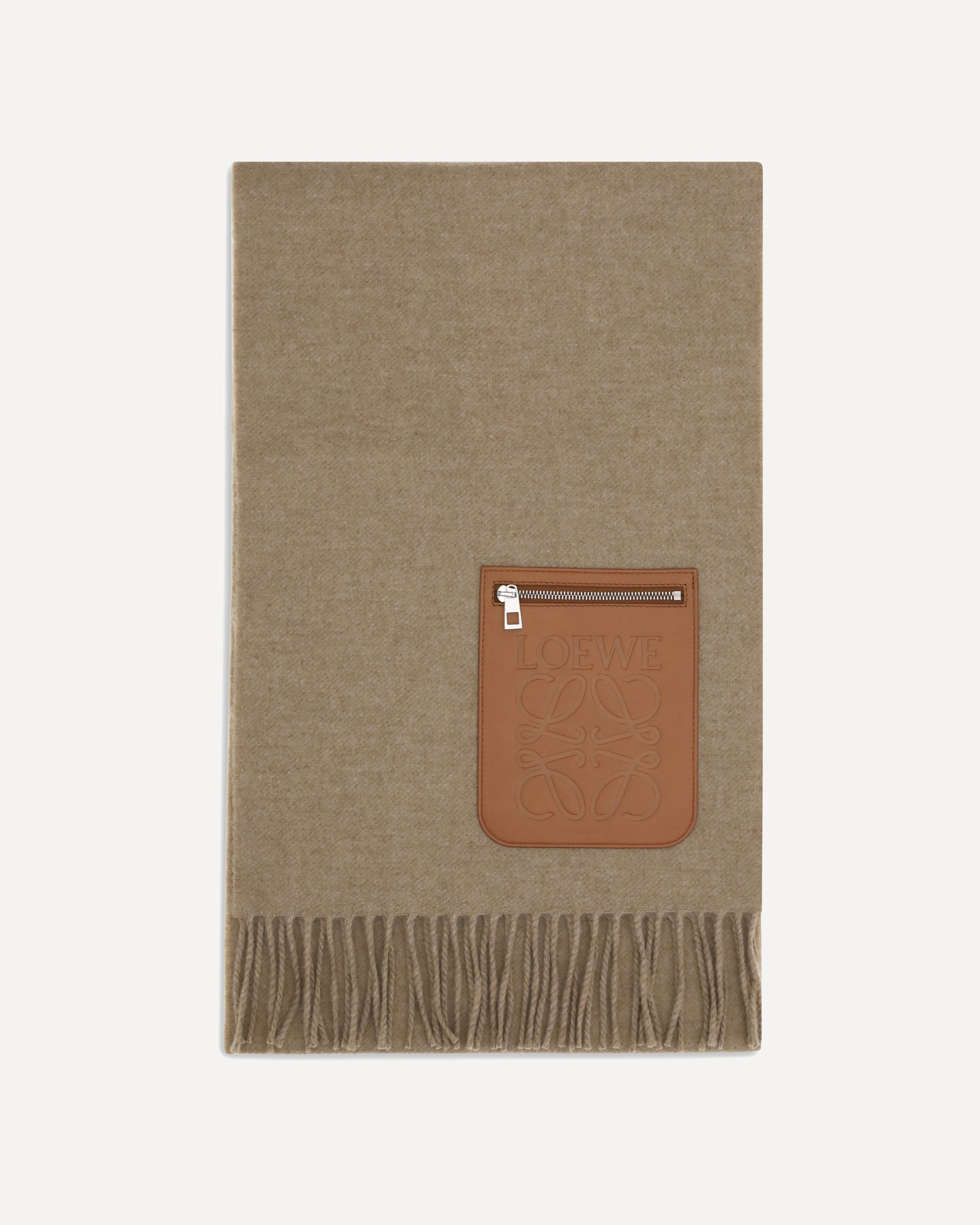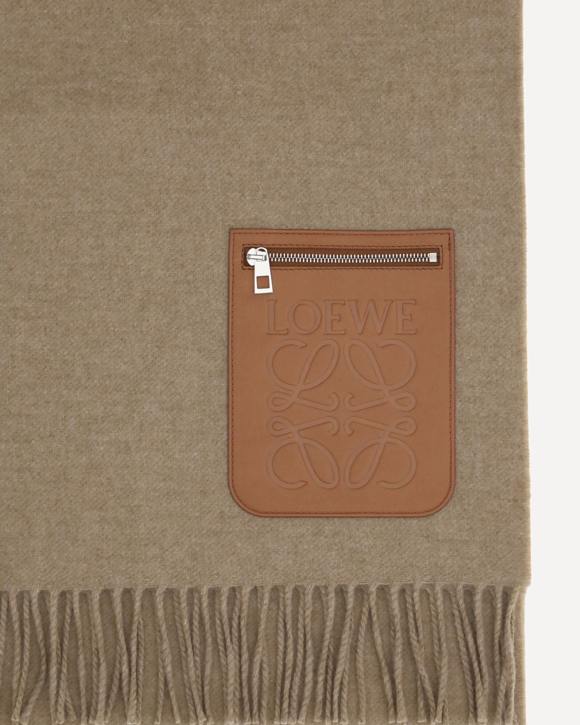 Sciarpa in lana e cashmere di Loewe, realizzata con un mix leggero e morbido di cashmere e lana. Presenta una pratica tasca applicata in pelle con zip e il motivo Anagram goffrato a impreziosire il design. Misura 28x180 cm e ha bordi sfrangiati per un tocco di stile sofisticato.