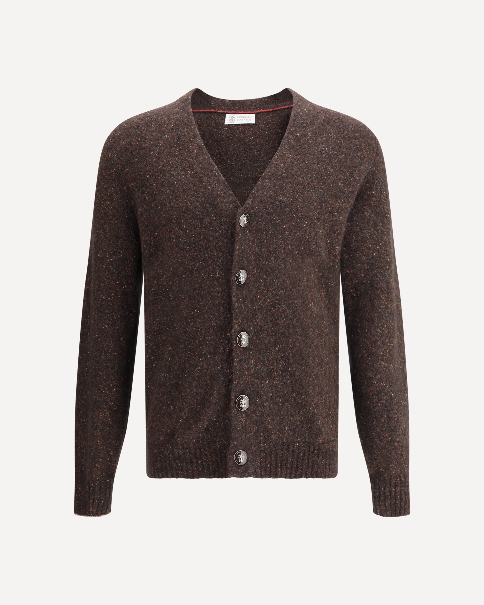 Il Cardigan in alpaca di Brunello Cucinelli è un capo elegante e caldo, con uno scollo a V sul fronte che aggiunge un tocco sofisticato. La chiusura con bottoni groffati sul fronte conferisce un dettaglio distintivo. L'orlo a costine e i polsini a costine garantiscono una vestibilità aderente e confortevole. La fantasia mélange dona al cardigan un aspetto moderno e raffinato, ideale per un look casual-chic.