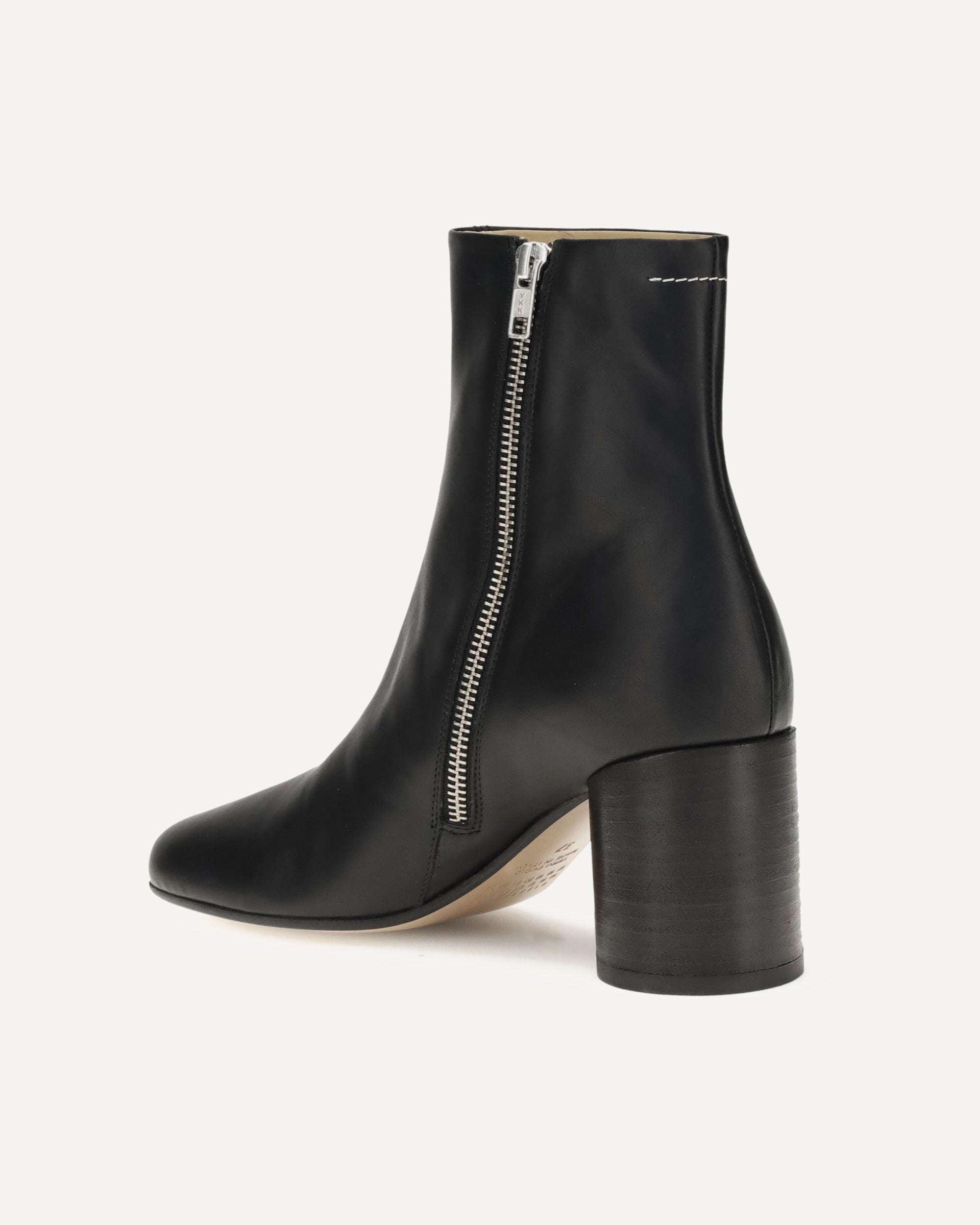 Gli Stivaletti anatomici di MM6 in morbida nappa uniscono comfort e ricercatezza. Il tacco curvo tono su tono dona un tocco scultoreo al design essenziale, mentre la zip interna garantisce praticità. Sul retro, la linea bianca cucita firma con discrezione l’inconfondibile stile MM6.