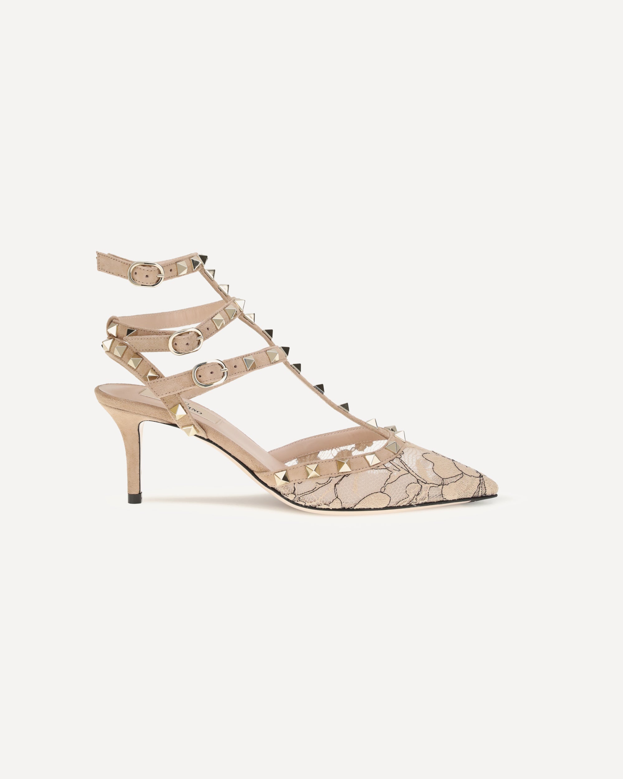 Le Décolleté Rockstud di Valentino Garavani sono realizzate in raffinato pizzo, con cinturini e profili in camoscio. Le iconiche borchie con finitura platino e i cinturini regolabili aggiungono un tocco deciso a un design elegante e femminile.