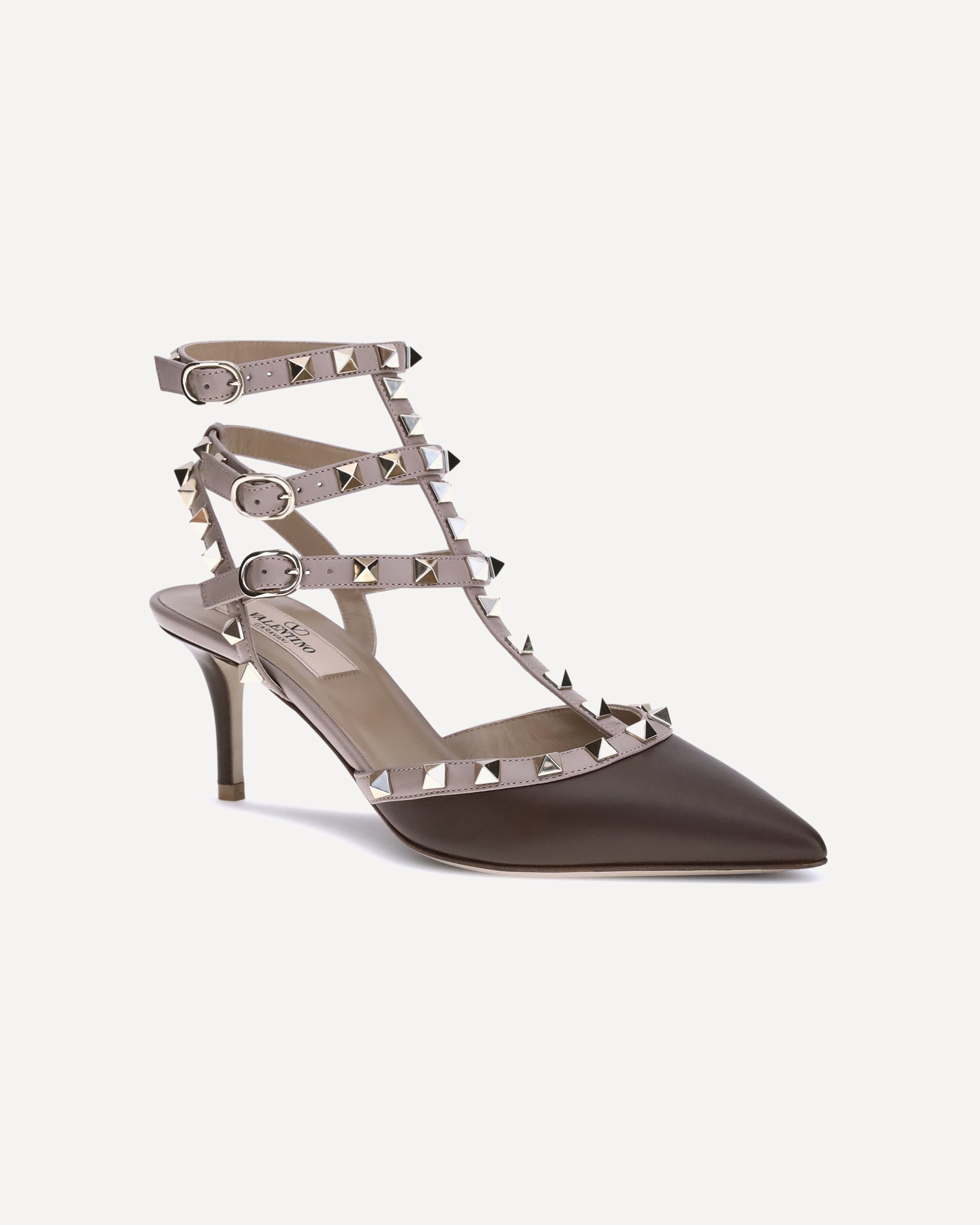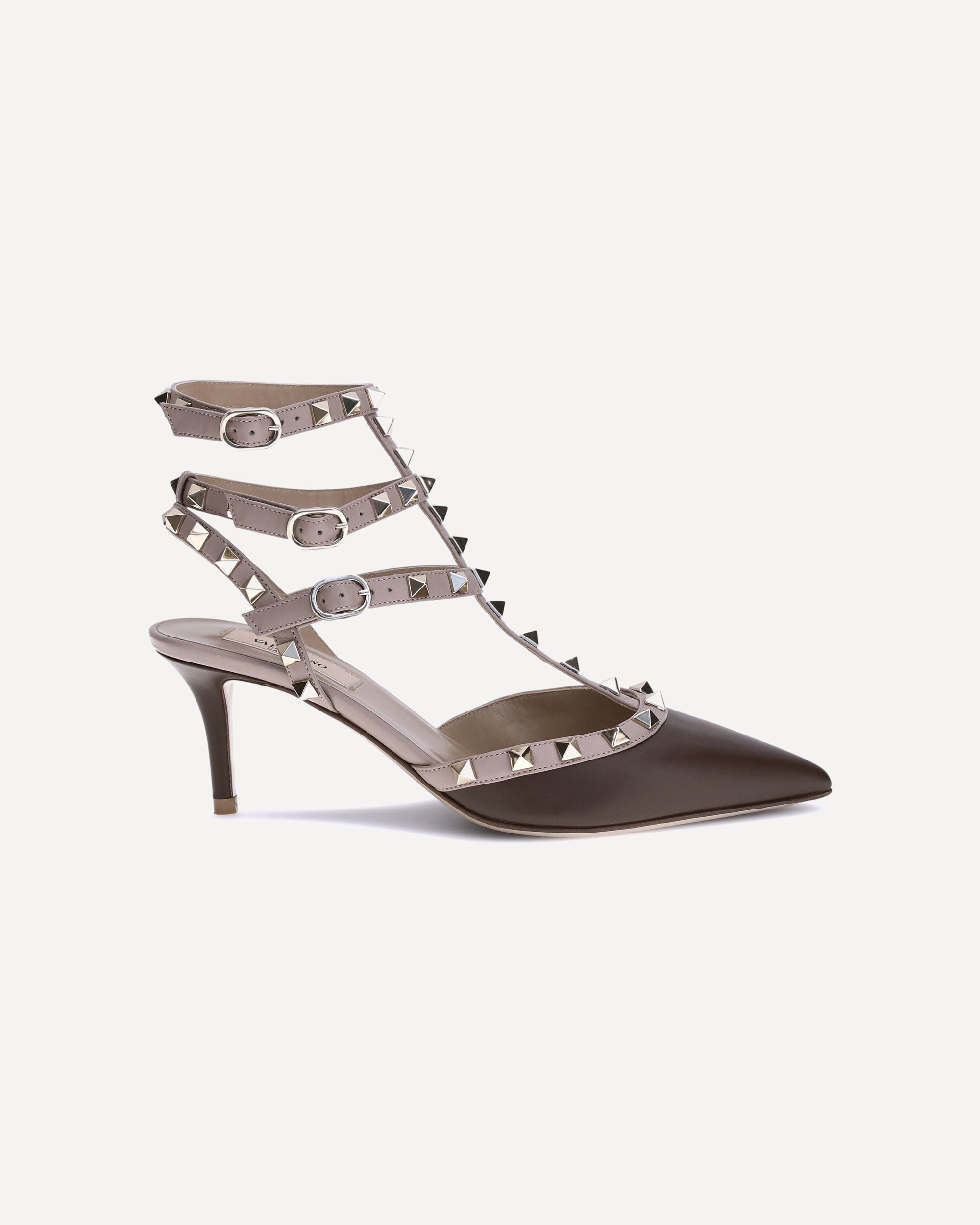 Le Décolleté Rockstud in pelle di Valentino Garavani esprimono un’eleganza audace e sofisticata. Caratterizzate da una punta geometrica allungata, presentano un cinturino alla caviglia con tripla fibbia laterale per una calzata sicura e femminile. Il tacco a stiletto in cuoio slancia la silhouette, mentre le iconiche borchie applicate all-over donano al modello un carattere distintivo e grintoso. Completano il design la soletta logata e la cura artigianale tipica della maison.