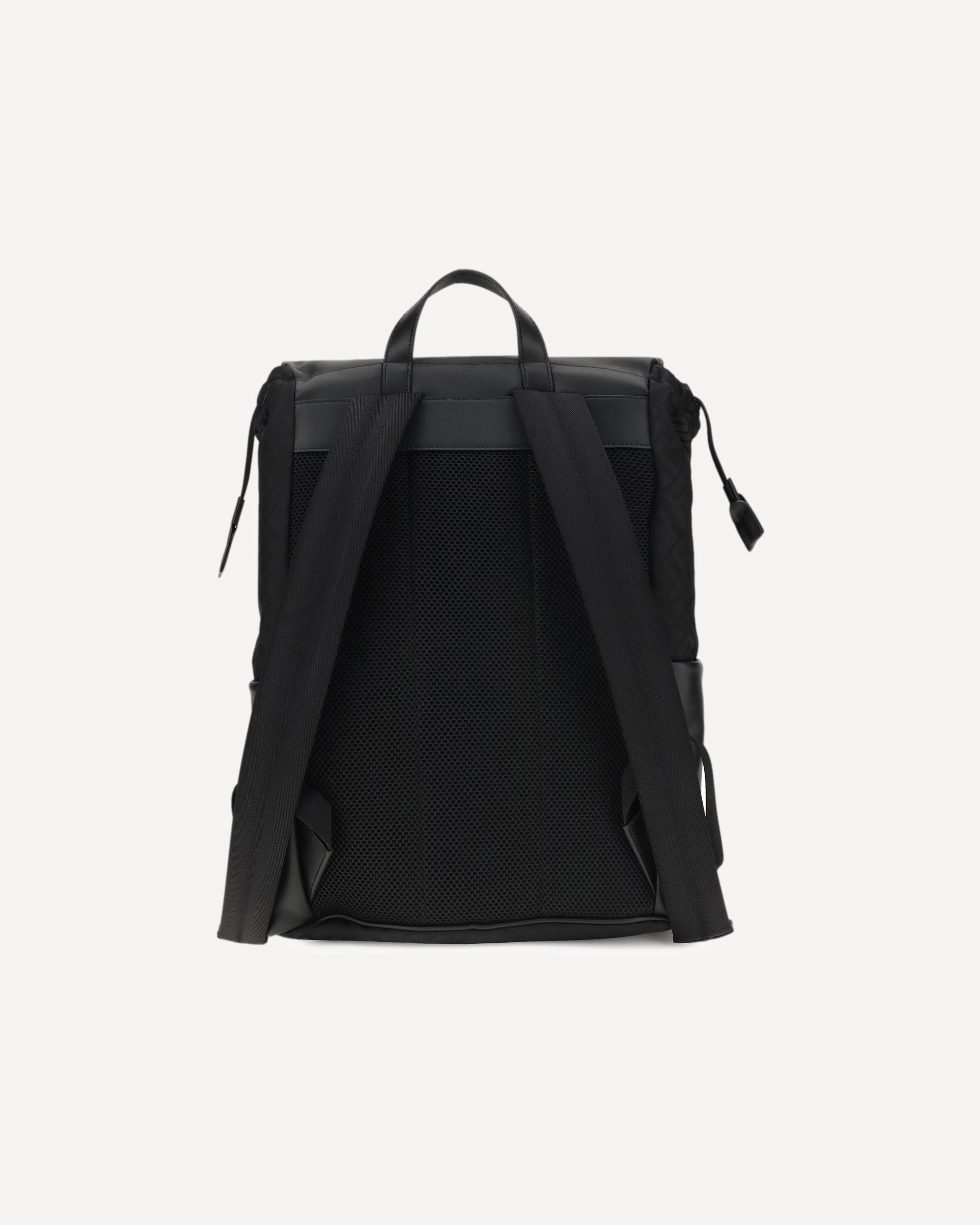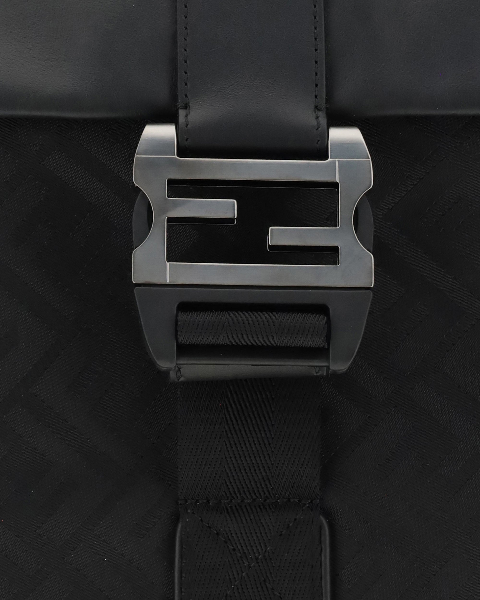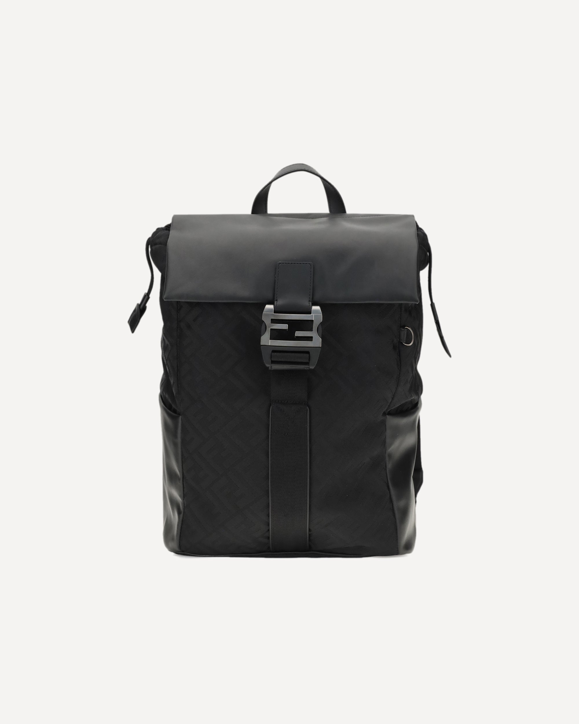 Lo Zaino Flux in nylon di Fendi è un accessorio dallo stile deciso e contemporaneo, impreziosito dal ricamo FF all-over e da una fibbia frontale in metallo con logo FF. Realizzato in nylon con inserti in pelle di vitello liscia, presenta un manico in pelle tonale, spallacci regolabili in tessuto e chiusura a coulisse con fibbia di sicurezza. Completano il design due tasche laterali applicate e un interno foderato, dotato di una tasca con zip e una tasca aperta per una perfetta organizzazione.