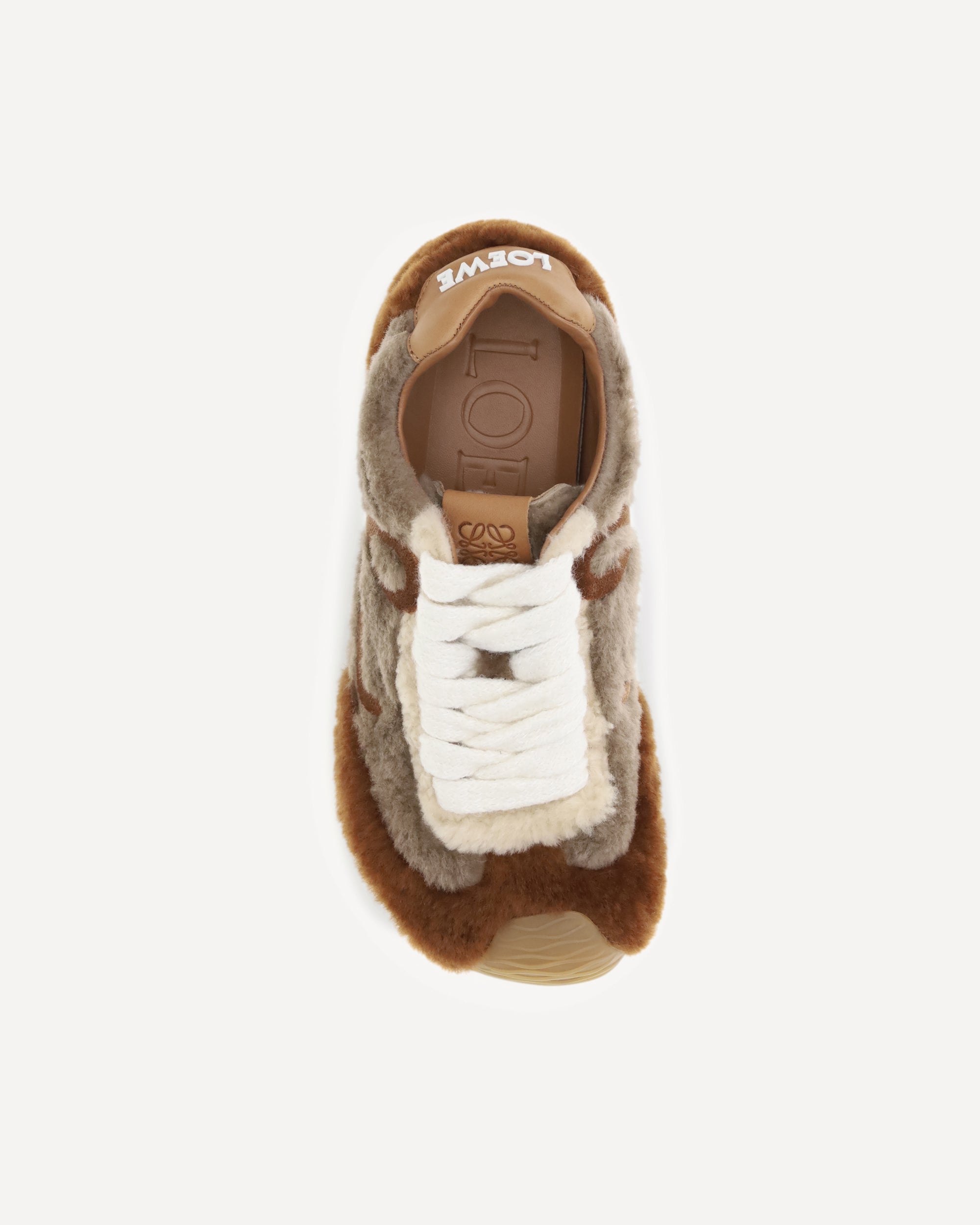 Le Sneakers Ballet Runner 2.0 in shearling di Loewe combinano il comfort di una calzatura tecnica con l’estetica sofisticata del brand. Realizzate in morbido shearling, si distinguono per la punta arrotondata asimmetrica e la struttura interna stile calzino, che garantisce una calzata aderente e confortevole. La suola in gomma leggera si estende fino alla punta, aggiungendo un tocco moderno e funzionale. Completano il design i dettagli iconici: il monogramma “L” sul lato, l’Anagram goffrato sulla linguetta e la scritta LOEWE in gomma iniettata sul tallone.