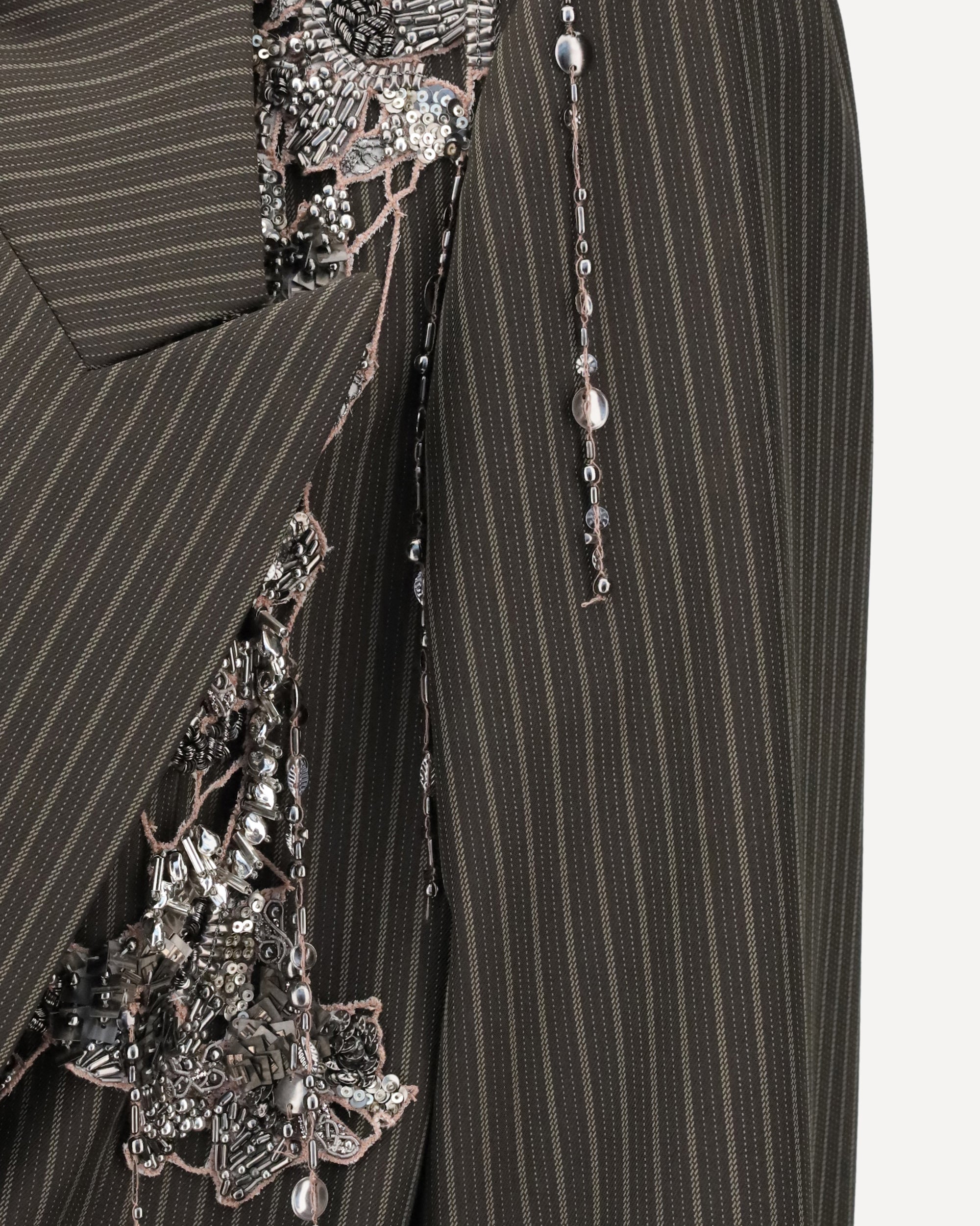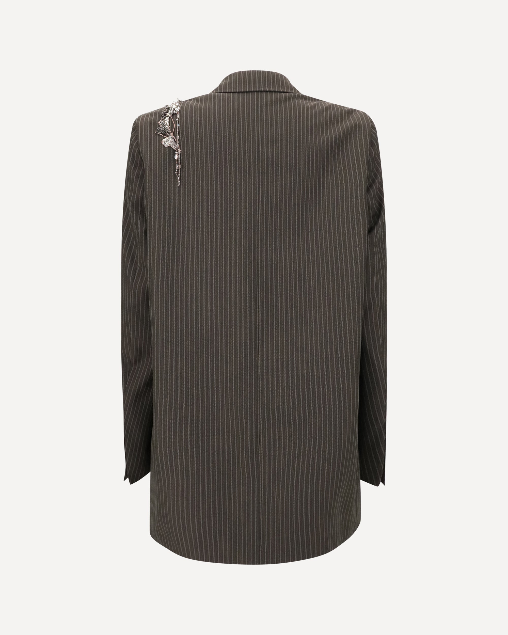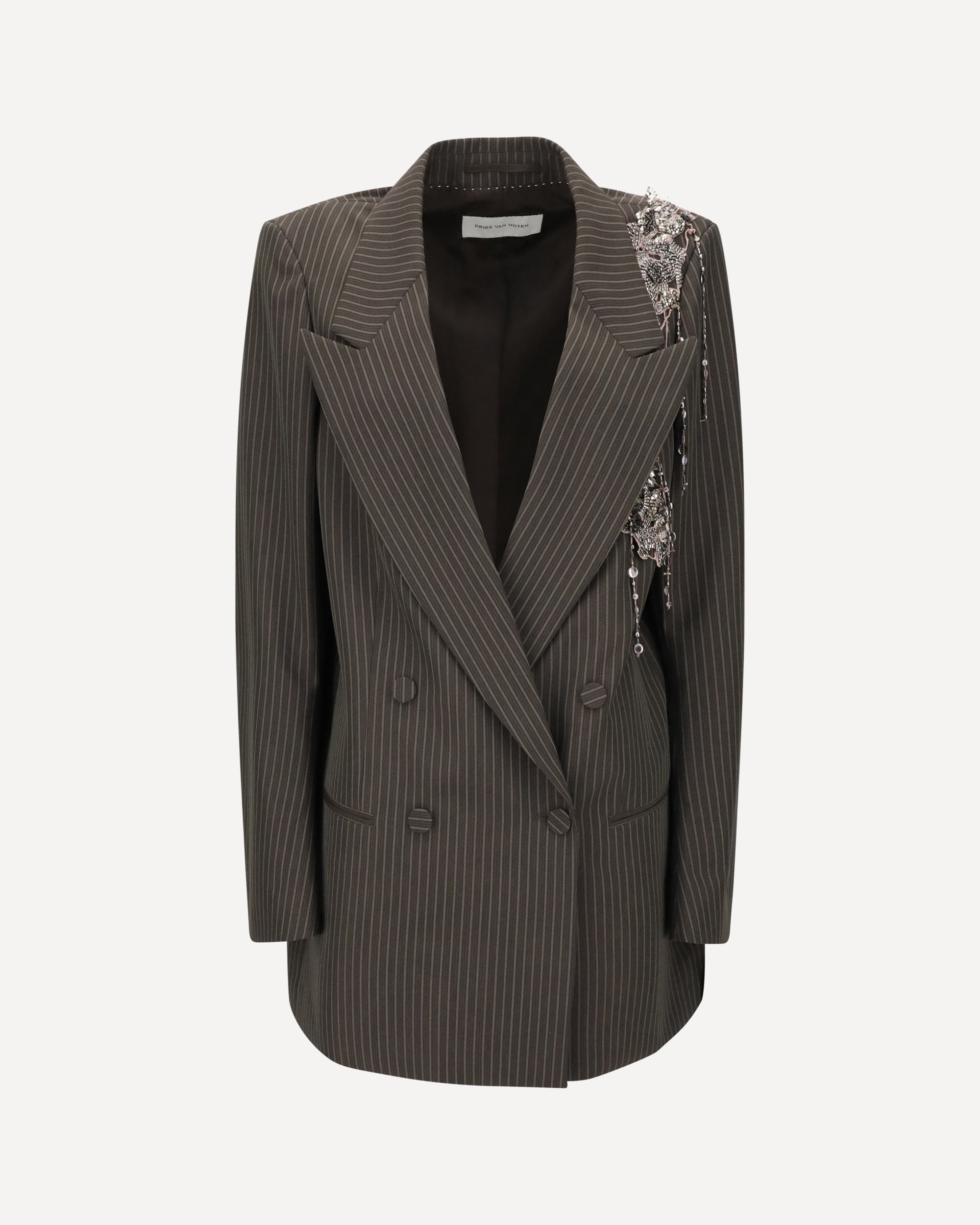 Il Blazer a righe con perline di Dries Van Noten è un capo che fonde sapientemente eleganza classica e dettagli moderni. Il design presenta revers a lancia e una chiusura doppiopetto con bottoni, creando una silhouette sofisticata e definita. Il dettaglio della toppa con perline sul fronte aggiunge un tocco di lusso discreto e originale, rendendo il blazer perfetto per chi cerca uno stile distintivo e ricercato. Un capo versatile, che unisce il fascino senza tempo delle righe con un’eleganza contemporanea.