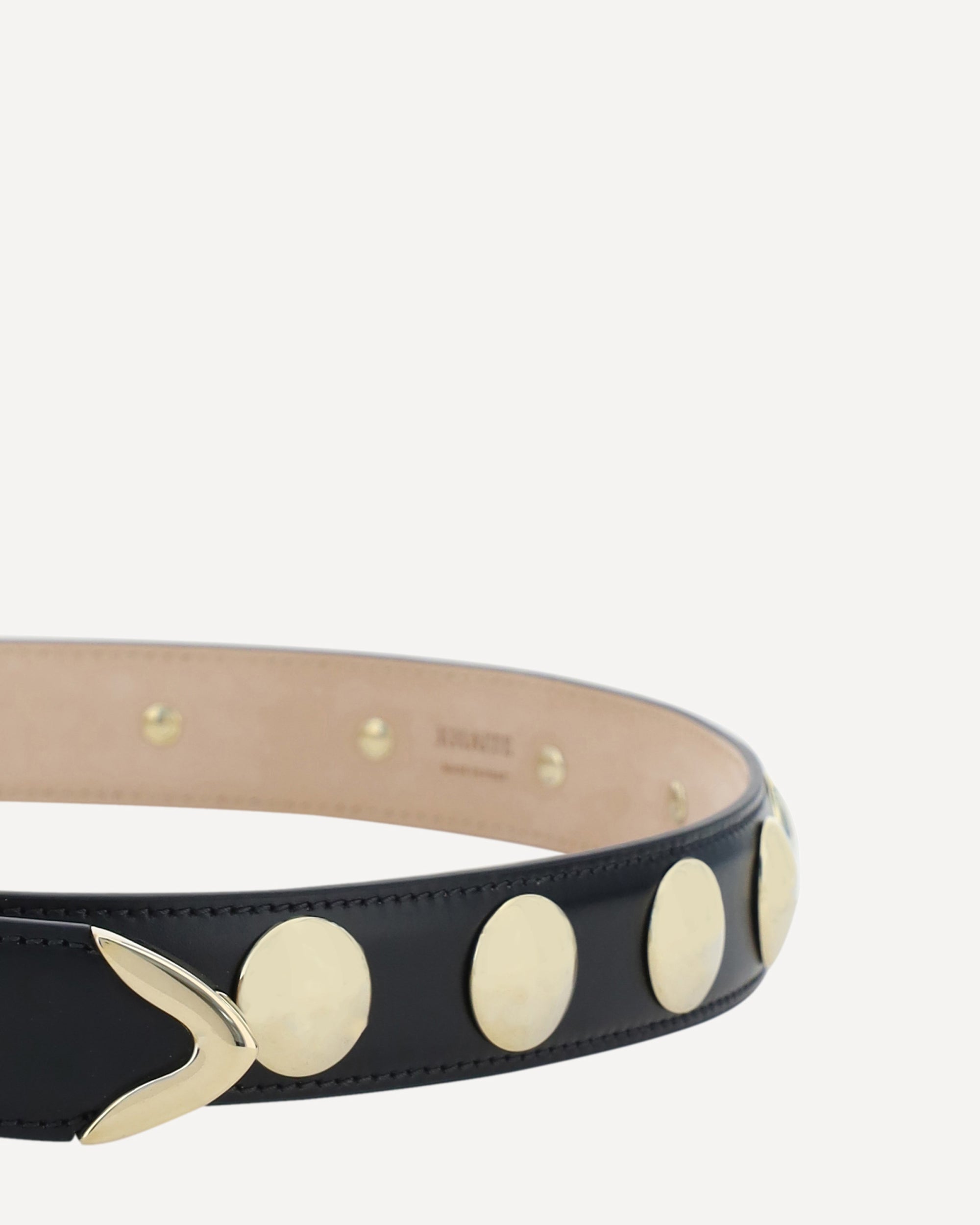 La Cintura Benny in pelle di Khaite unisce eleganza e grinta in un design raffinato. Realizzata in pelle liscia, è decorata con borchie sferiche dorate e completata da una fibbia metallica in tinta. Perfetta per valorizzare abiti, blazer o pantaloni a vita alta con un tocco audace e sofisticato.
