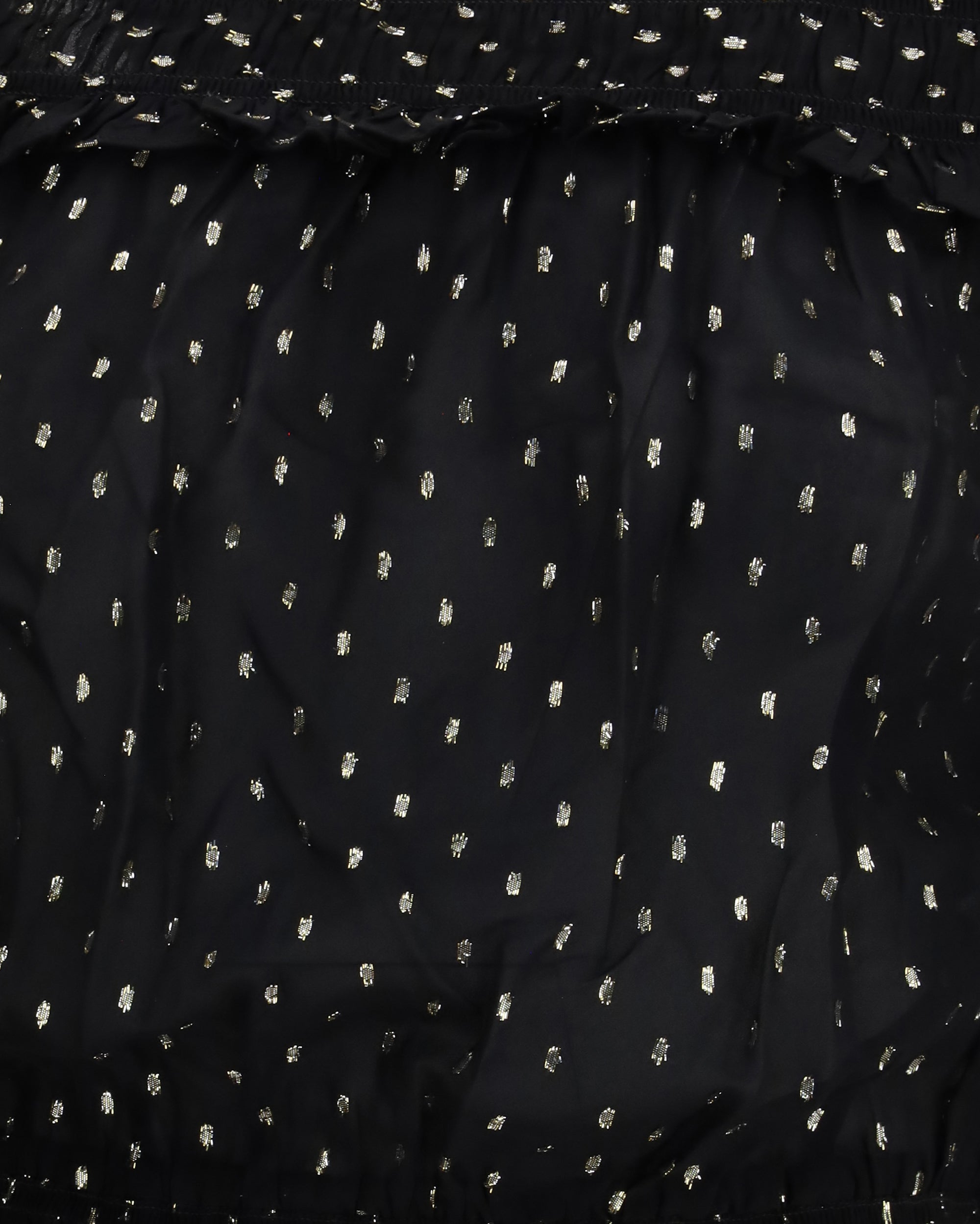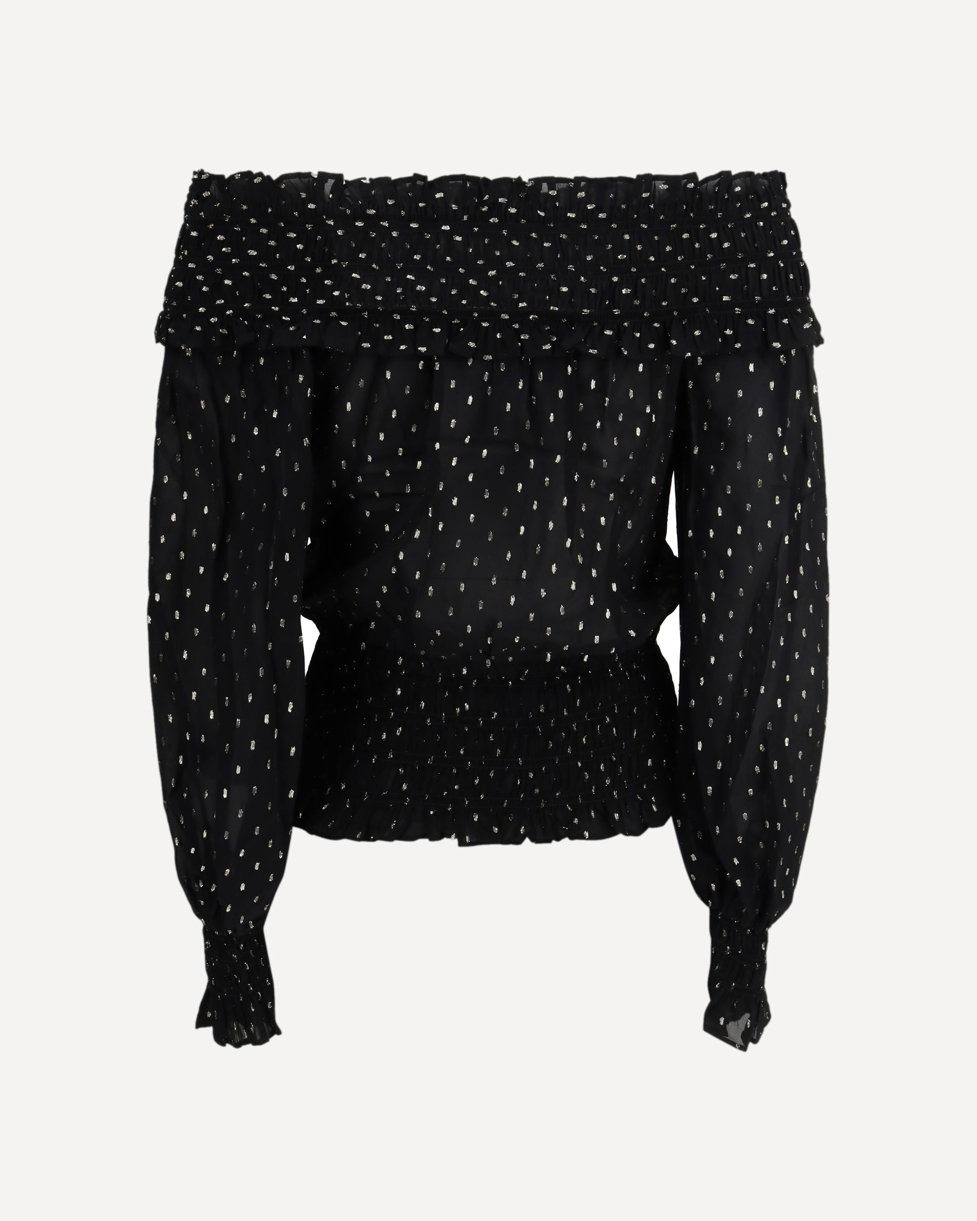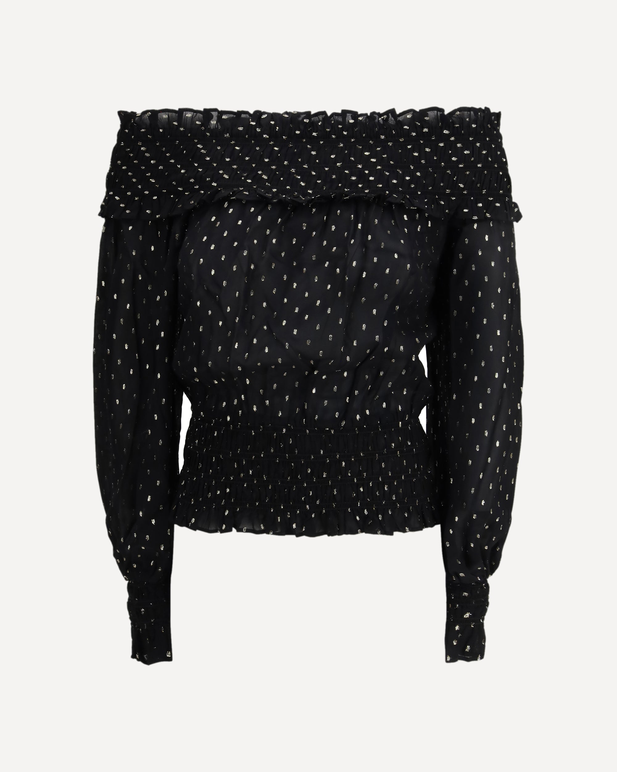 Il Top off-the-shoulder in chiffon di Self-Portrait racconta un’eleganza delicata e moderna, definita da tessuti leggeri e lavorazioni ricercate. La scollatura bardot mette in risalto le spalle con grazia, mentre il motivo a pois in fil coupé arricchisce la superficie con un tocco sofisticato. Le maniche lunghe e i bordi elasticizzati completano il modello, donando fluidità e una femminilità raffinata.