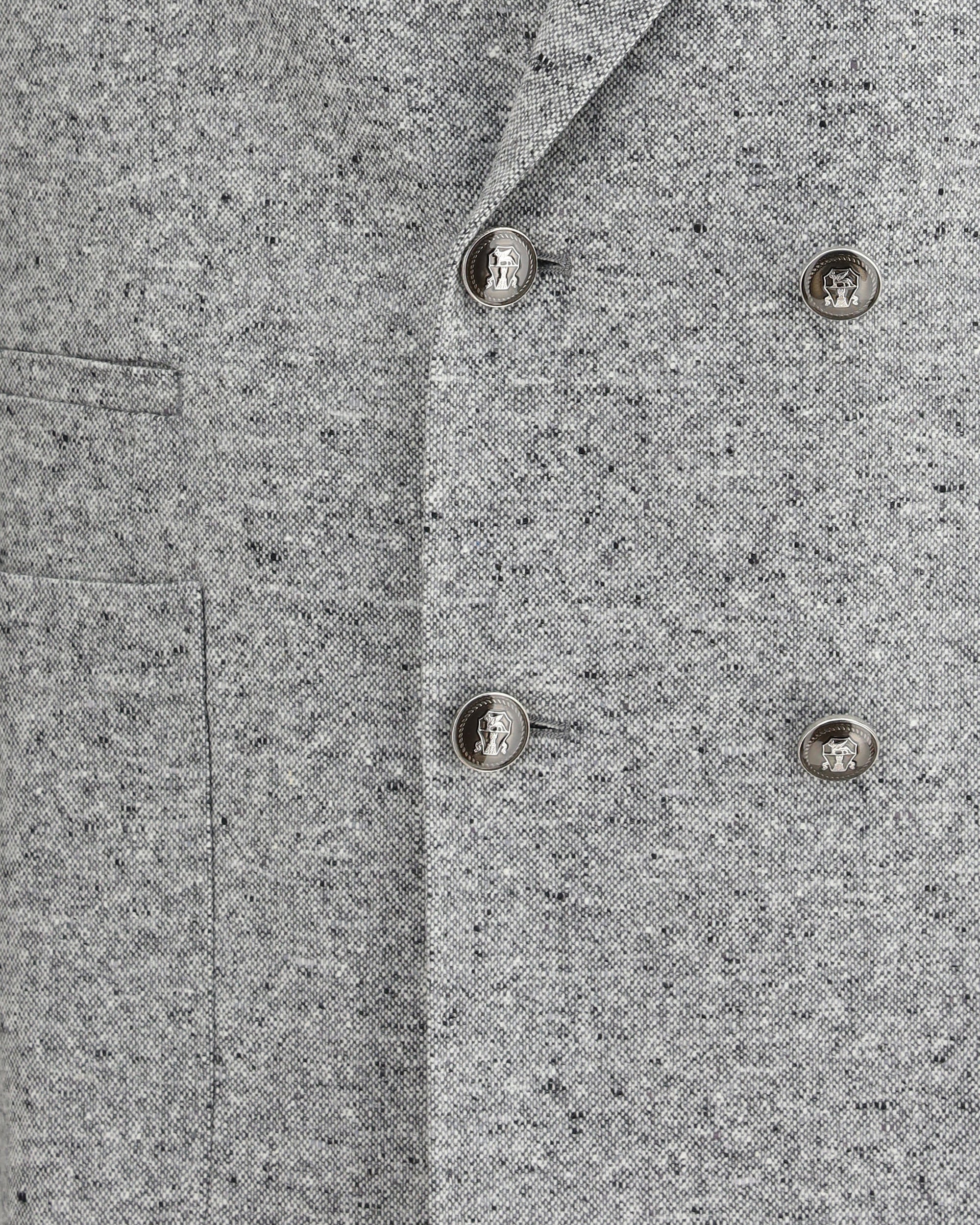 Il Blazer Decostruito di Brunello Cucinelli è realizzato in grisaglia di lana e cashmere con filato bottonato, presenta un effetto leggermente screziato e una texture avvolgente e leggera. Il modello a un petto e mezzo è completato da tasche a toppa, bottoni in metallo e dalla caratteristica “Spalla Solomeo”, che dona struttura alla spalla senza imbottiture, esaltando naturalmente la linea maschile.