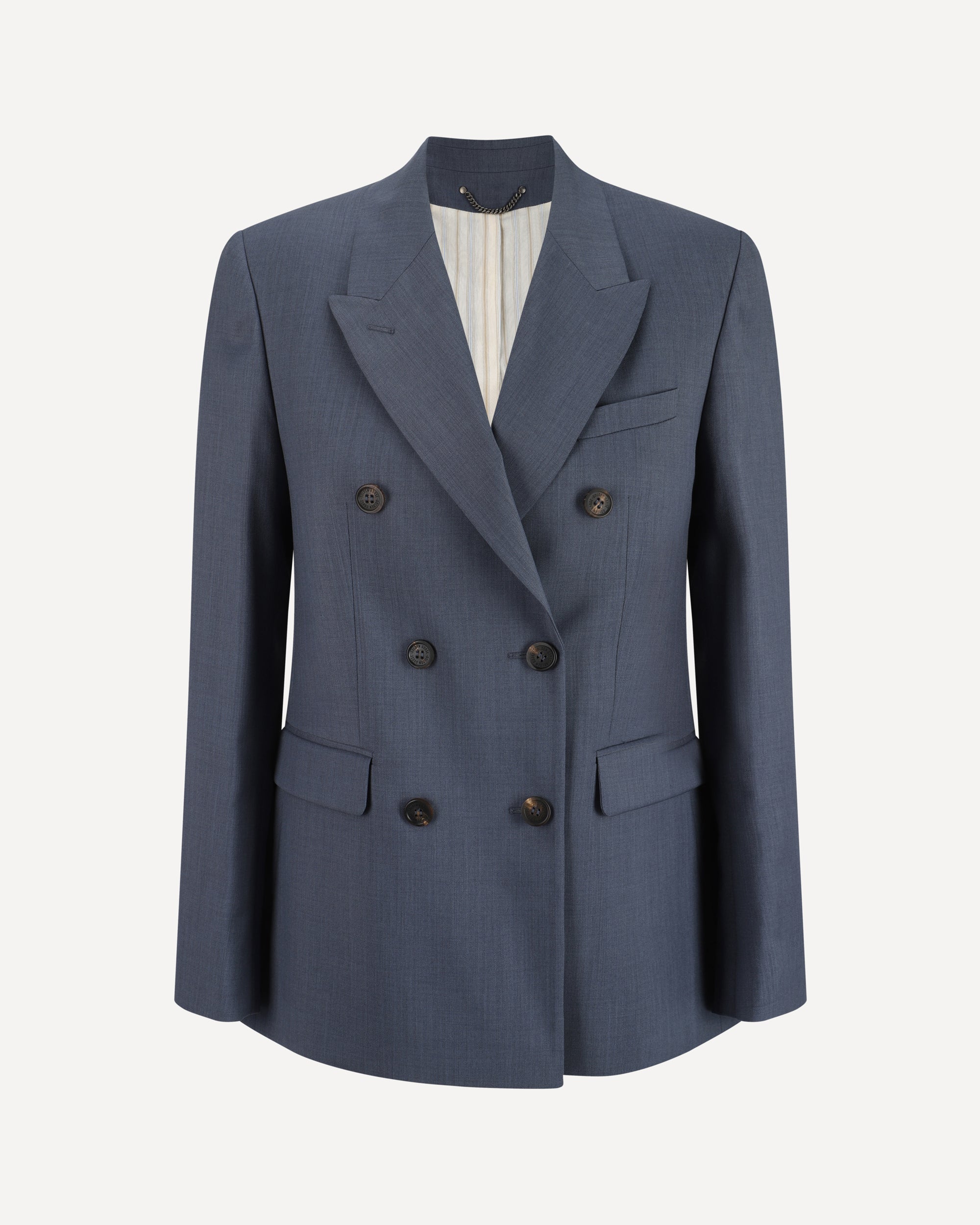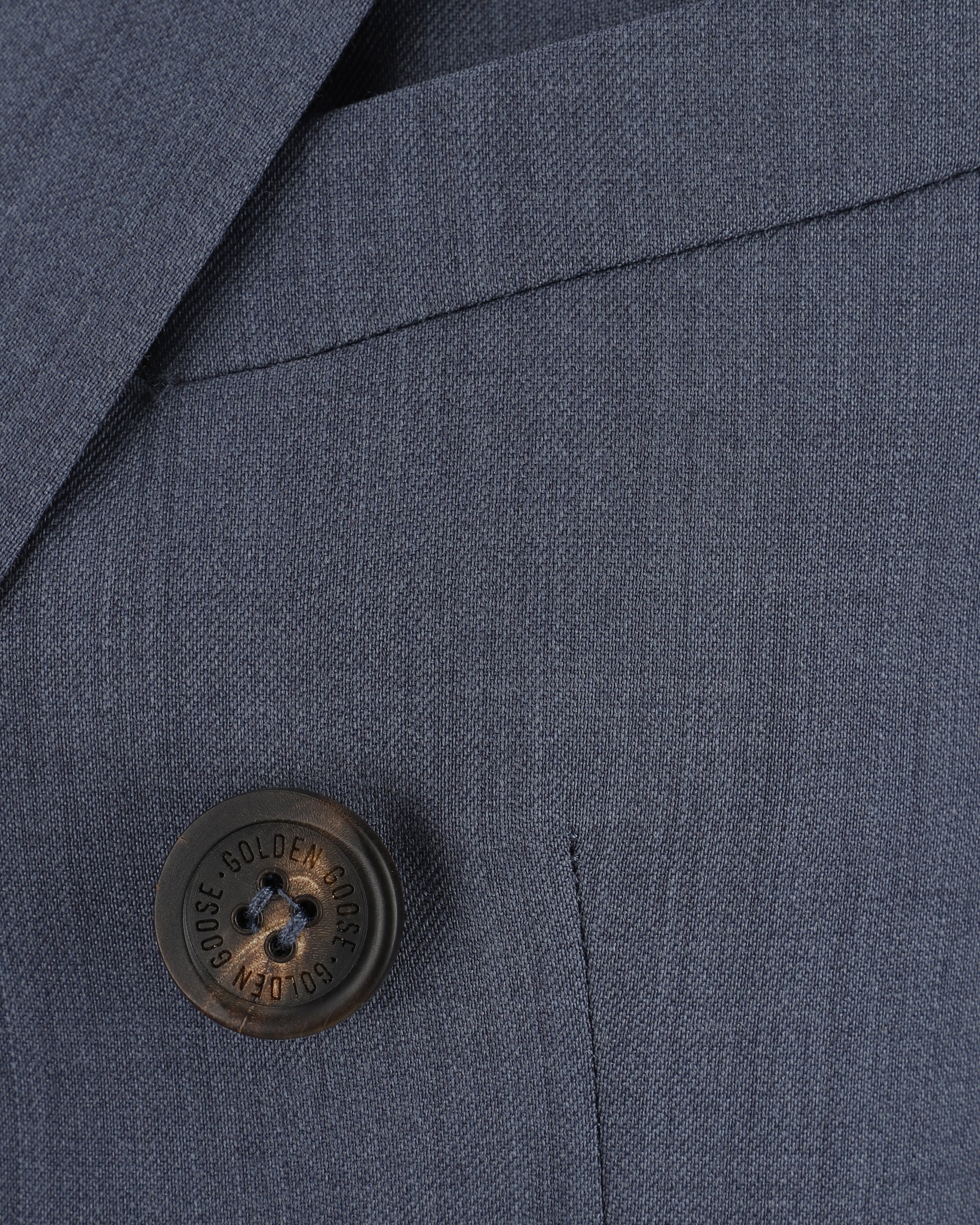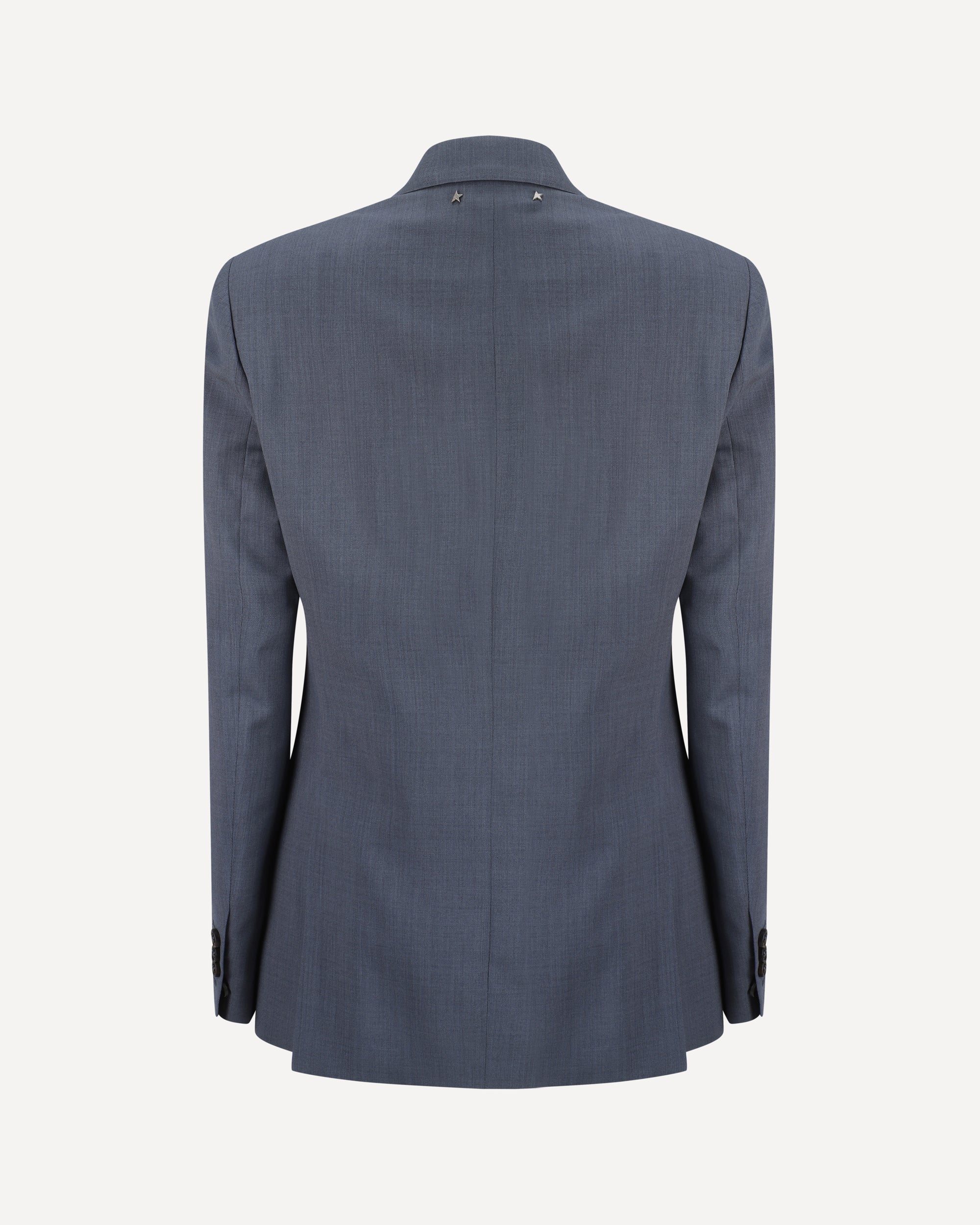 Giacca Blazer in Lana Vergine di Golden Goose, rever a lancia, chiusura frontale a doppio petto con bottoni a contrasto, due tasche a filetto con patta laterali, un taschino a filetto frontale, due spacchi sul retro, spalle strutturate, vestibilità regular.
