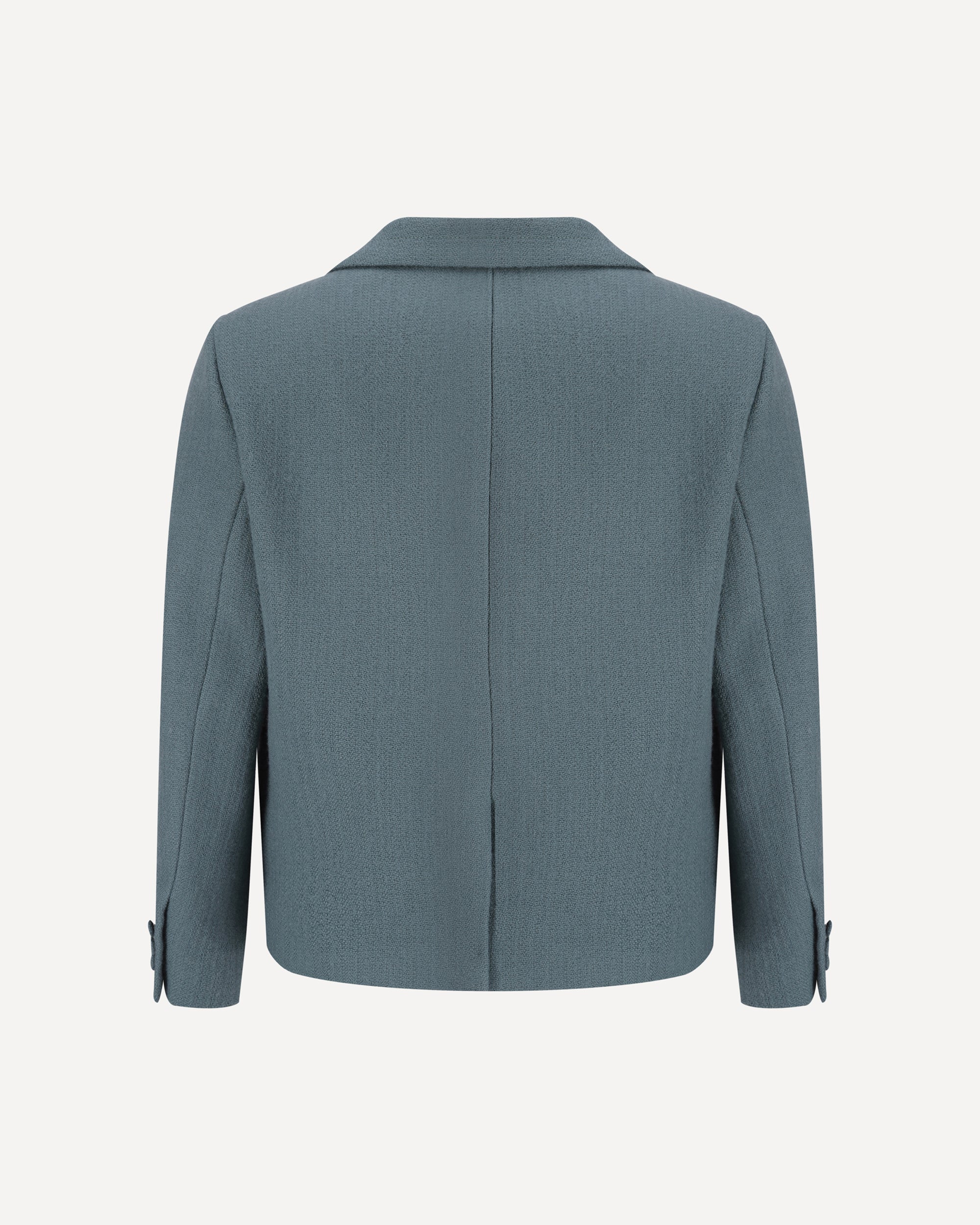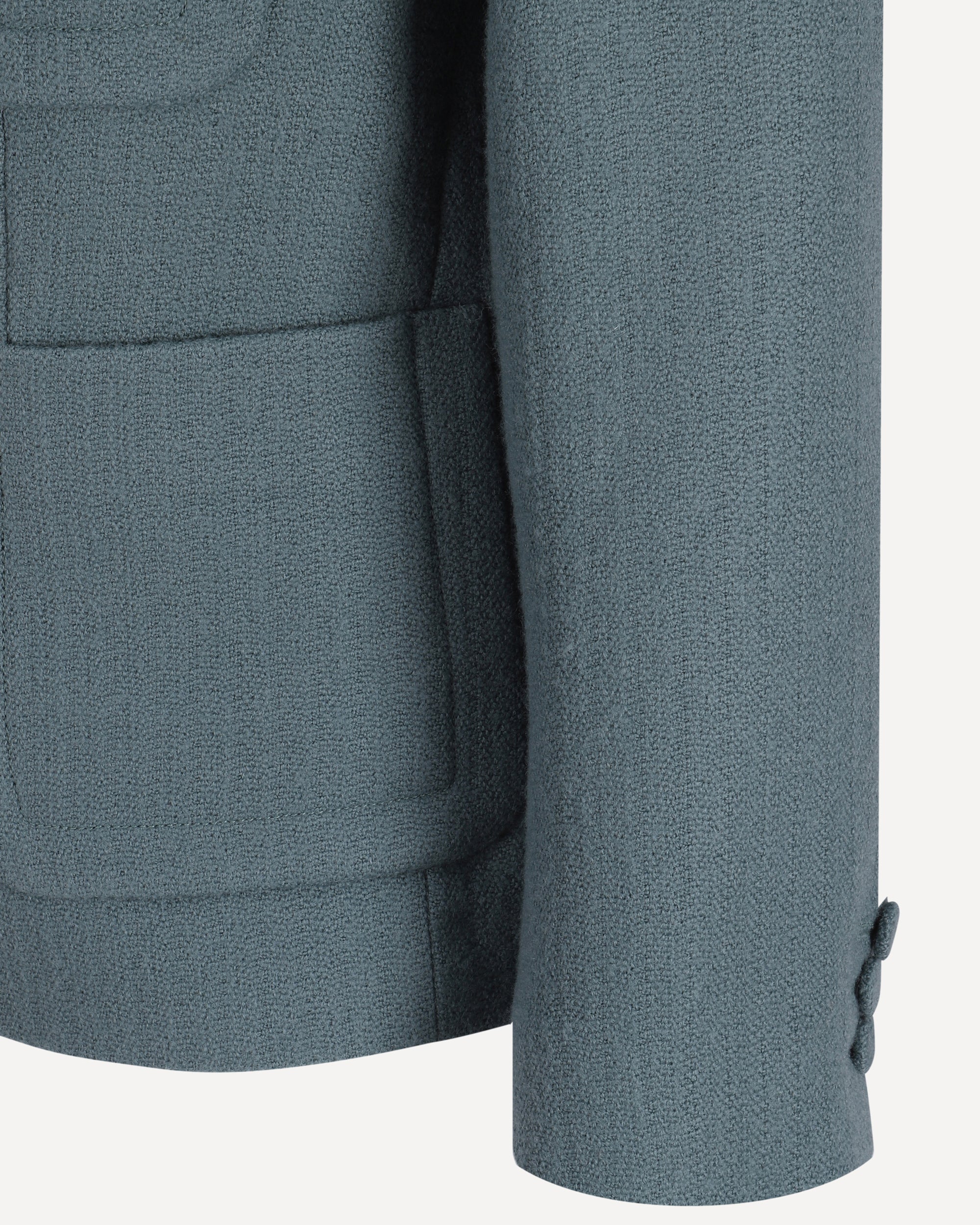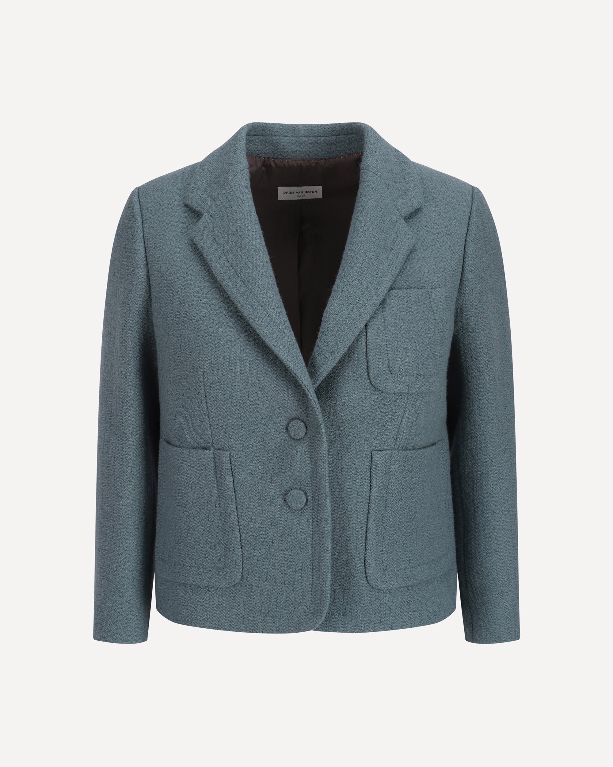 Giacca Blazer in Lana di Dries Van Noten, rever classico, chiusura frontale mediante bottone, tre tasche applicate sul fronte, uno spacco sul retro, fantasia monocromo, vestibilità regular.