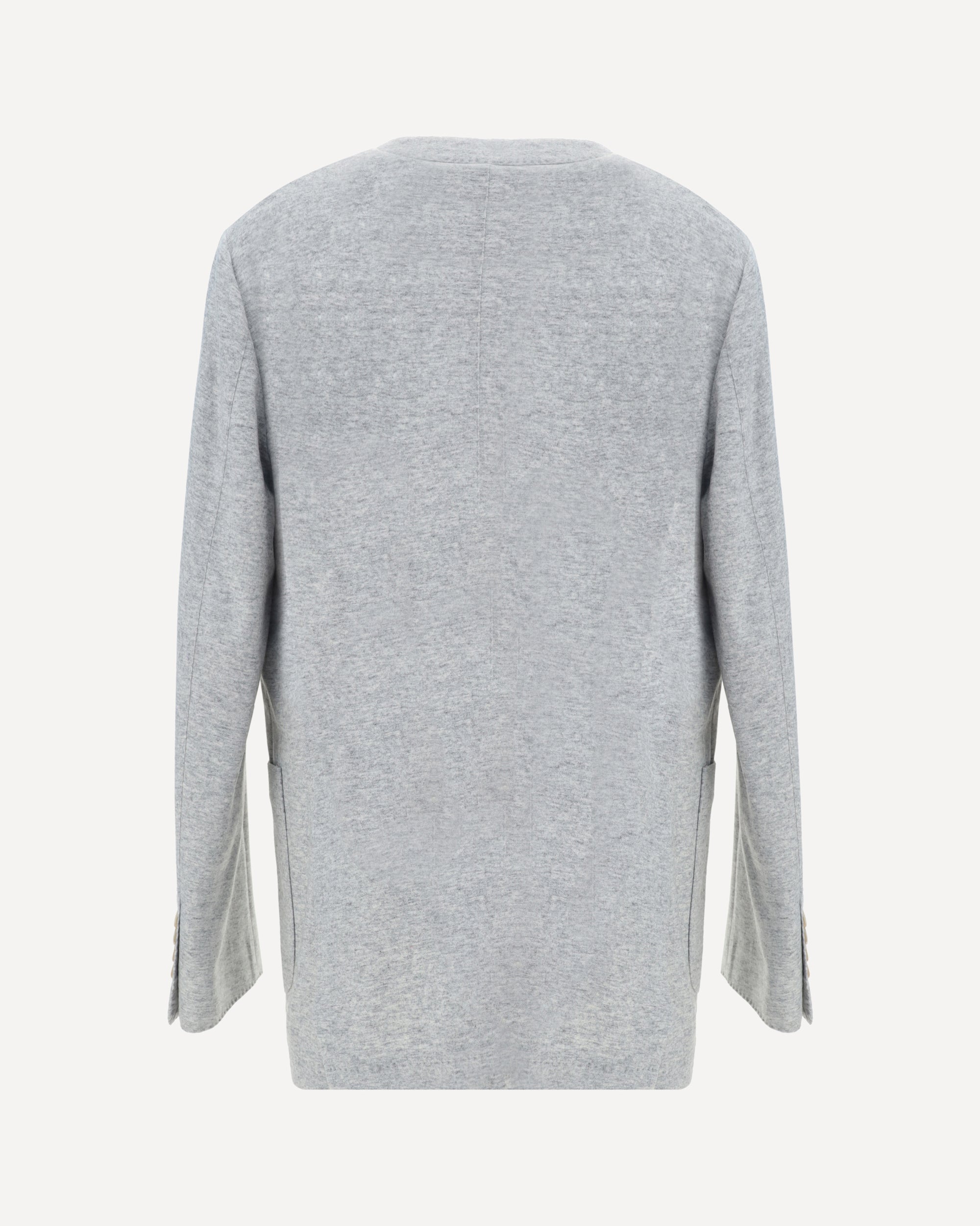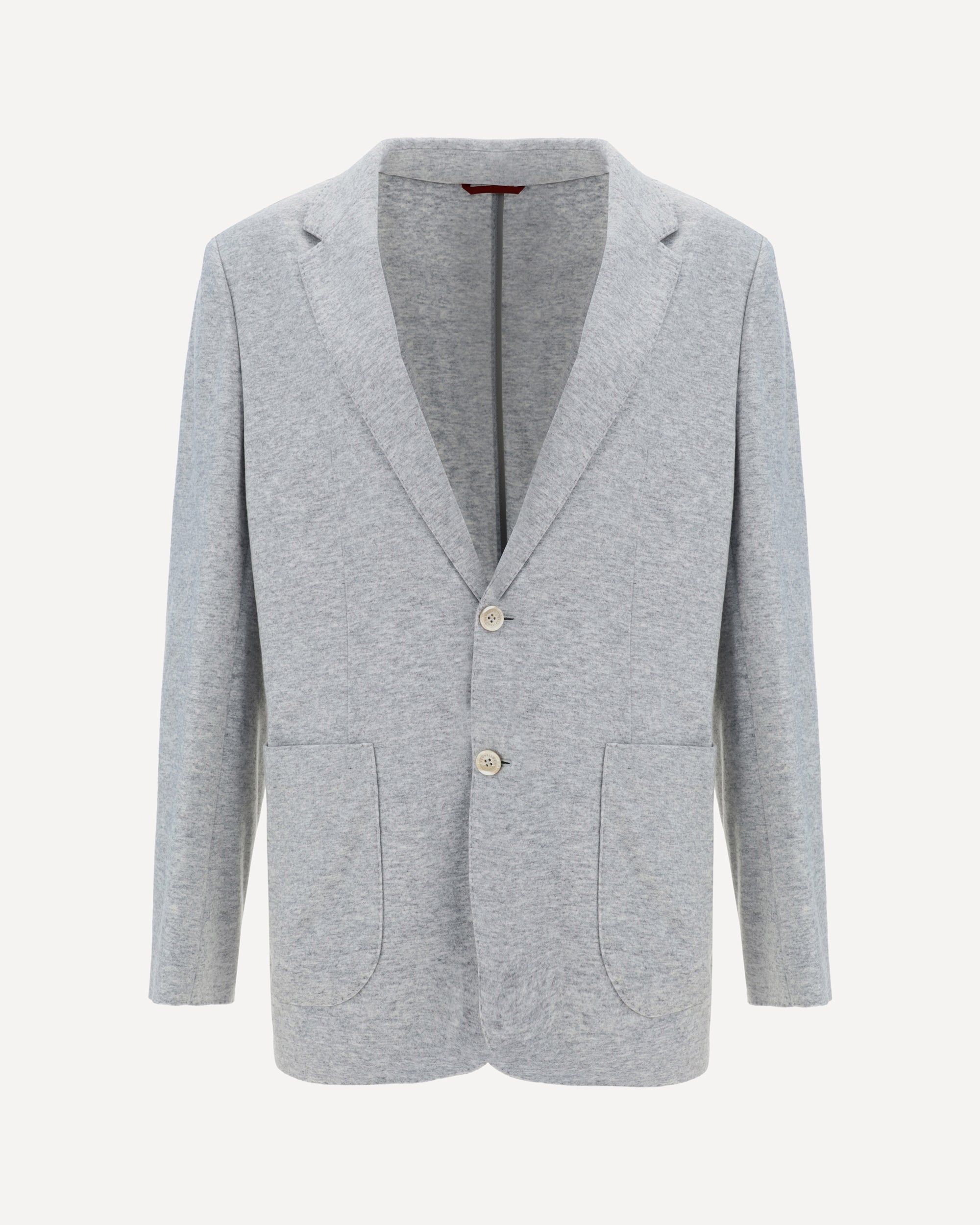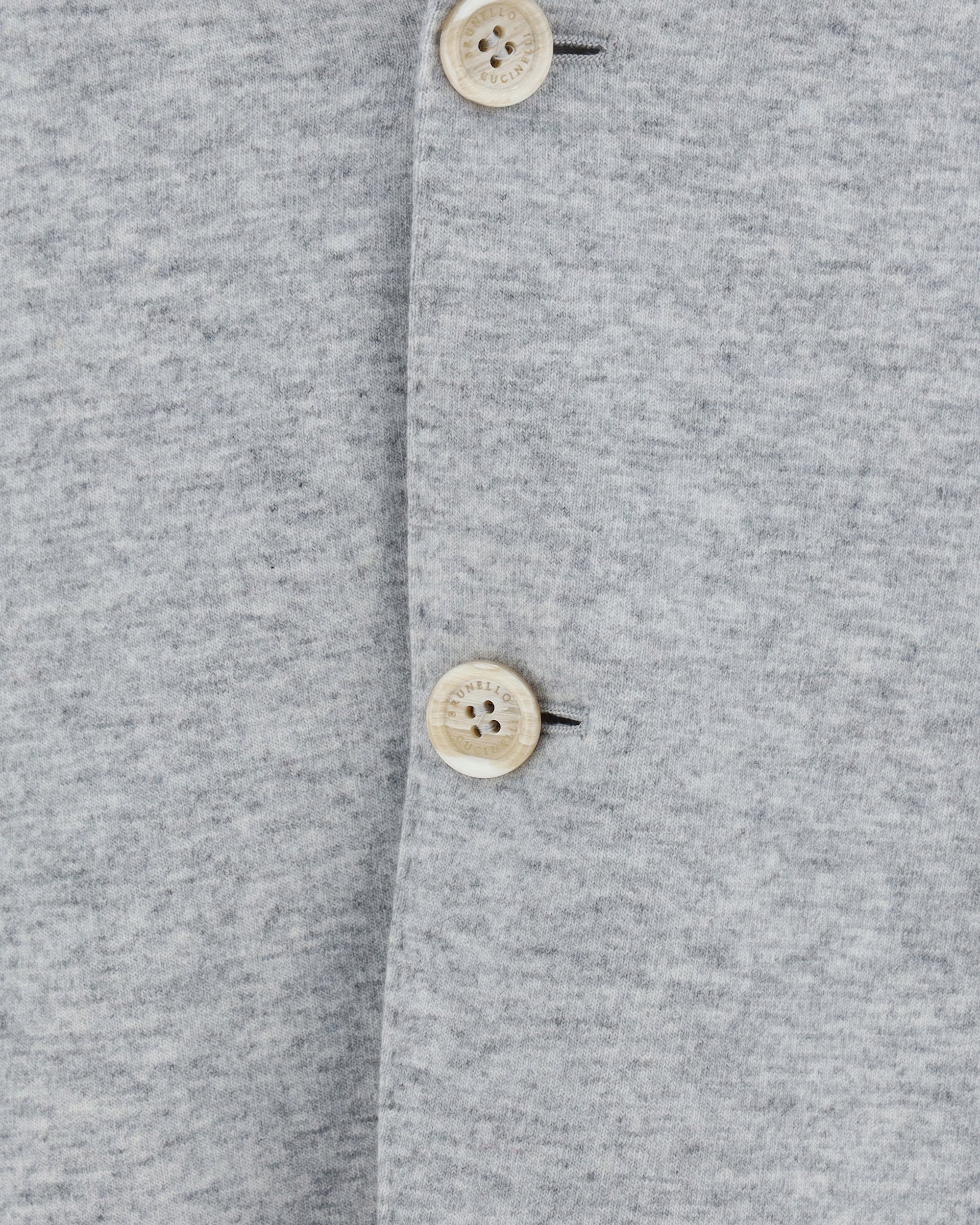 Giacca Blazer in Cashmere di Brunello Cucinelli, chiusura frontale con bottoni a contrasto, rever classico, due tasche a filetto applicate sul fronte, un taschino a filetto frontale, due spacchi sul retro, vestibilità regular.