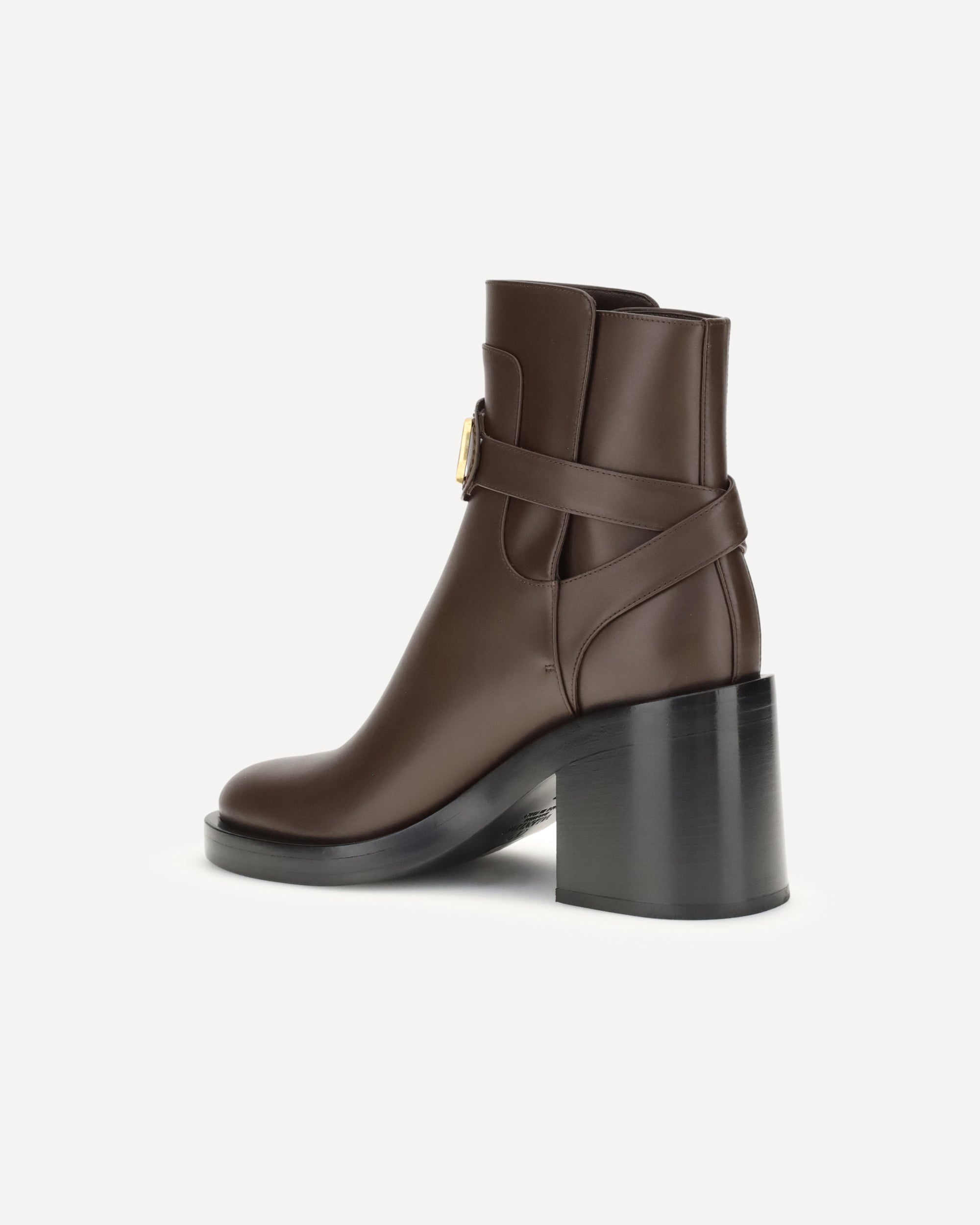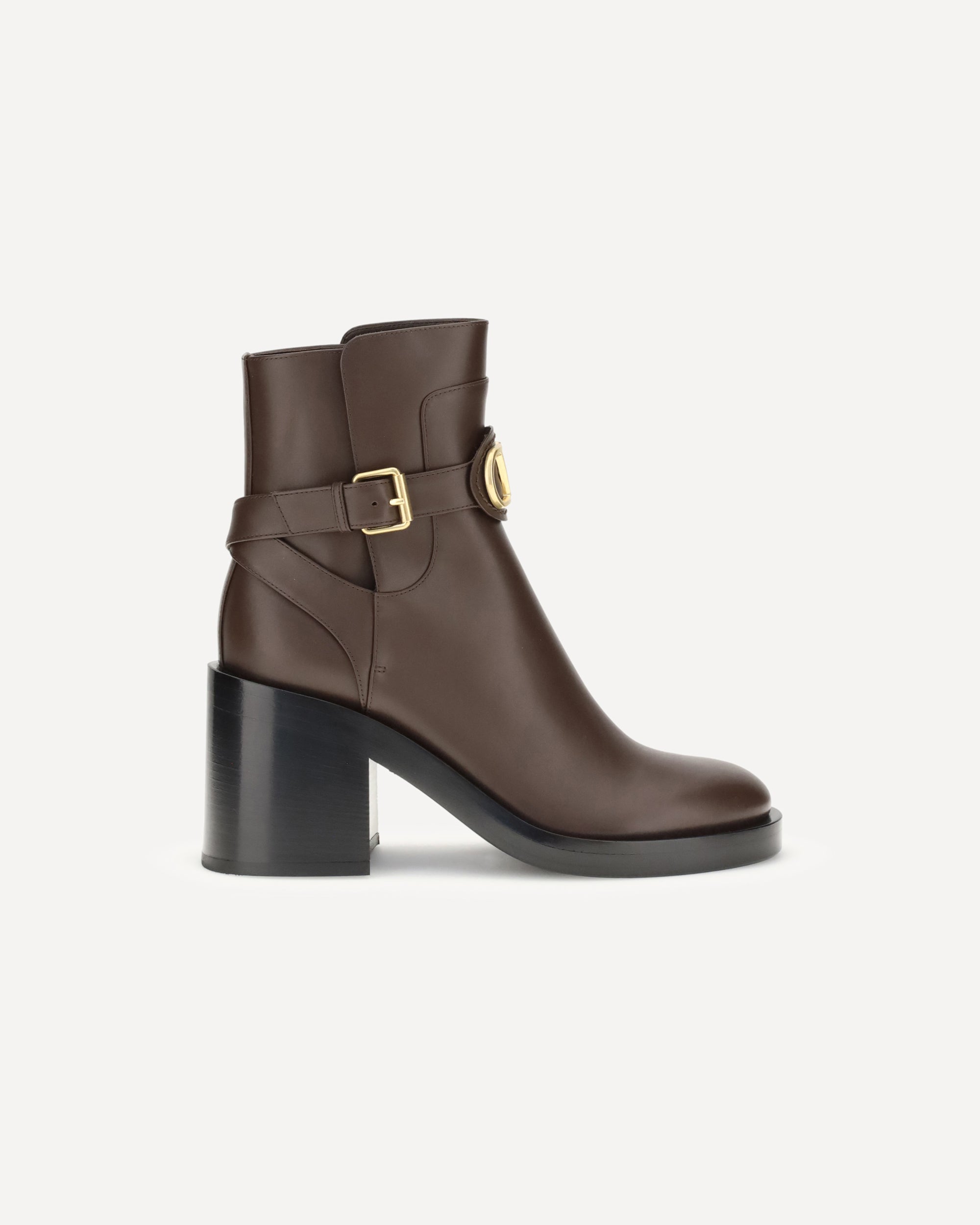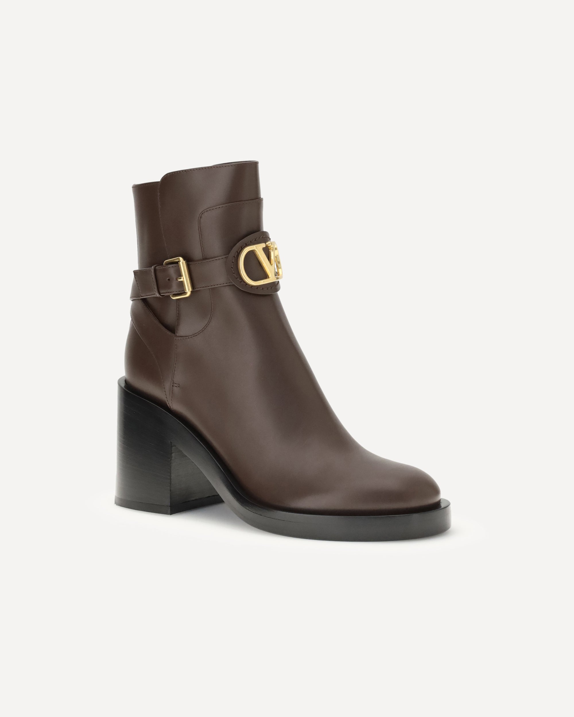 Gli Stivaletti VLogo di Valentino Garavani esprimono un'eleganza decisa grazie alla decorazione VLogo Signature con finitura in ottone effetto anticato, emblema distintivo della maison. Dotati di zip interna laterale per una calzata pratica, presentano un fondo in cuoio completato da una mezza pianta in gomma antiscivolo, che garantisce stabilità e comfort senza rinunciare allo stile.