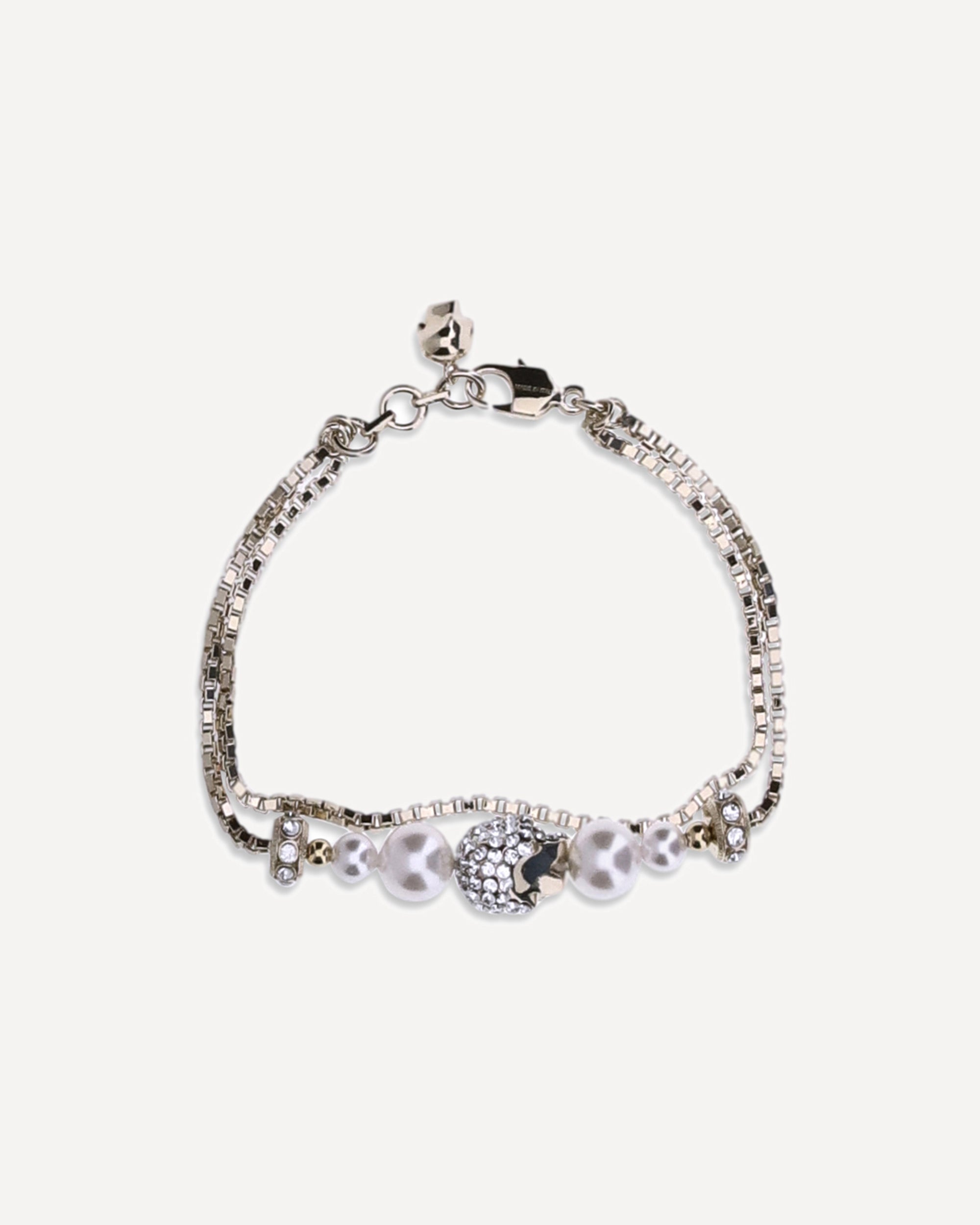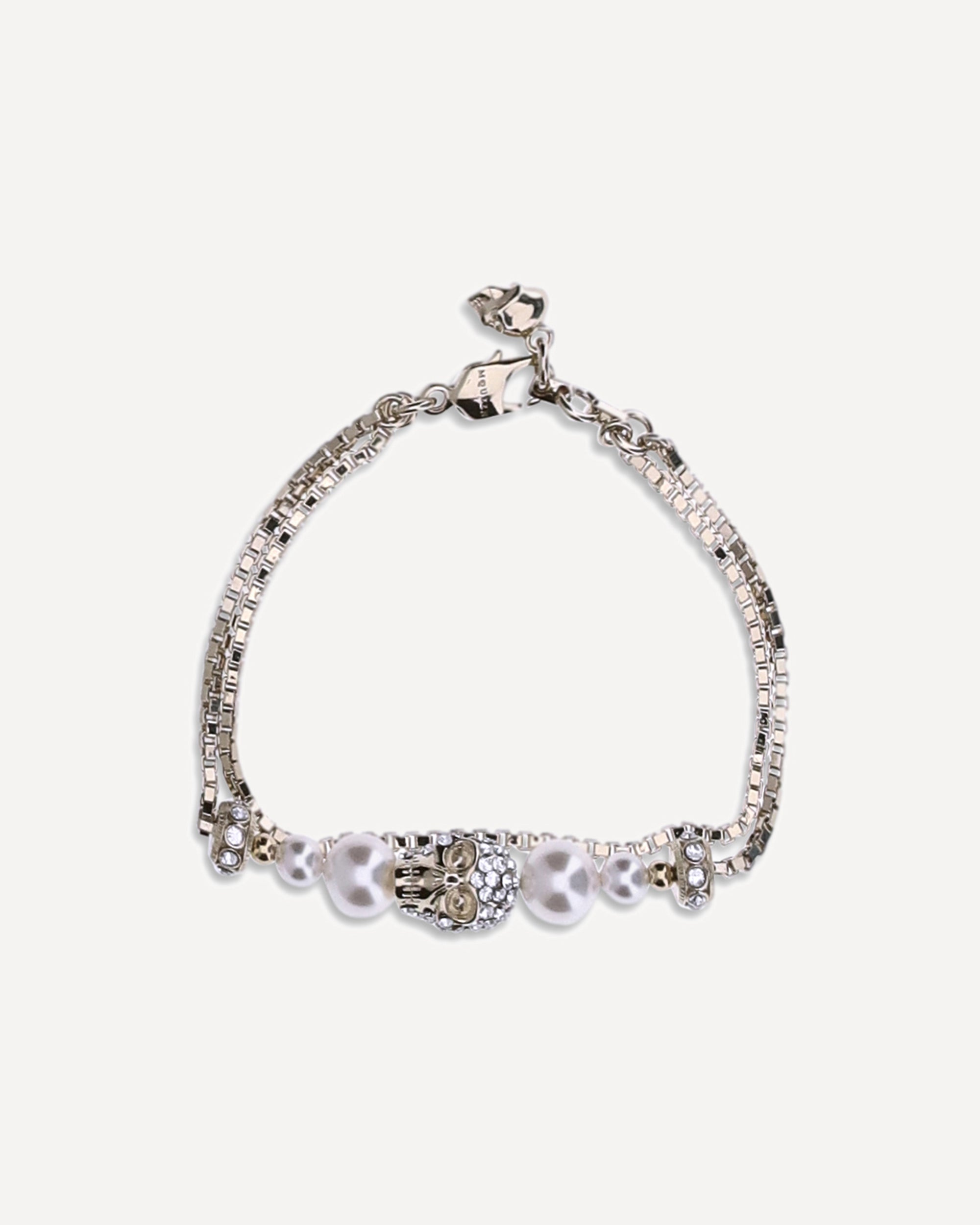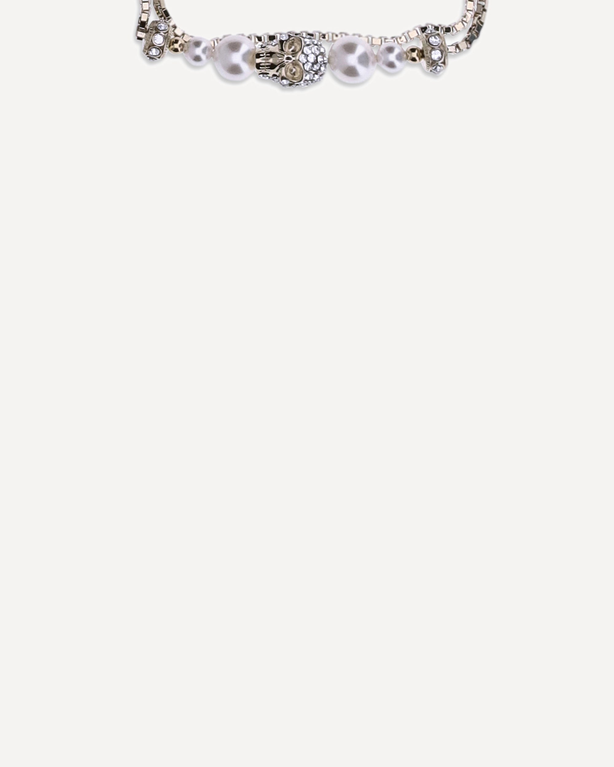 Il Bracciale Skull di Alexander McQueen unisce eleganza e audacia in un design distintivo. Caratterizzato da una chiusura regolabile, presenta un teschio impreziosito da strass e dettagli in perle, simbolo perfetto dello stile iconico e sofisticato della maison.