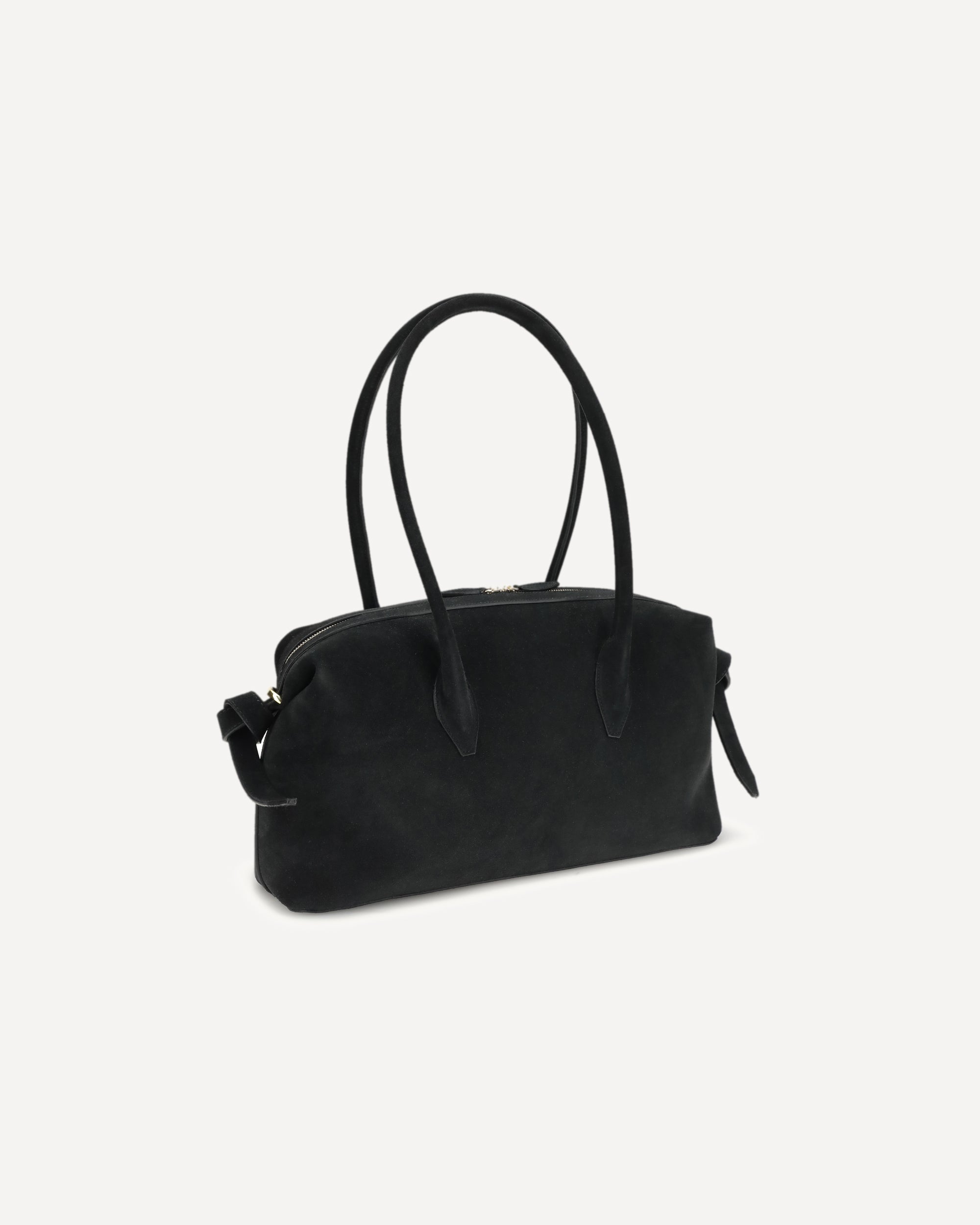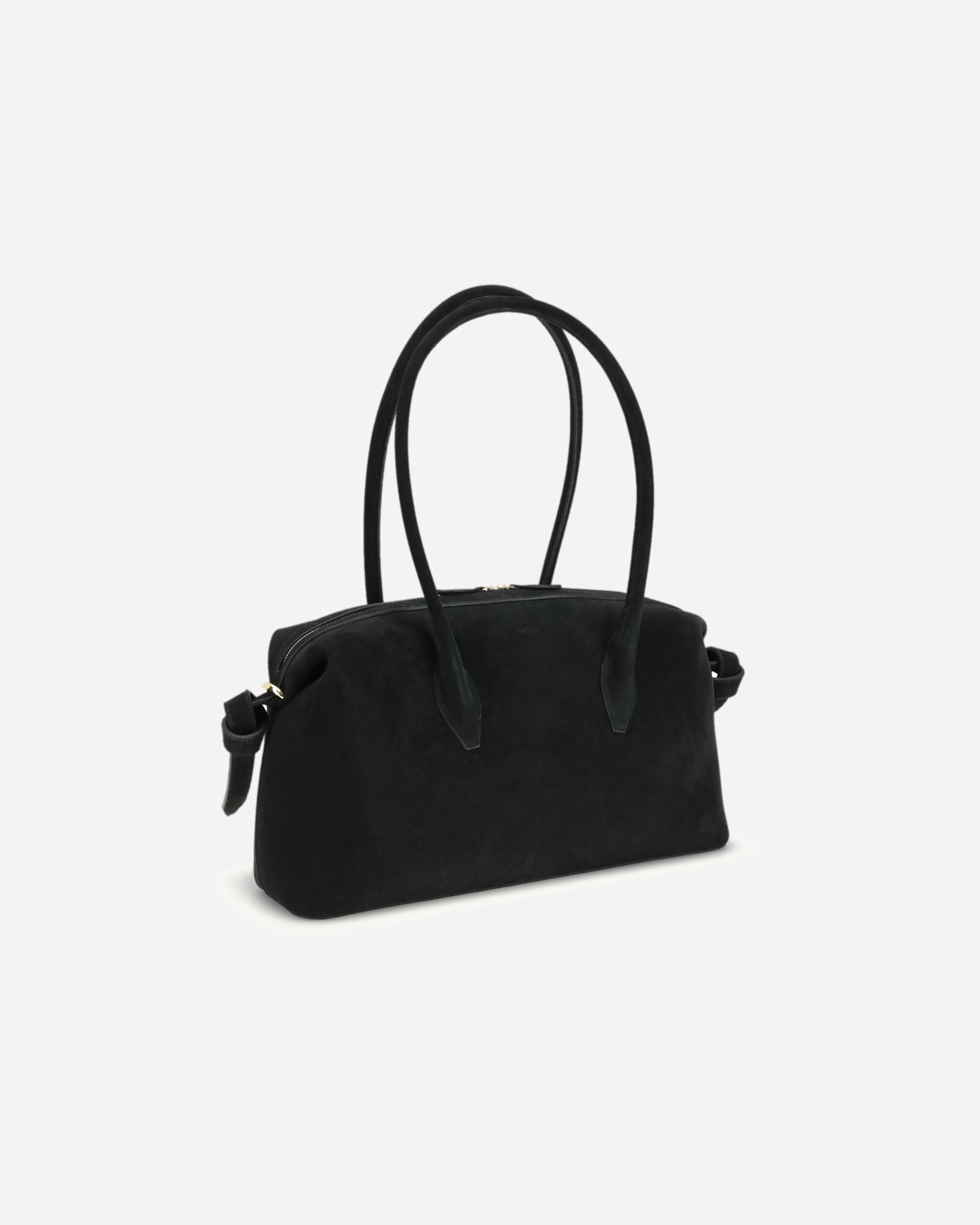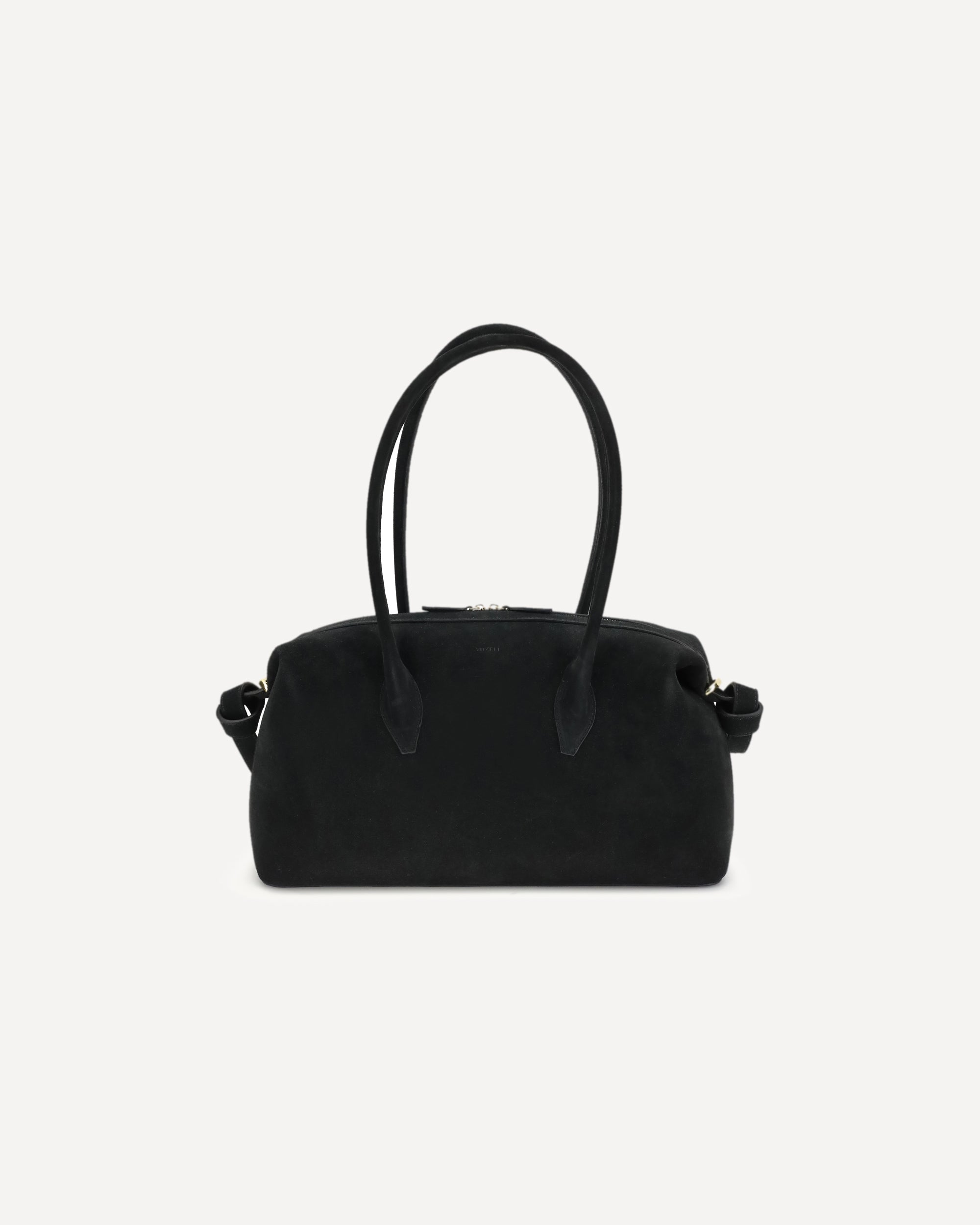 La Borsa a Spalla Brioche di Yuzefi è realizzata in lussuosa suede nera e si distingue per il design strutturato ed essenziale. Il modello Brioche Duffle offre un interno spazioso, ideale per contenere tutti gli oggetti essenziali con stile. Completano il design il manico in pelle, la chiusura con zip in metallo e l’hardware color oro, per un perfetto equilibrio tra raffinatezza e funzionalità.