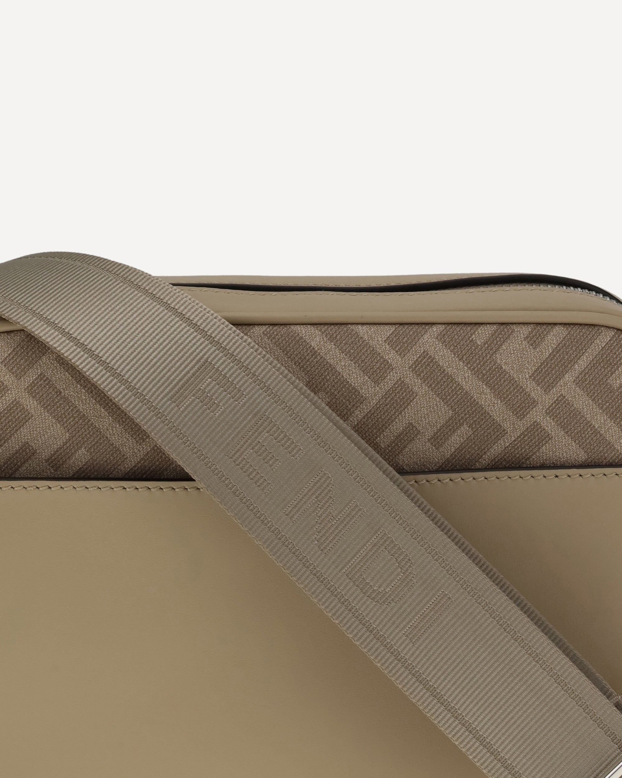 La Borsa a Tracolla Camera Case Squared FF di Fendi è un modello compatto e raffinato, realizzato in pelle liscia beige abbinata alla iconica tela FF nello stesso tono. Arricchita da un’applicazione FF in metallo, presenta una tasca piatta esterna e uno scomparto principale con chiusura a zip. L’interno è foderato, mentre gli accessori in metallo sono rifiniti con palladio. La tracolla crossbody in tessuto tecnico, decorata con lettering FENDI, è regolabile e rimovibile per una versatilità d’uso ottimale.