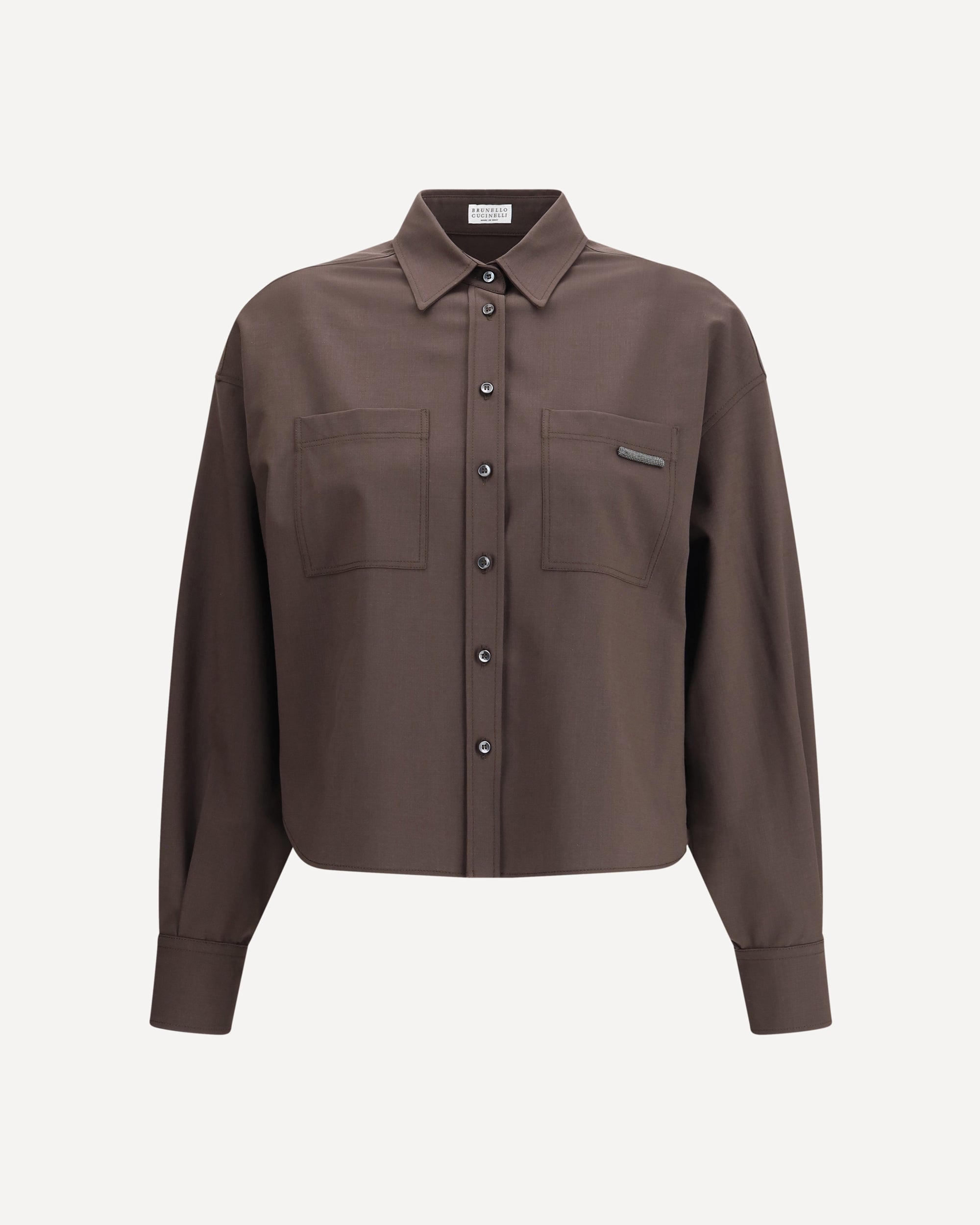 La Camicia in lana di Brunello Cucinelli è un capo che unisce raffinatezza e dettagli distintivi. Il colletto classico e la chiusura frontale con bottoni donano al modello un tocco elegante e senza tempo, mentre le due tasche applicate sul fronte, impreziosite dai caratteristici monili brillanti, aggiungono un accento luminoso e sofisticato. L’orlo asimmetrico completa il design con un dettaglio moderno e dinamico, rendendo questa camicia perfetta per look eleganti e ricercati.
