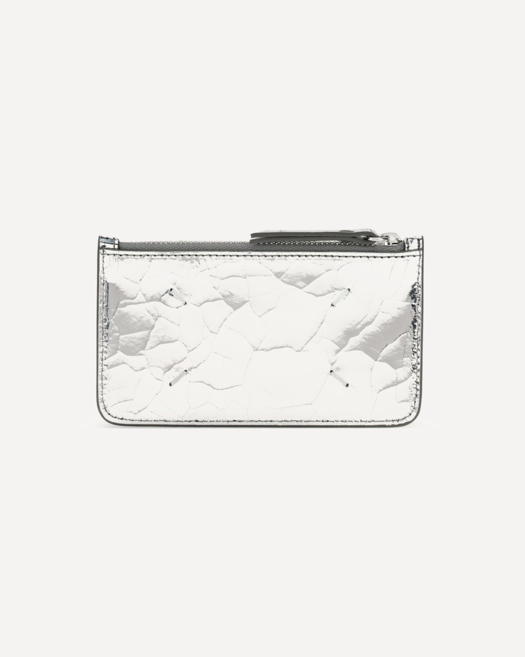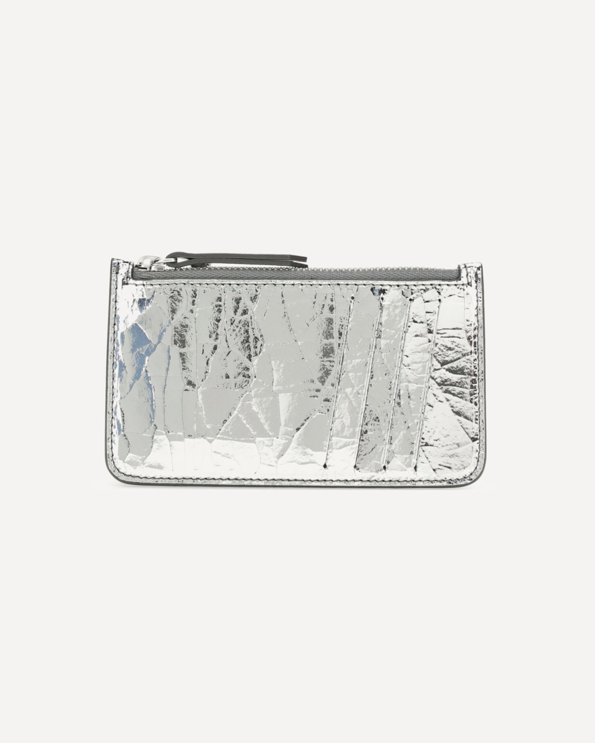 Il Porta Carte metallizzato di Maison Margiela unisce design distintivo e funzionalità. Realizzato con l’iconica finitura broken mirror della Maison, presenta una texture riflettente e originale. Oltre agli scomparti per le carte, è dotato di una pratica sezione con zip per le monete, perfetta per un uso quotidiano elegante e contemporaneo.