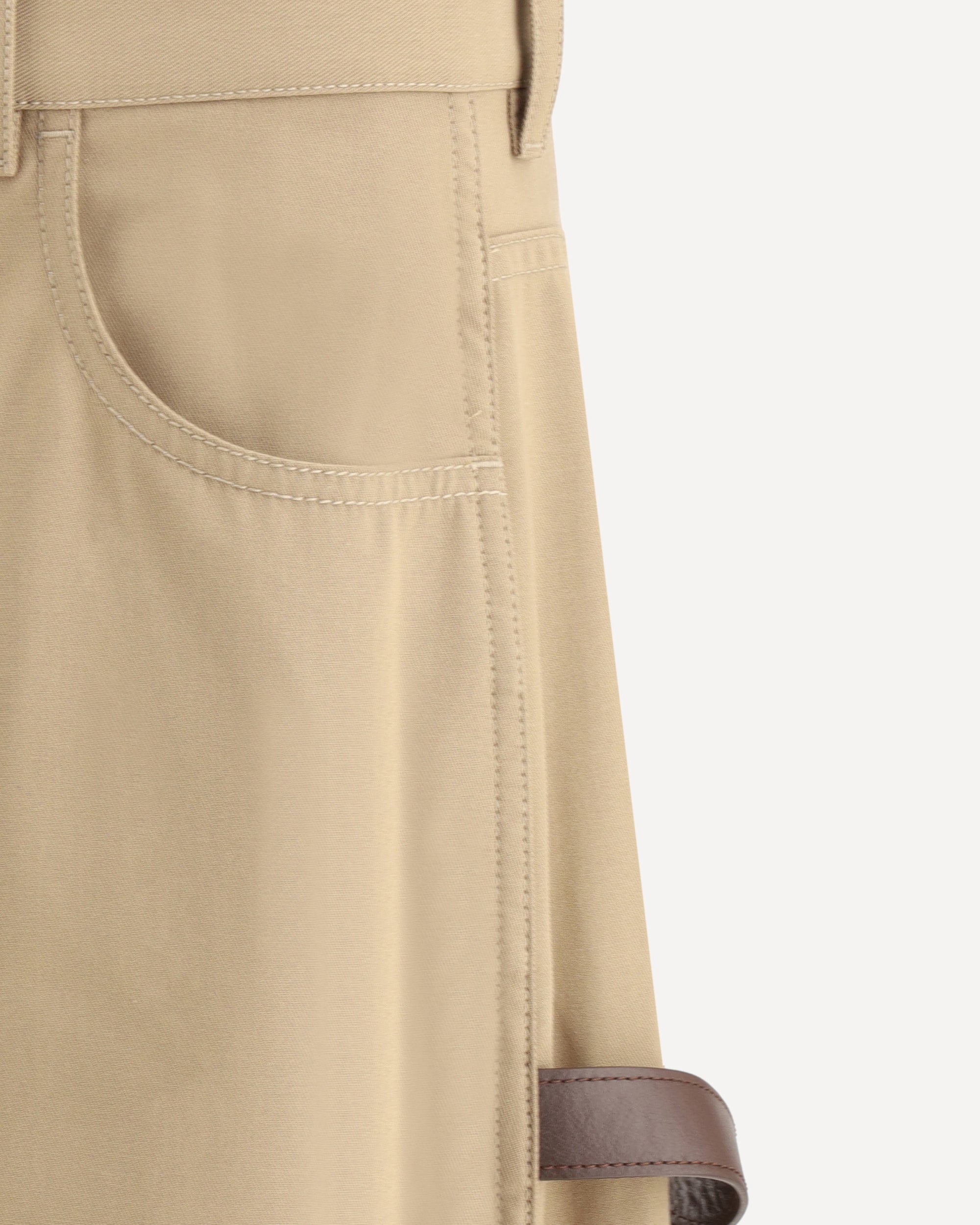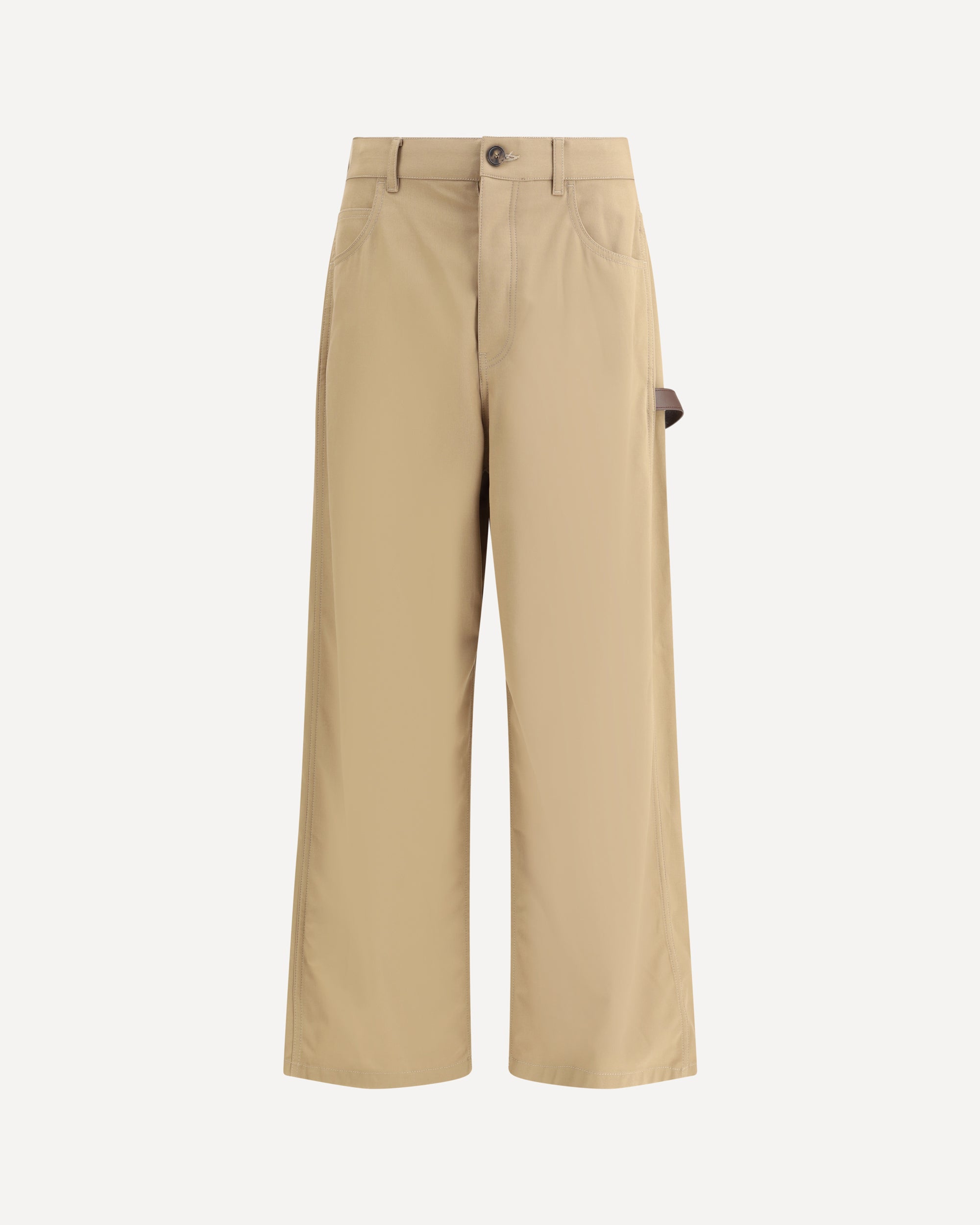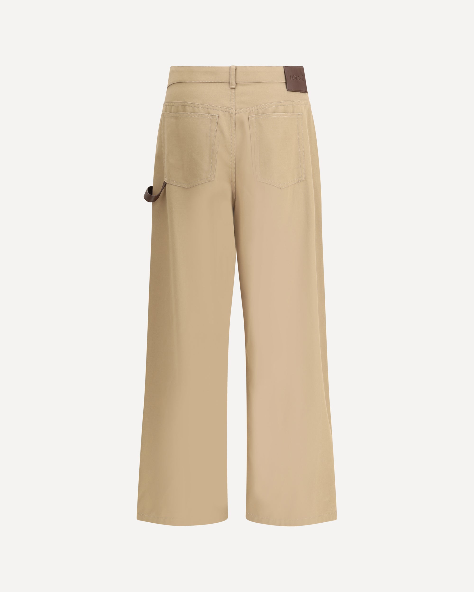 I Pantaloni Carpenter di Loewe sono realizzati in cotone leggero e compatto, con una vestibilità rilassata e gamba curva. Presentano una vita media, chiusura con zip nascosta e cinque tasche. Il passante funzionale in pelle aggiunge un tocco distintivo al design essenziale.