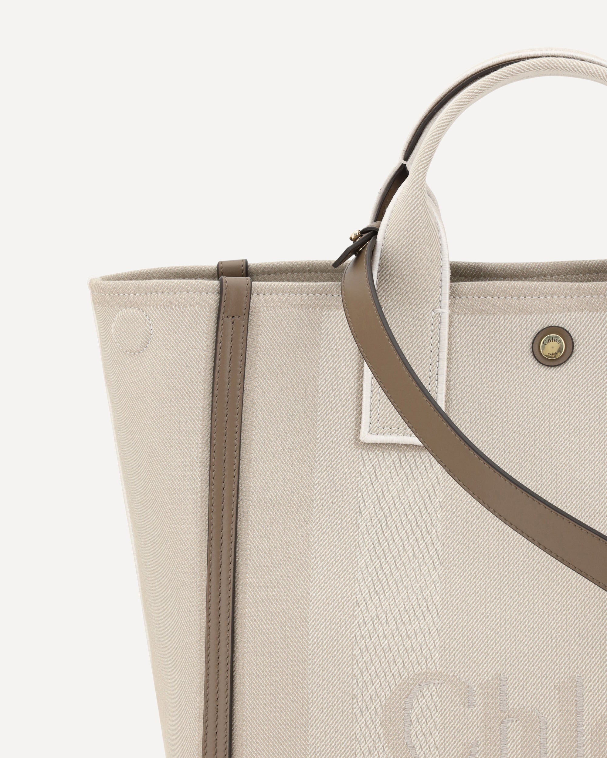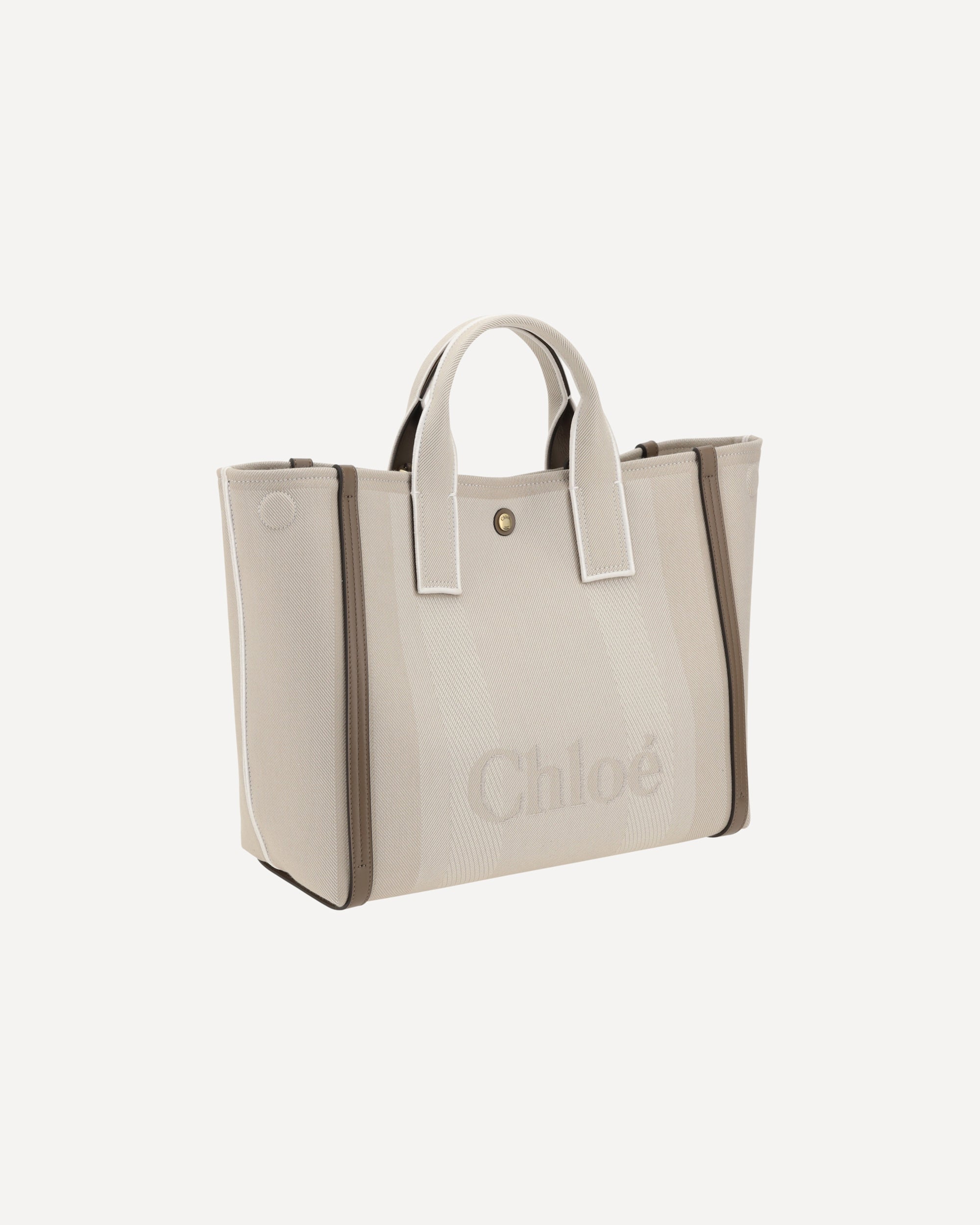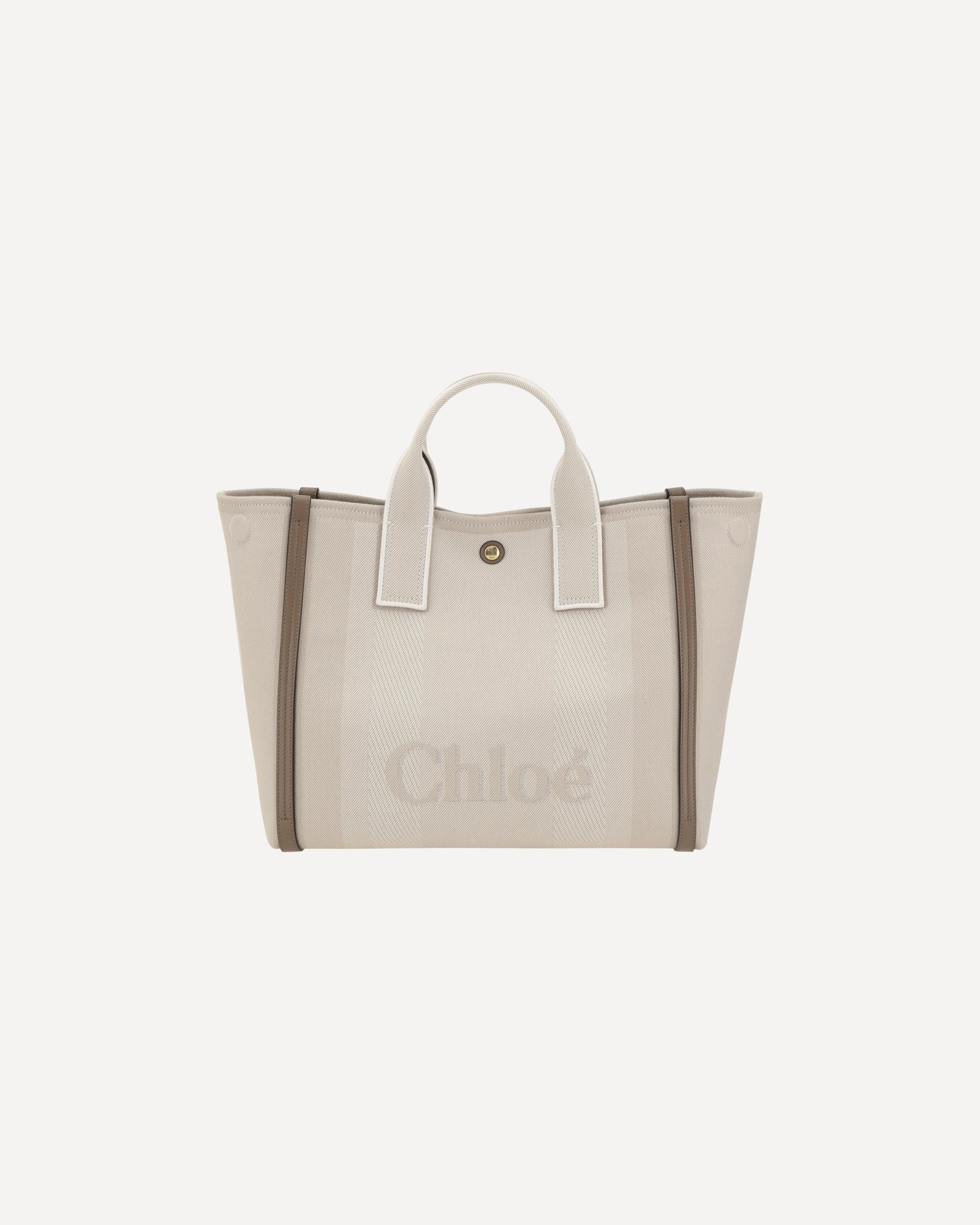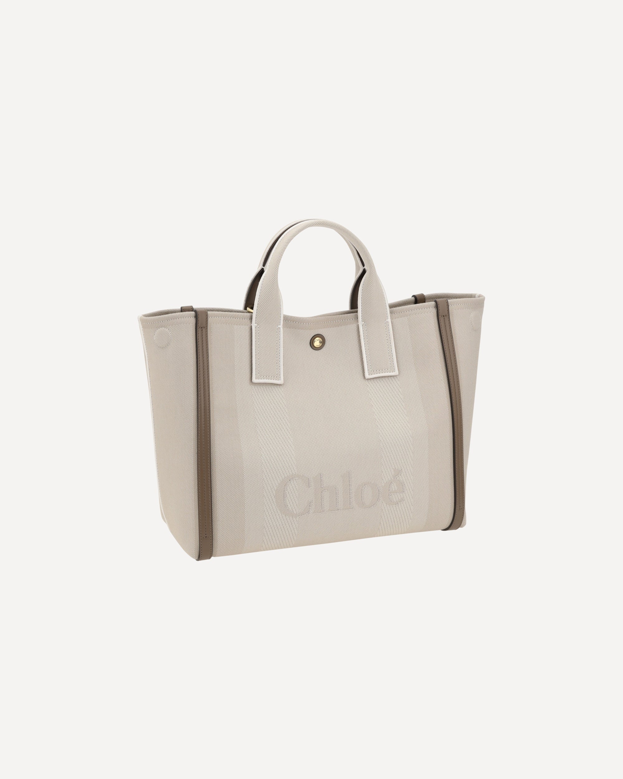 La Borsa a Mano Carry di Chloé è un accessorio raffinato e versatile, realizzato in cotone con dettagli in pelle a contrasto che ne accentuano l'eleganza. La chiusura superiore a scatto garantisce praticità, mentre i doppi manici piatti e il prolungamento in pelle sui pannelli laterali aggiungono un tocco sofisticato. L'iconico monogramma del brand è visibile su fronte e retro, creando un richiamo distintivo. La tracolla in pelle removibile e regolabile permette di portarla anche a spalla, aumentando la versatilità. All'interno, una tasca a filetto aiuta a mantenere in ordine gli oggetti più piccoli, mentre la firma del brand sui pannelli laterali completa il look con un dettaglio di classe.