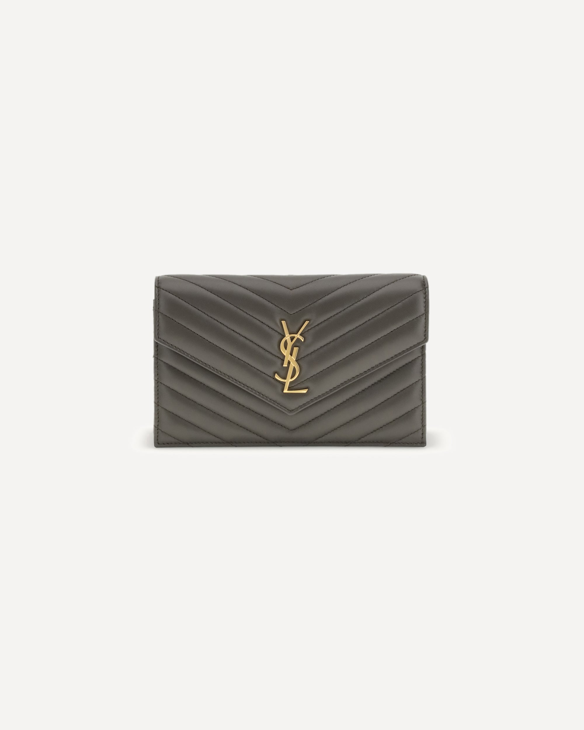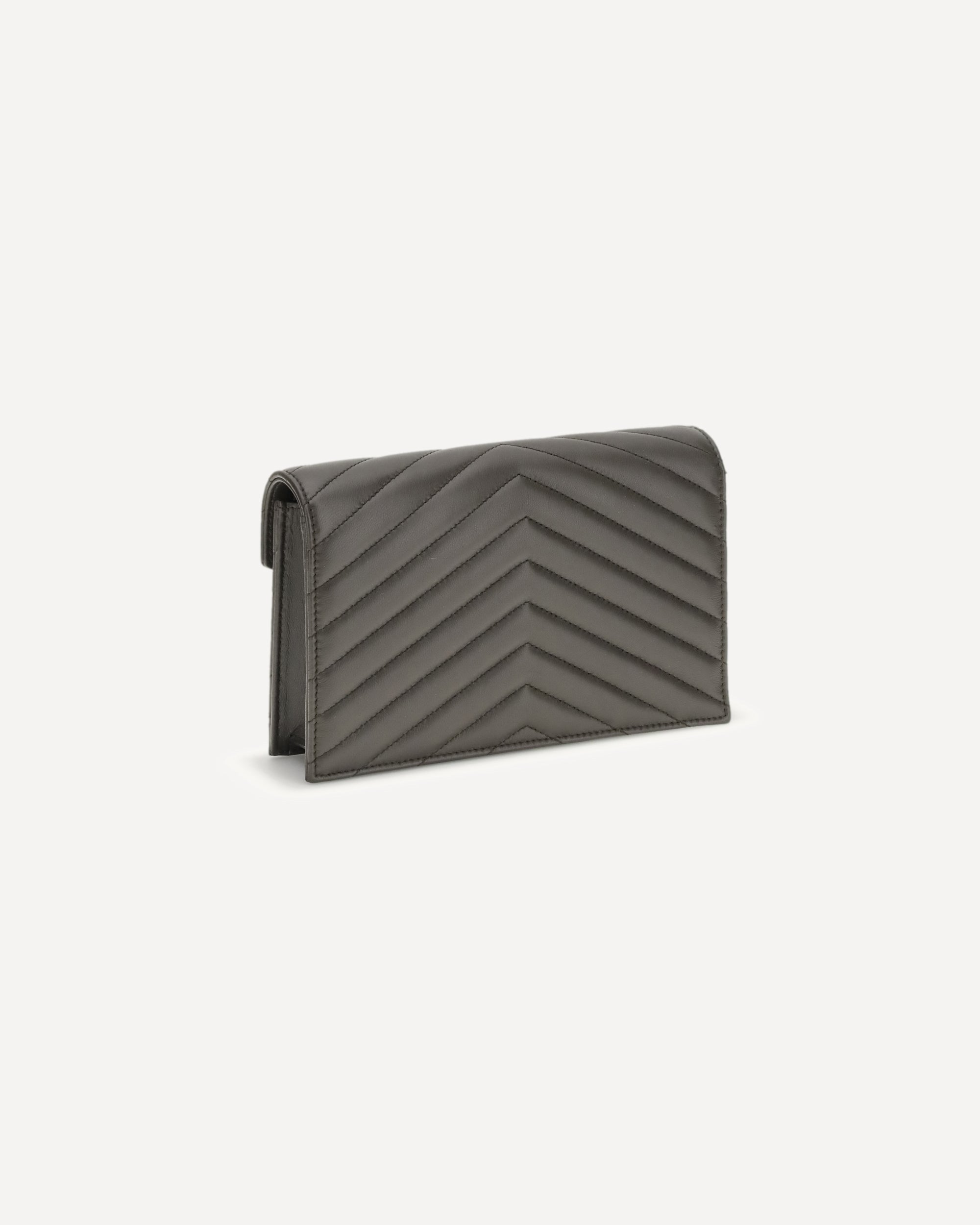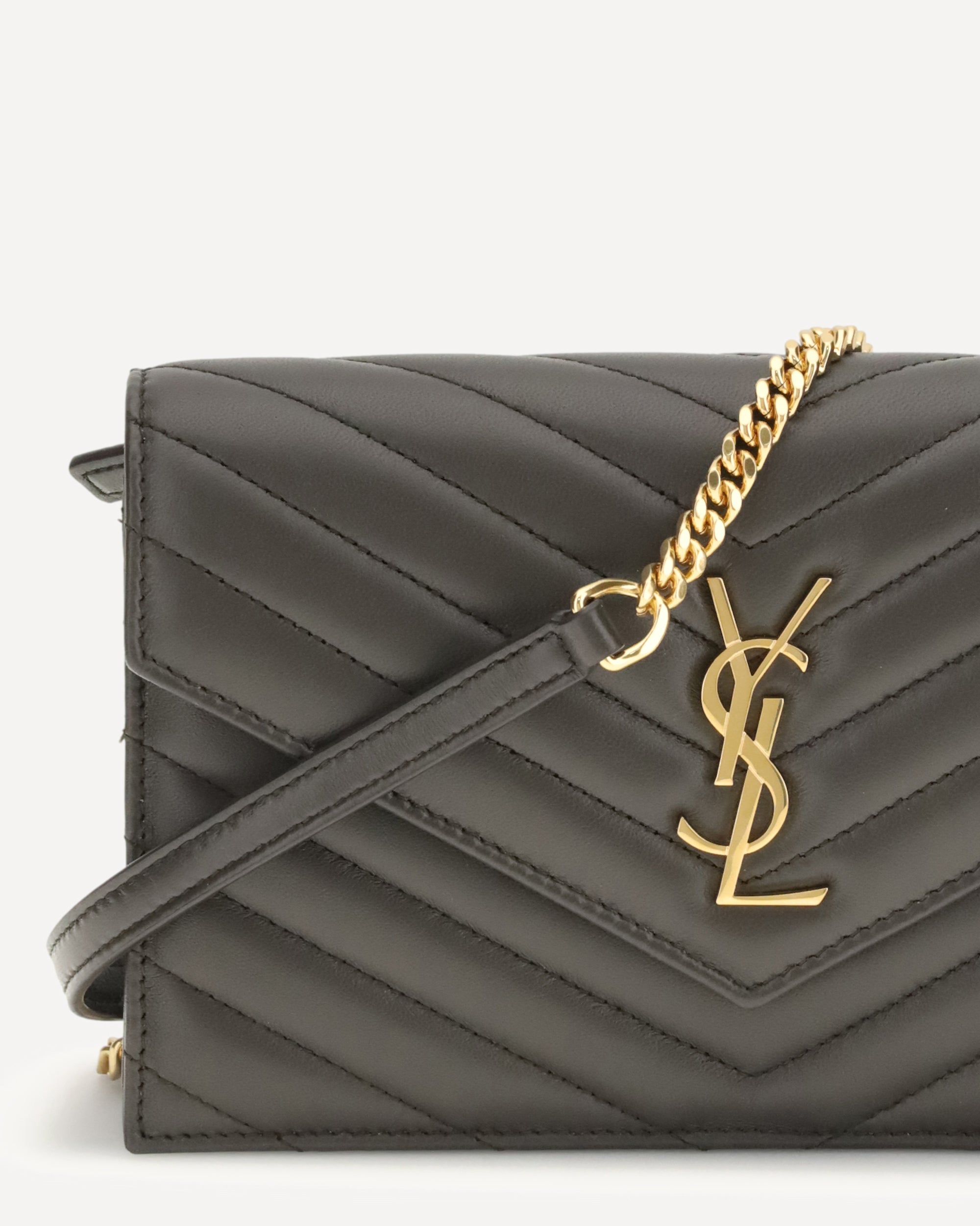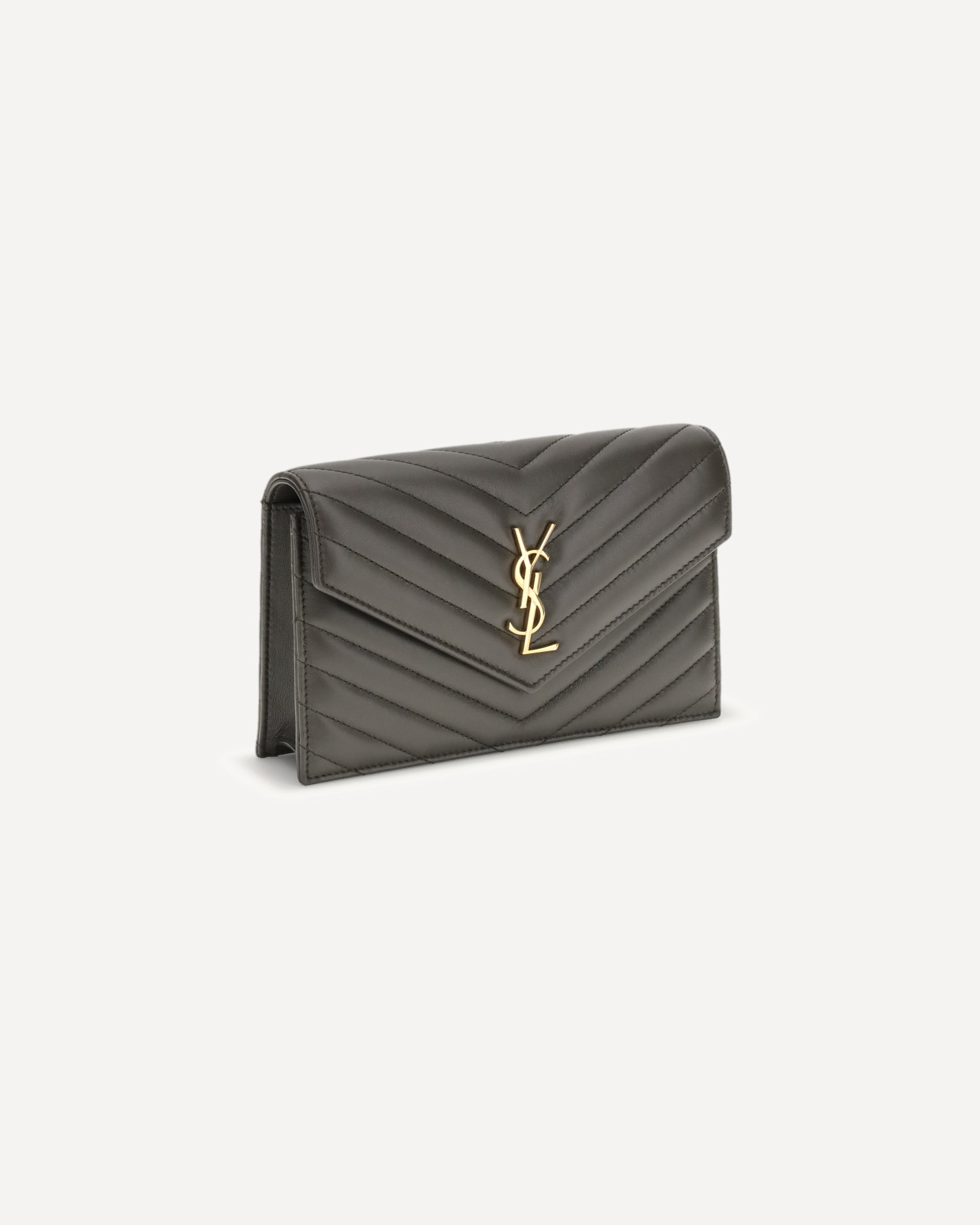 Il Portafoglio Envelope Cassandre di Saint Laurent combina eleganza e funzionalità in un design raffinato. Realizzato in pelle a motivo chevron, è arricchito dall’iconico Monogram metallico sul fronte. Dotato di tracolla in catena metallica con spallina in pelle, offre versatilità nello stile. La chiusura con bottone automatico garantisce sicurezza, mentre l’interno è organizzato con una tasca a zip e una tasca applicata, perfetto per portare con sé gli essenziali con classe.