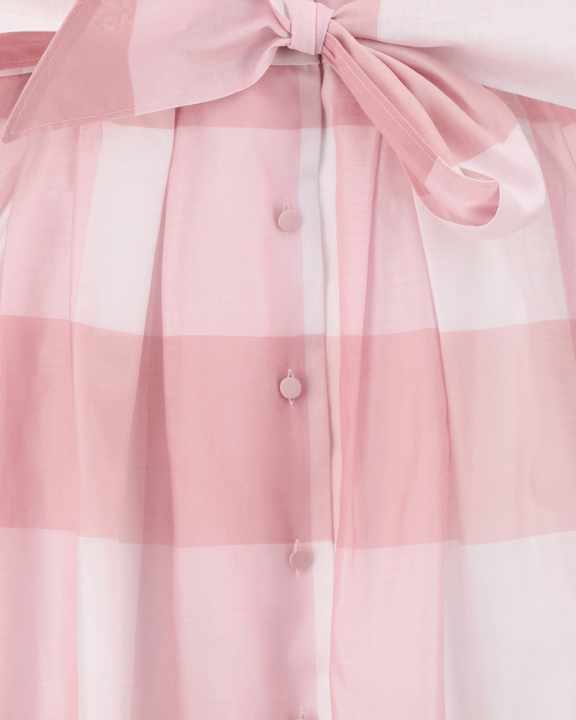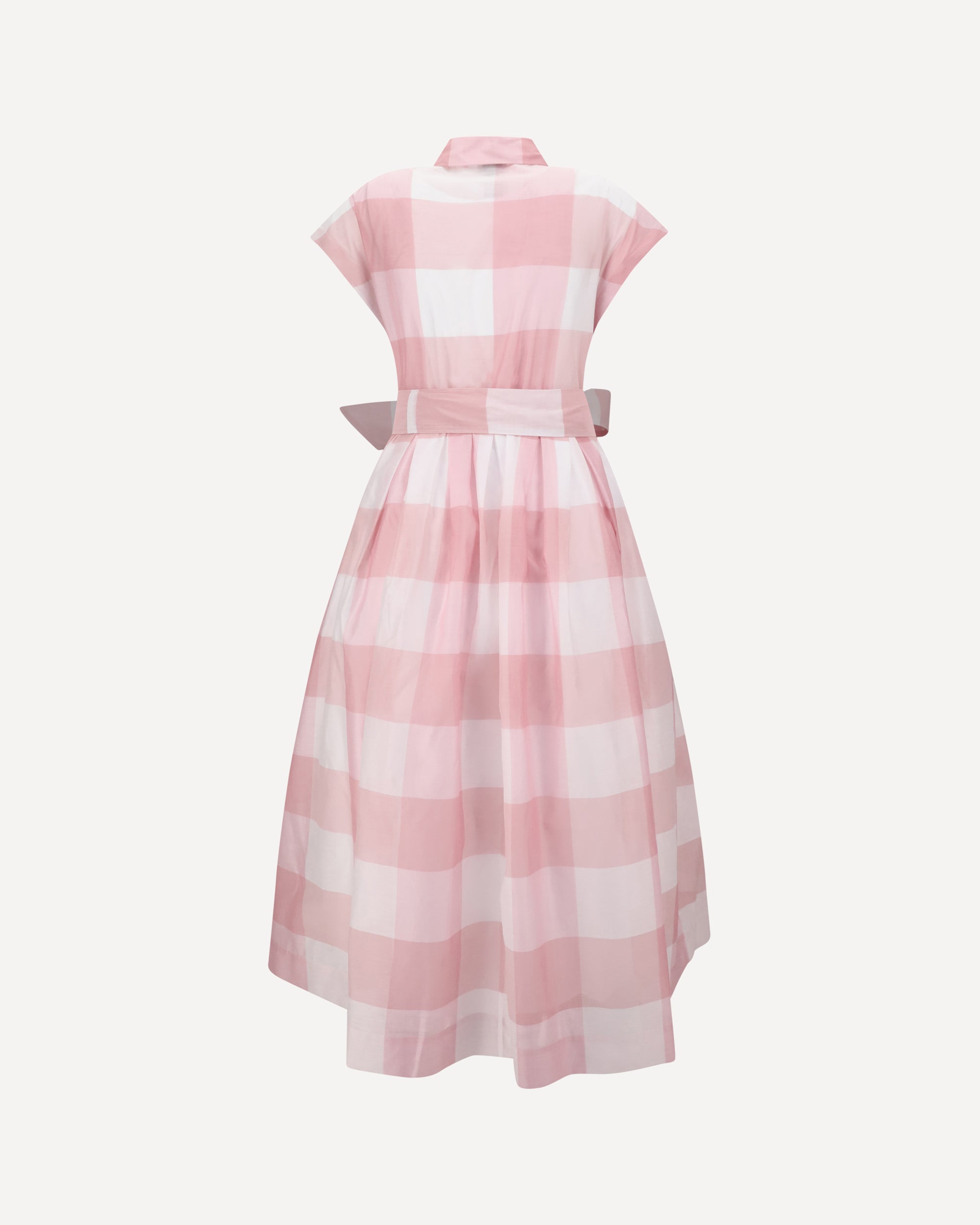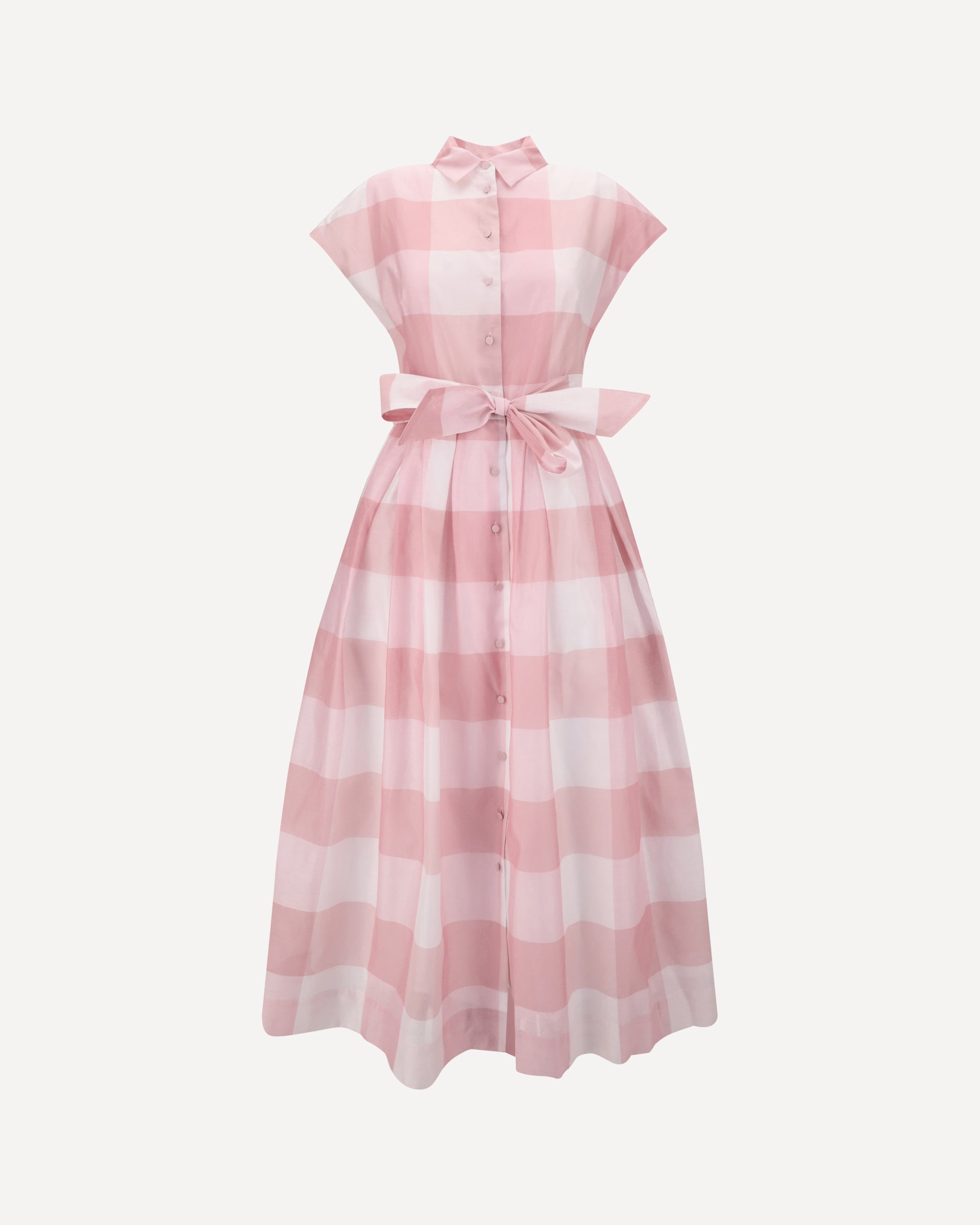 L’Abito chemisier a quadri di Sara Roka reinterpreta un classico con un tocco moderno e femminile. Caratterizzato da colletto classico, chiusura frontale con bottoni e maniche corte, è completato da una fusciacca abbinata annodabile in vita, che definisce la silhouette con eleganza e semplicità.