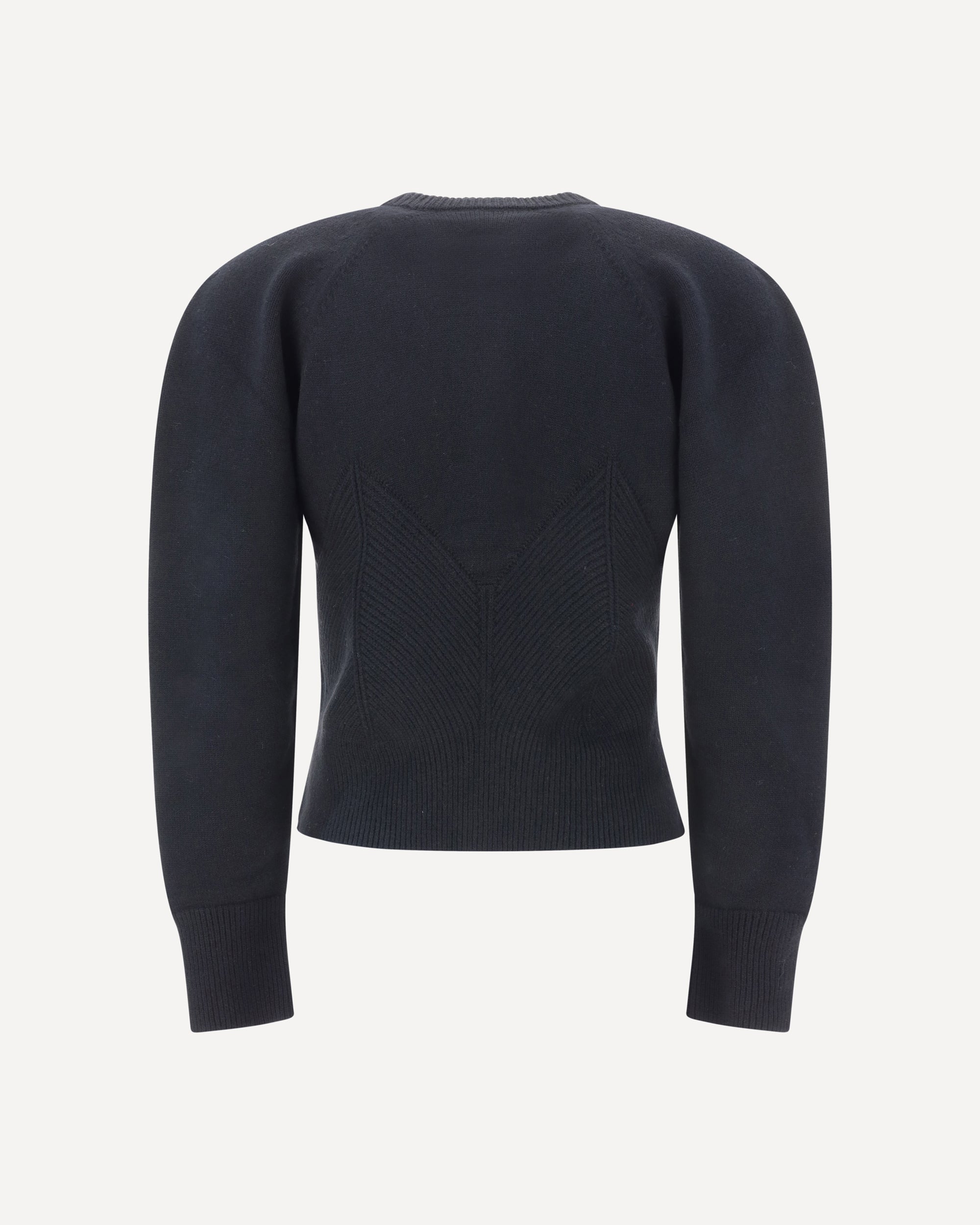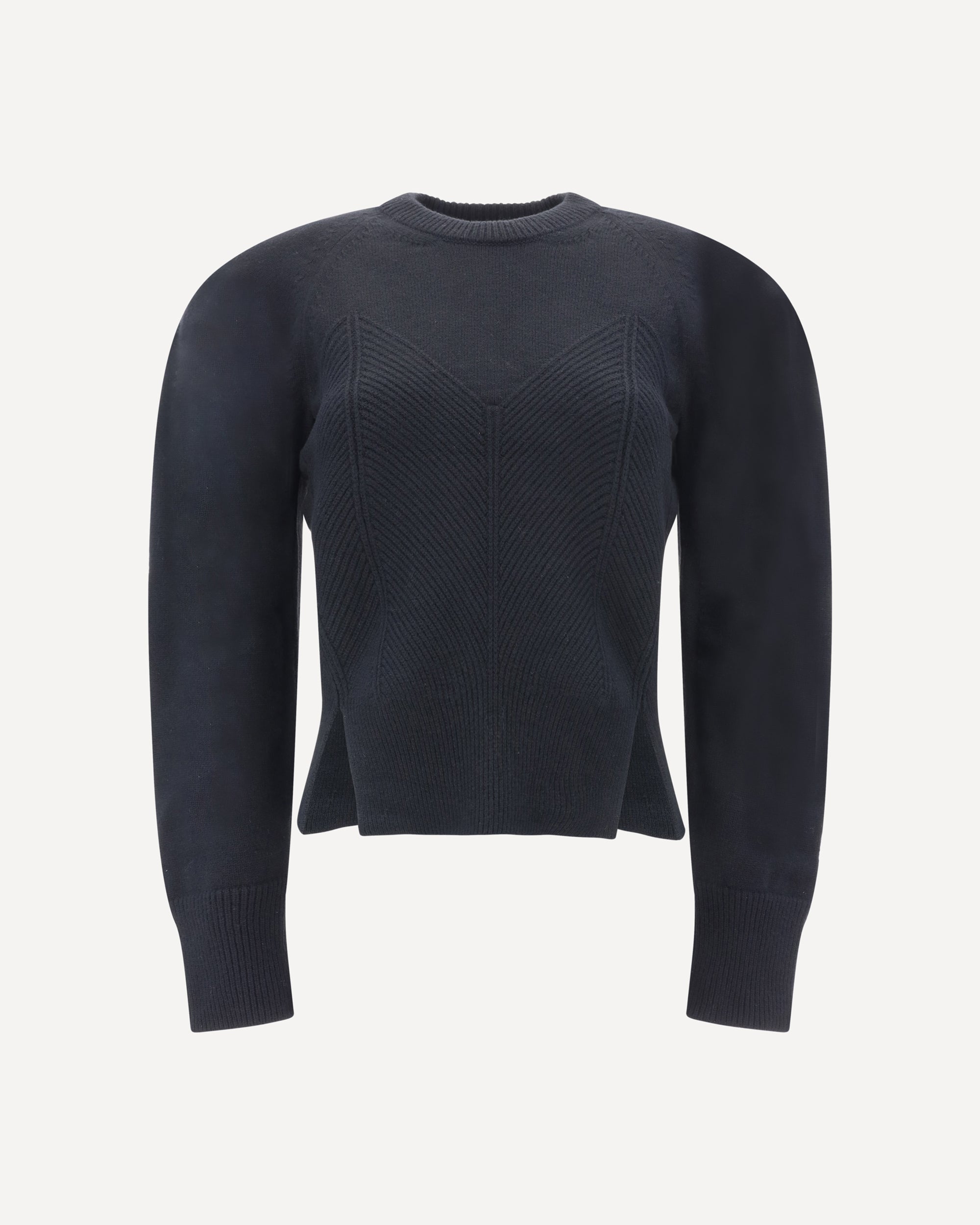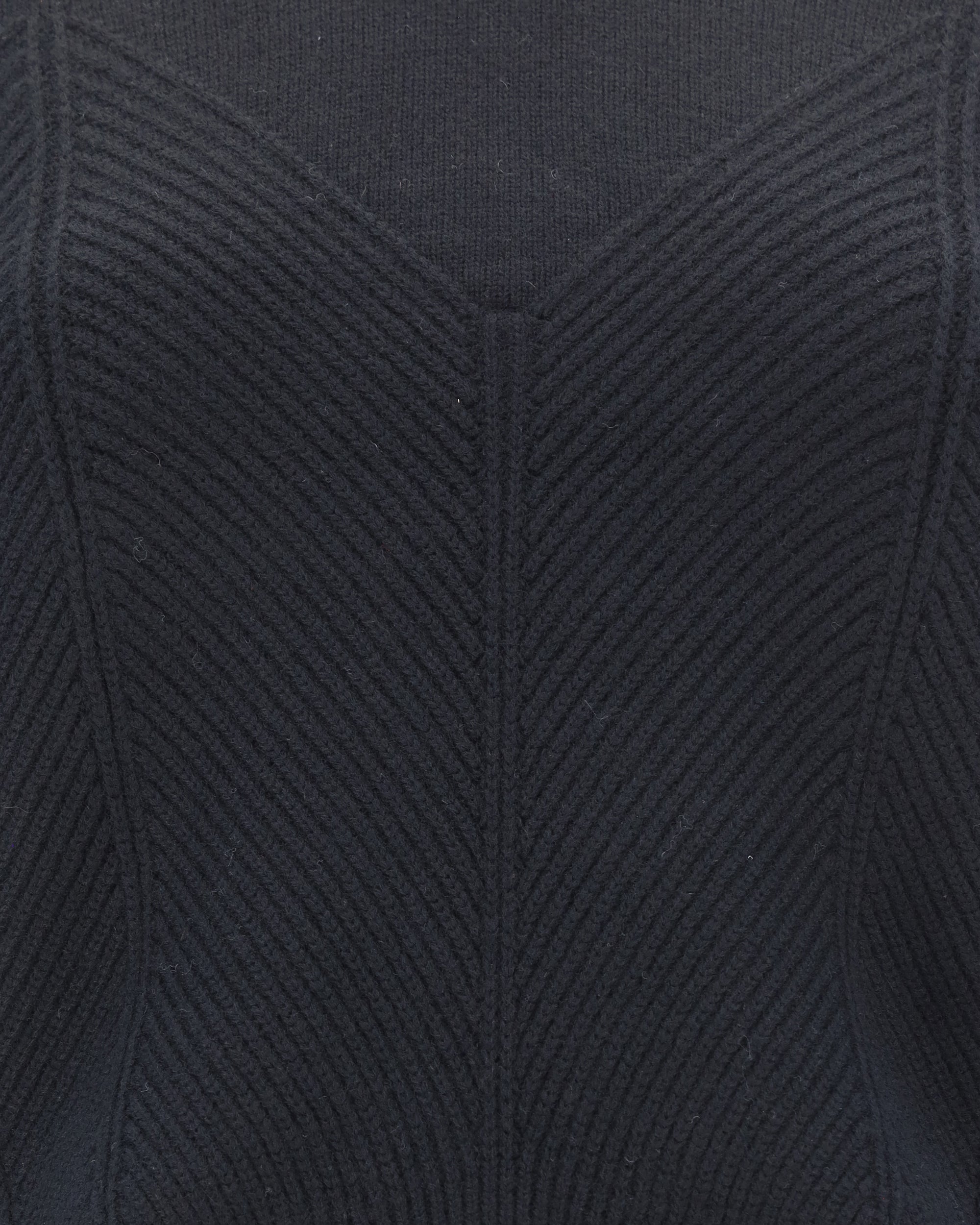 Maglione Corsetto in Lana di Alexander McQueen, girocollo costine, bustino Chevron ricamato su fronte e retro, polsi costine, orlo asimmetrico con dettagli cut-out.
