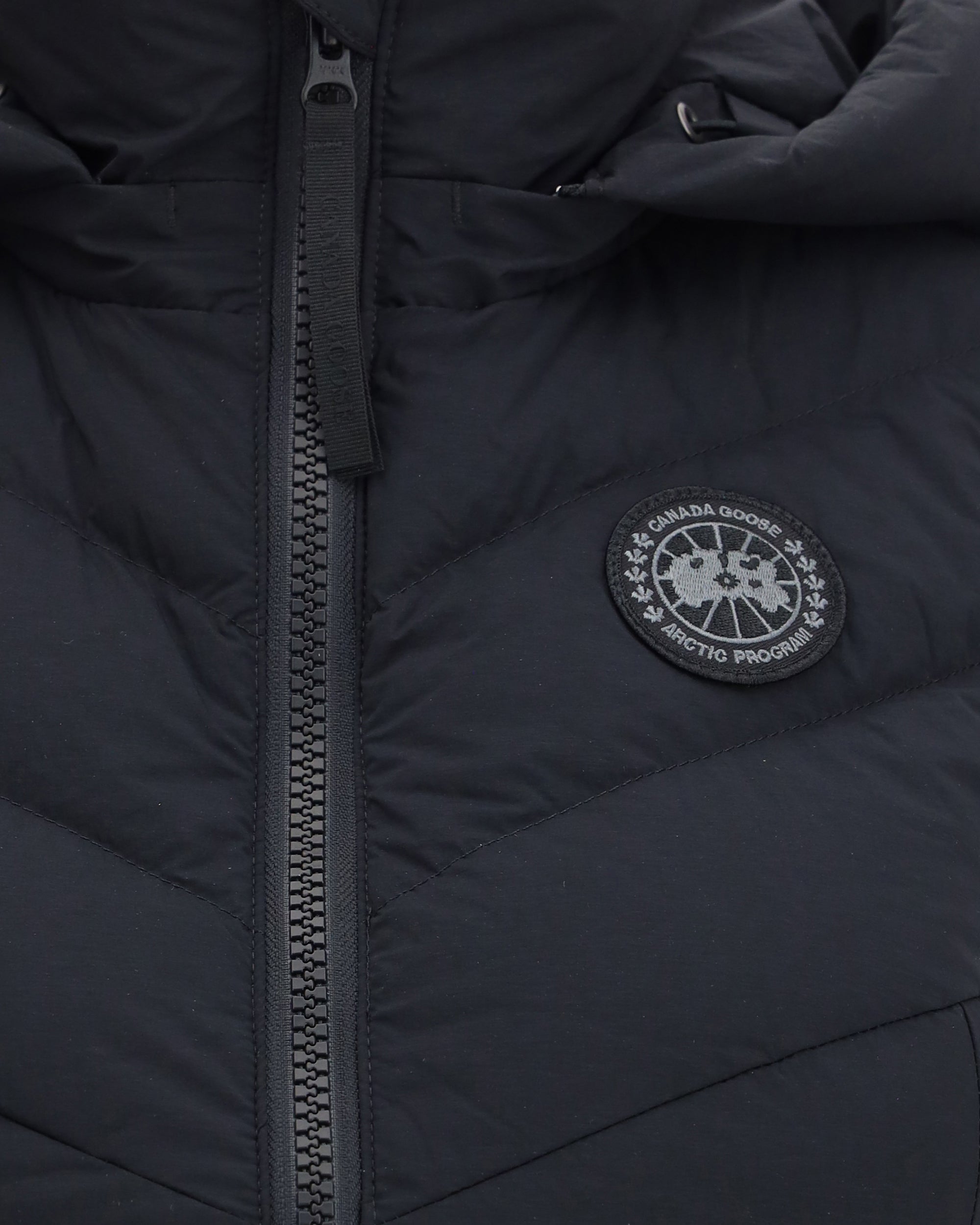 Il Gilet imbottito Clair Black Label di Canada Goose è dotato di cappuccio rimovibile con cordino interno regolabile e cerniera bidirezionale. Presenta una mentoniera in tricot scamosciato, due tasche esterne per le mani con cerniera e fodera in pile, oltre a una tasca interna di sicurezza con cerniera, unendo praticità e comfort.