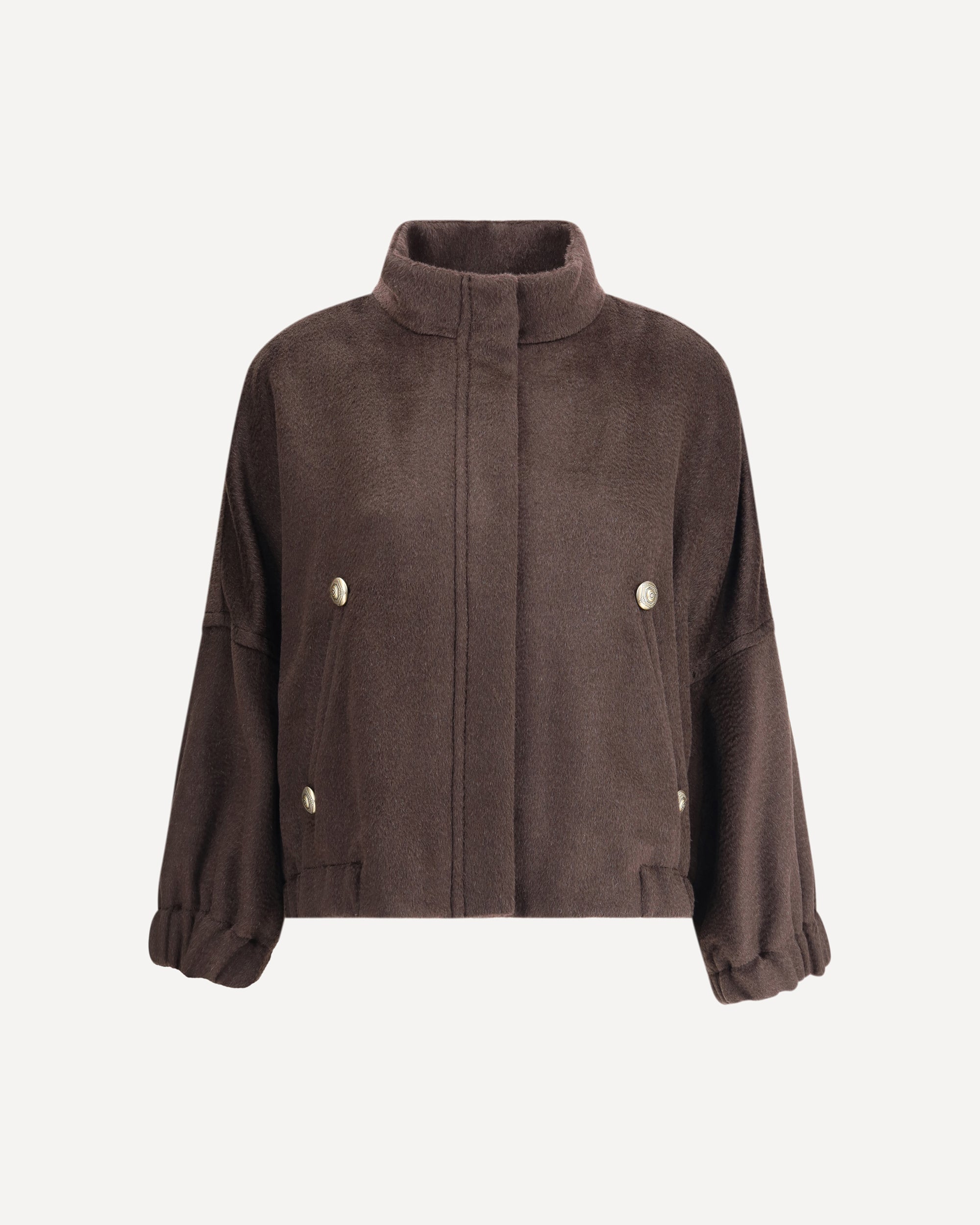 Il Cappotto caban di Giorgio Armani è un capo corto realizzato in un pregiato mix di alpaca e lana, caratterizzato da una mano morbida e calda. La silhouette contemporanea si distingue per i volumi over, accentuati dalle ampie maniche che terminano con polsini e fondo elasticizzati. Il collo alto e la chiusura frontale nascosta conferiscono una linea pulita ed essenziale, mentre i bottoni metallici a vista e le tasche frontali a filetto aggiungono un dettaglio raffinato e distintivo.