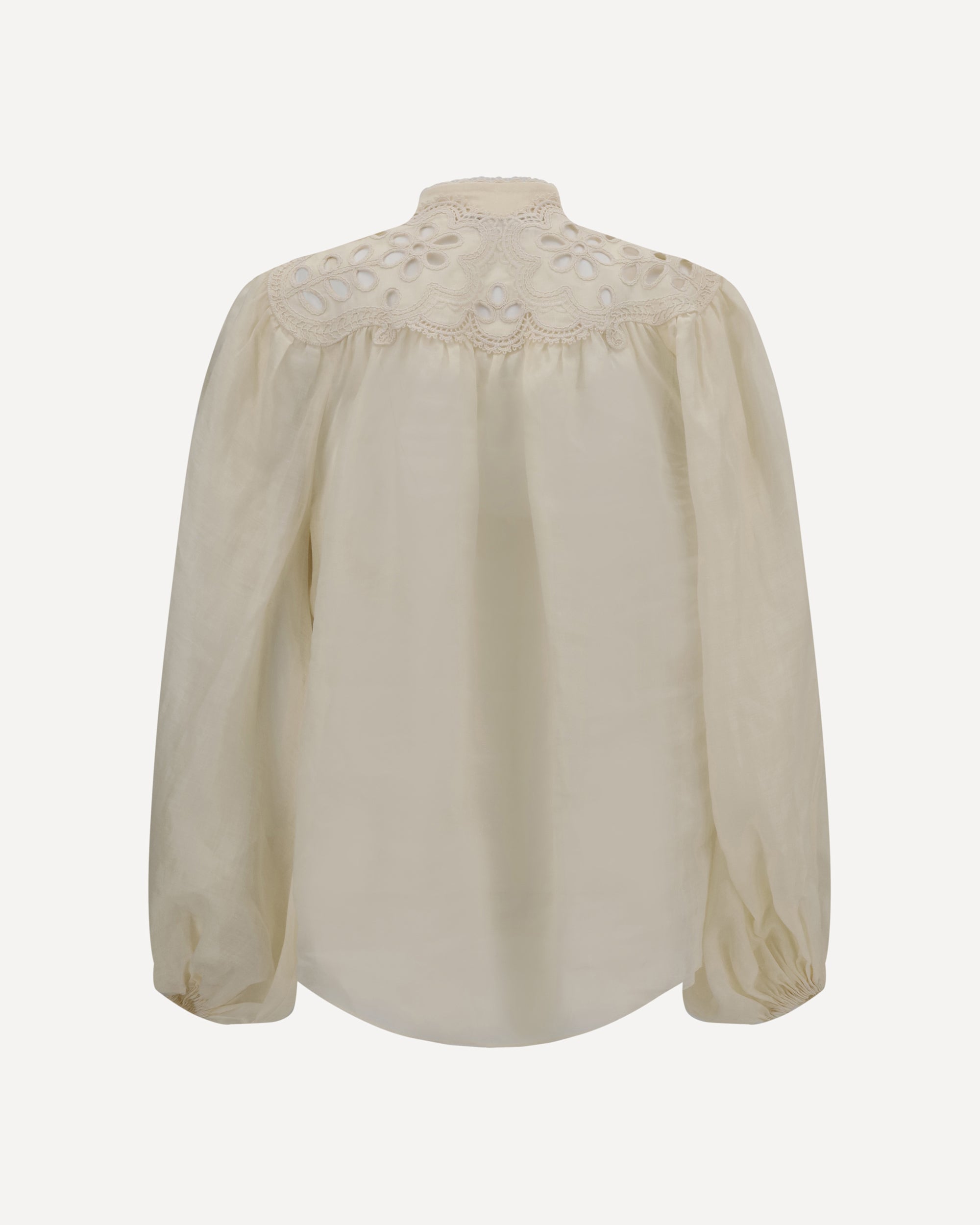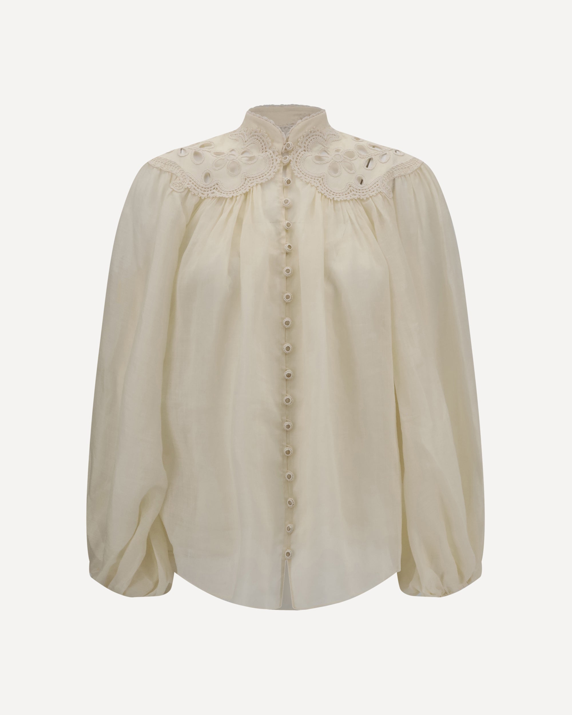 La Blusa Coco ricamata di Zimmermann è un capo romantico e raffinato, realizzato in leggero ramiè naturale al 100%. Caratterizzata da maniche lunghe a sbuffo con polsini elastici, presenta un elegante collo alto impreziosito da un delicato orlo smerlato con inserti in pizzo. Il corpetto arricciato e il dettaglio a carré sulle spalle valorizzano la silhouette con femminilità, mentre la chiusura frontale con bottoni rivestiti e asole a cordoncino aggiunge un tocco vintage. Un capo ricco di dettagli artigianali, perfetto per look sofisticati dal fascino senza tempo.