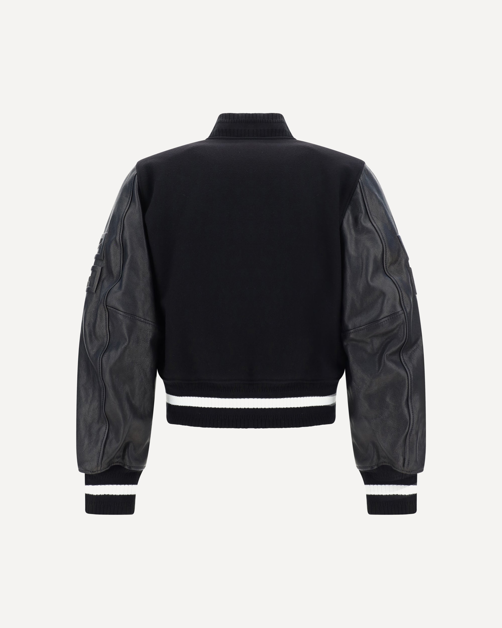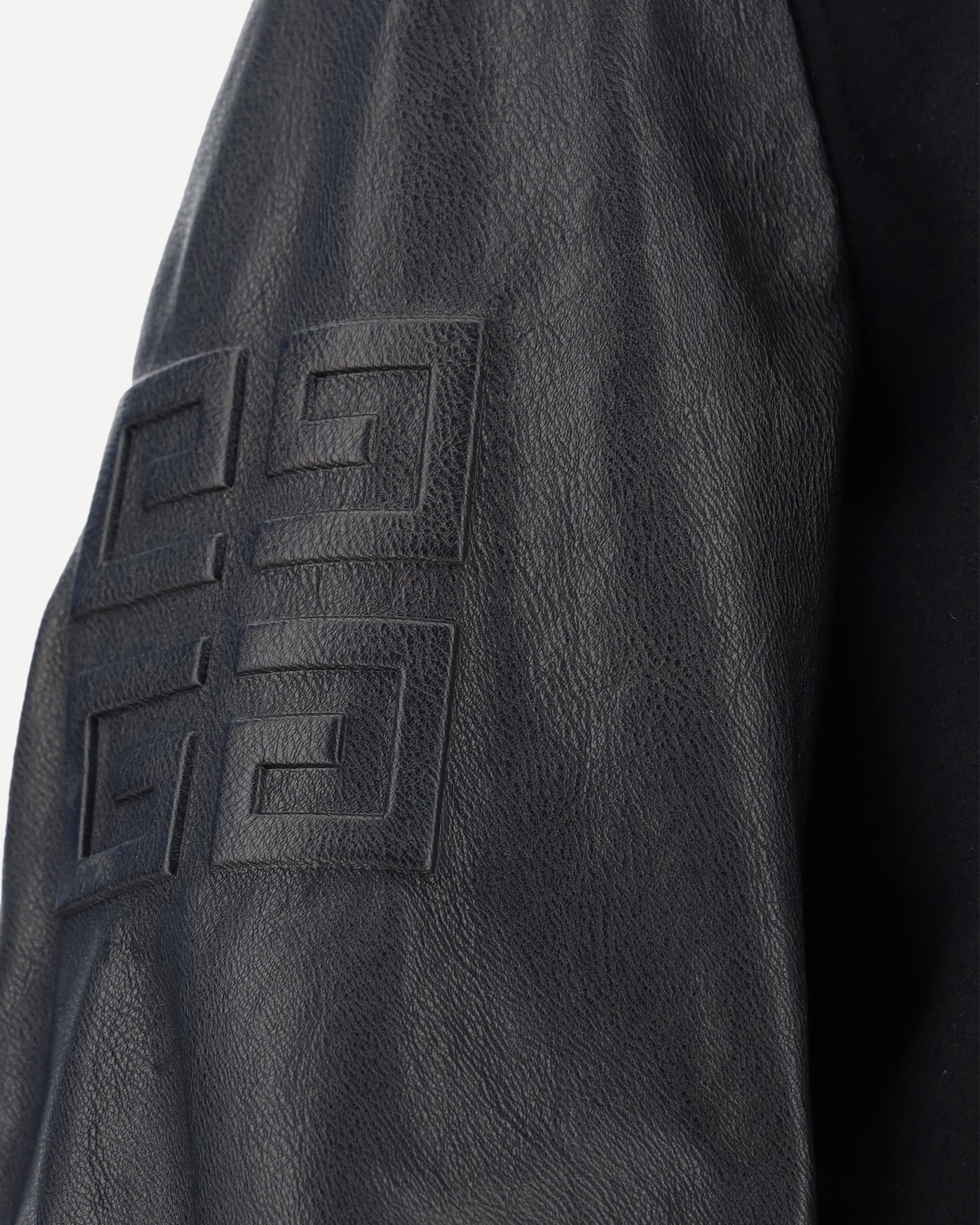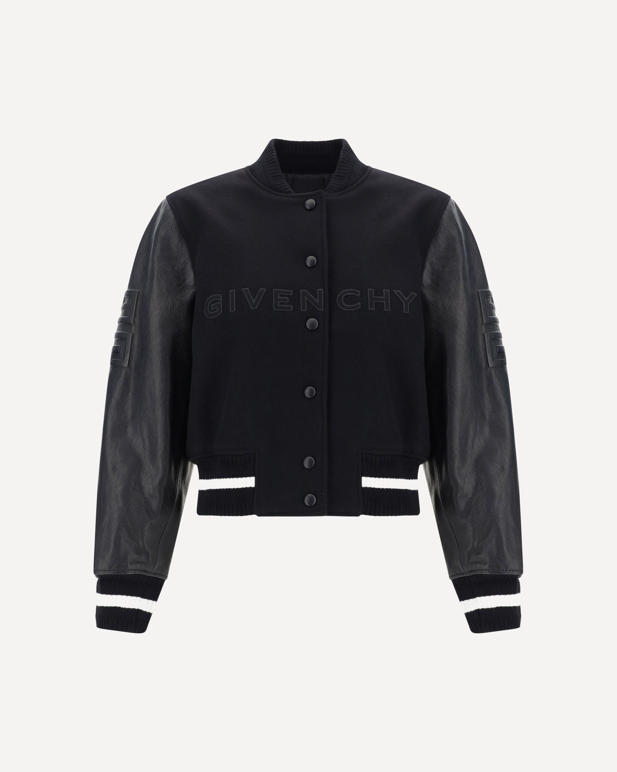 Giacca College in Lana di Givenchy, chiusura frontale con bottoni a pressione, colletto classico a costine, polsini a costine, due tasche a filetto laterali, orlo a costine, iconico monogramma brand in rilievo sulle maniche, vestibilità regular.