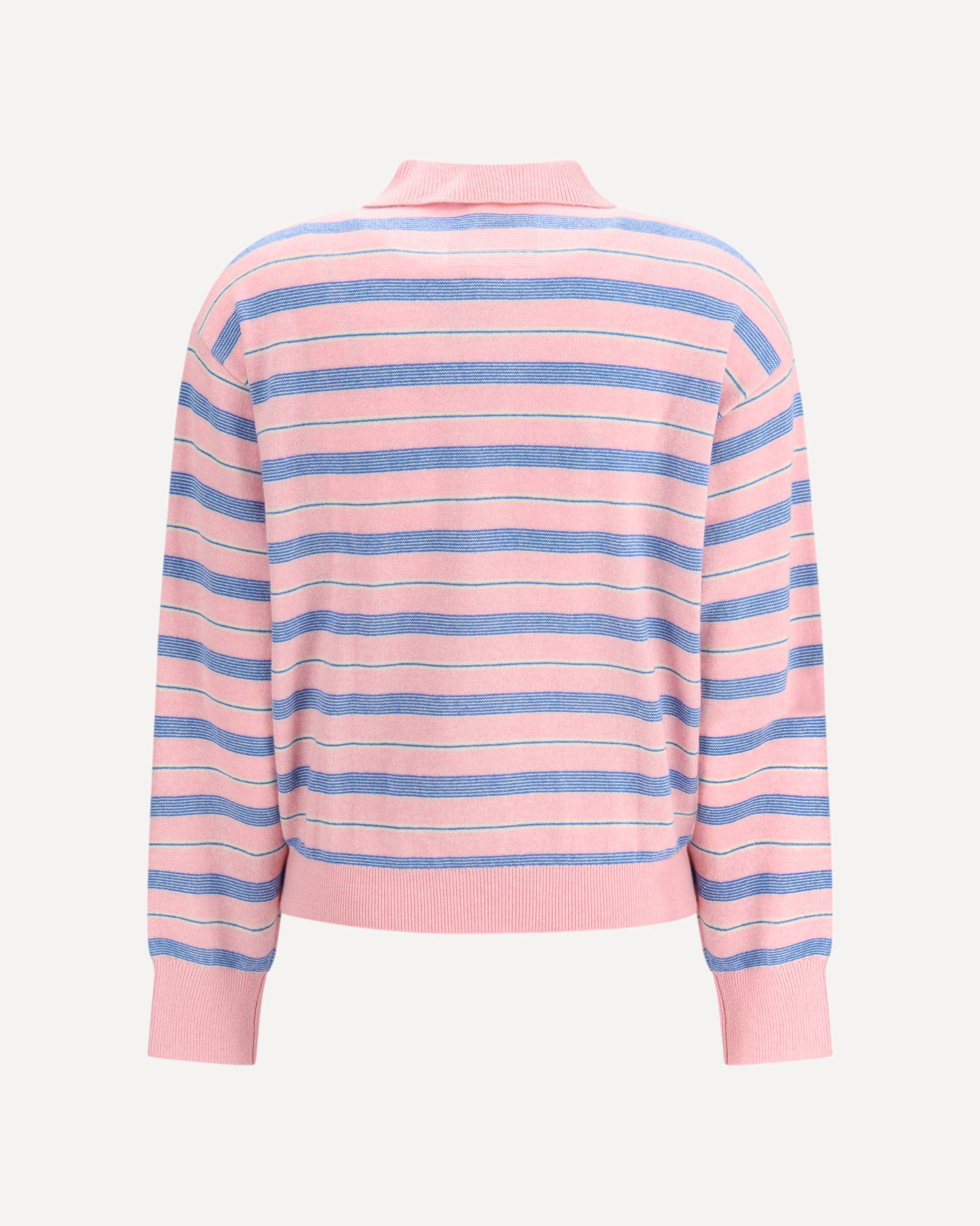 La Polo Collegiate Stripe di Guest in Residence è una polo in 100% cashmere leggero, caratterizzata da un fit rilassato e dalle classiche righe pulite che evocano uno stile sportivo ma raffinato. Il modello presenta un colletto a polo lavorato a coste, chiusura frontale con tre bottoni, polsini e fondo a costine, oltre al logo distintivo GIR sul retro del collo. Un capo elegante e versatile, perfetto per aggiungere un tocco di comfort lussuoso a qualsiasi look casual.