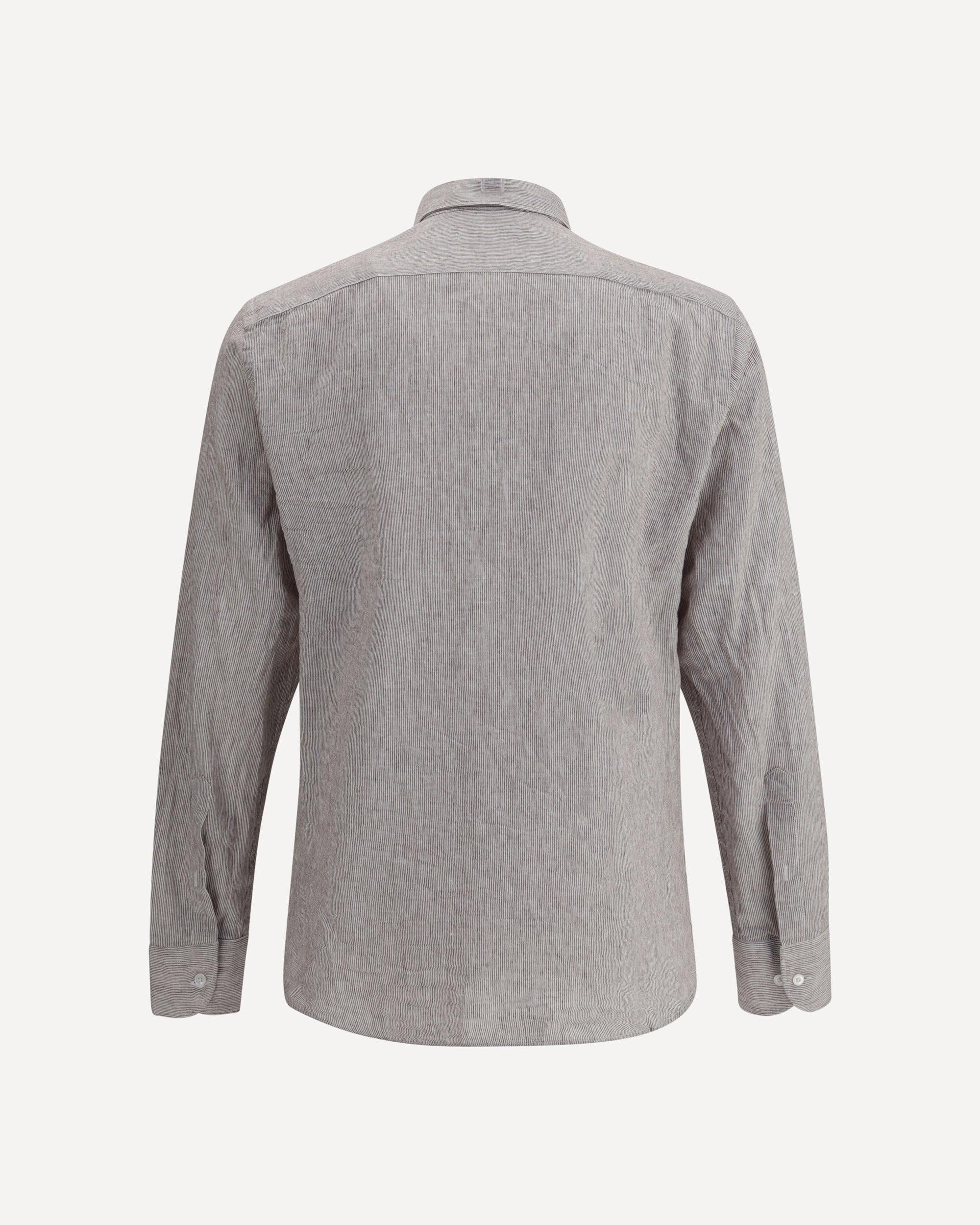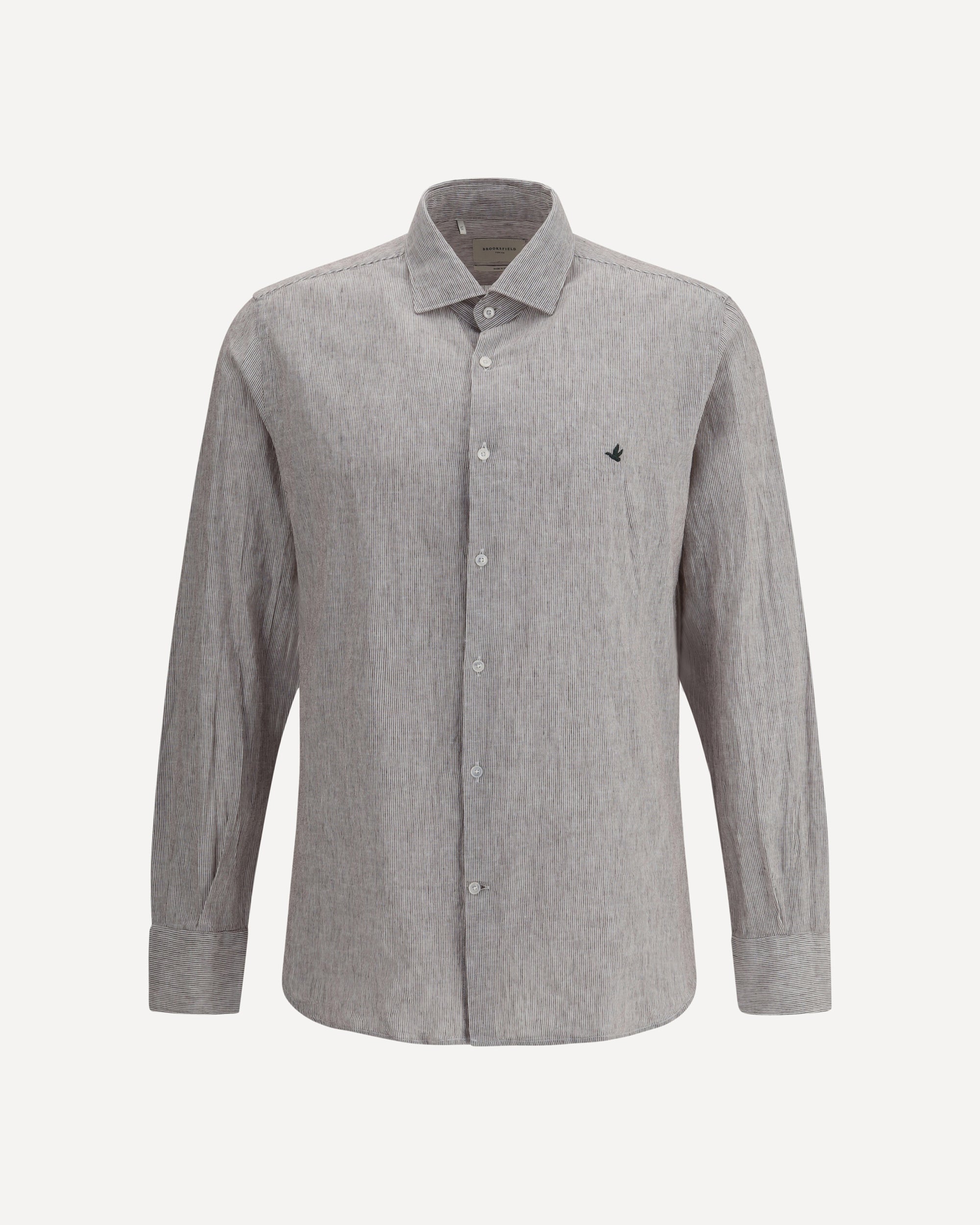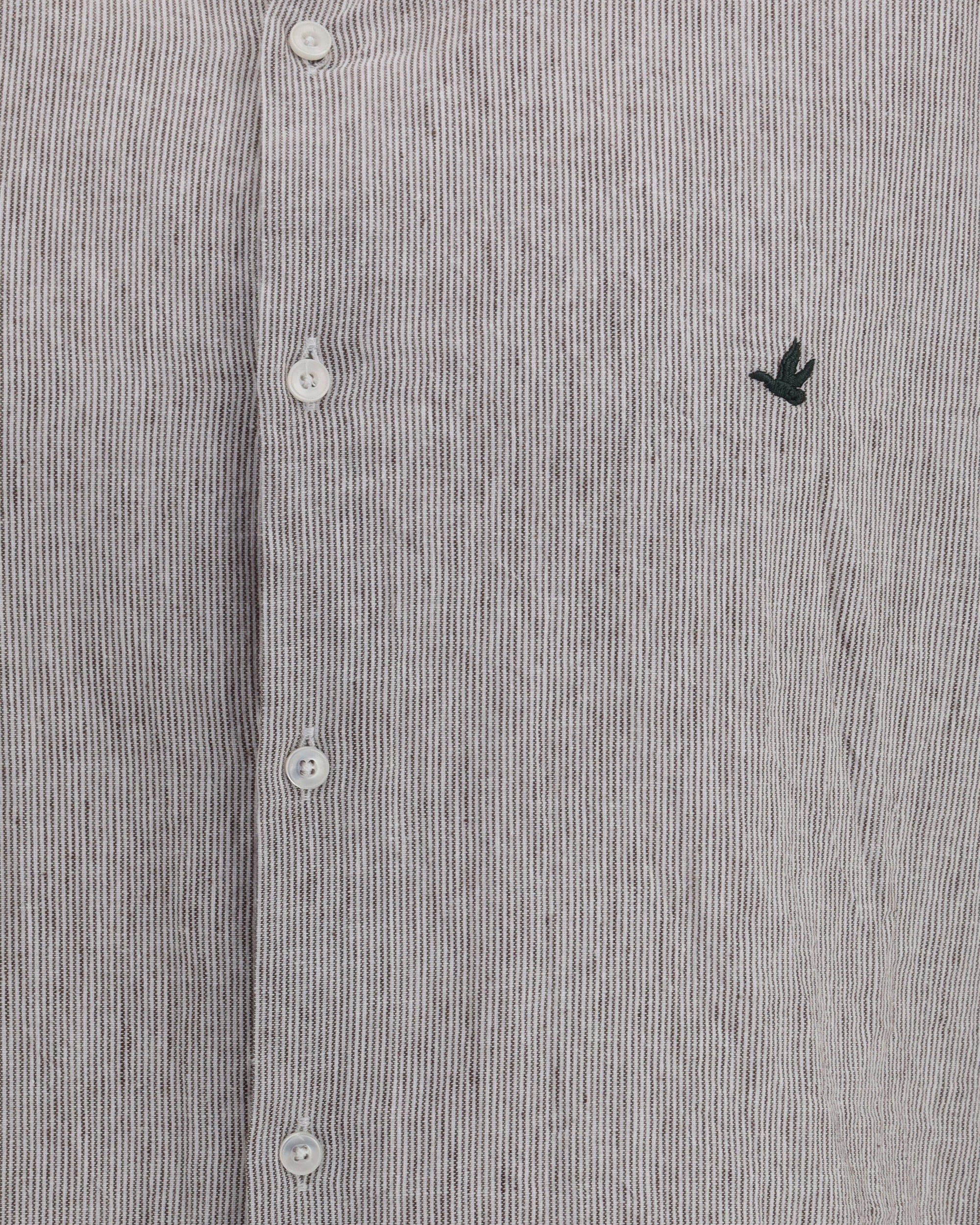 La Camicia in cotone e lino a righe di Brooksfield è pensata per offrire comfort e stile nelle giornate più calde. Presenta un colletto classico, chiusura frontale con bottoni e polsini regolabili con bottoncini. La fantasia a righe dona un tocco fresco e dinamico, mentre l’iconico logo ricamato sul petto aggiunge una nota distintiva al design.