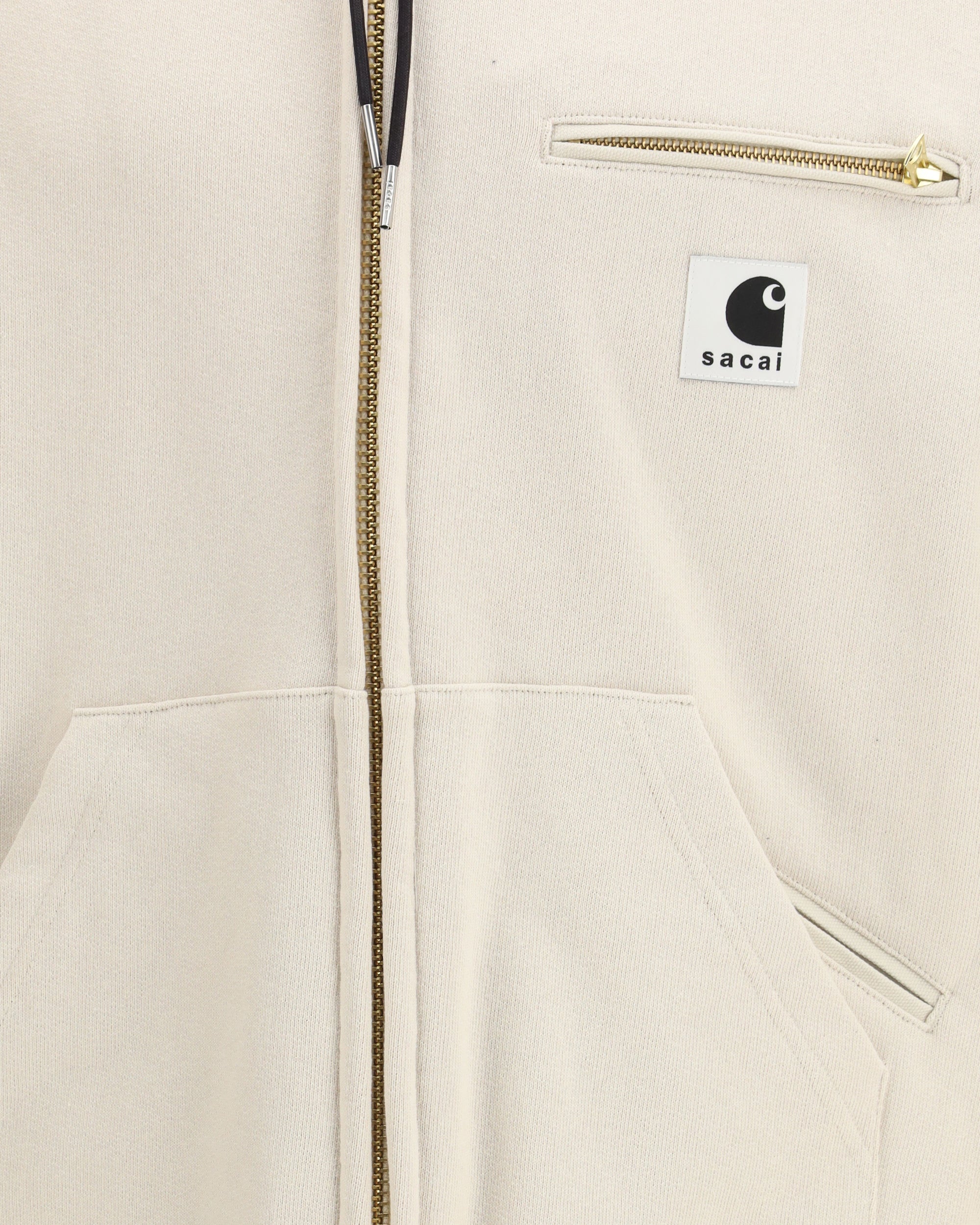 La Felpa in jersey di cotone Sacai + Carhartt WIP presenta un design ibrido che unisce la silhouette iconica di Sacai ai dettagli funzionali della Detroit Jacket di Carhartt WIP. Il modello è dotato di cappuccio con coulisse e chiusura frontale con zip, tasche a filetto sul davanti, tasca sul petto con zip con inserti in Dearborn Canvas e tasca a marsupio. L’interno spazzolato assicura comfort e calore, mentre l’etichetta co-branded completa il capo.