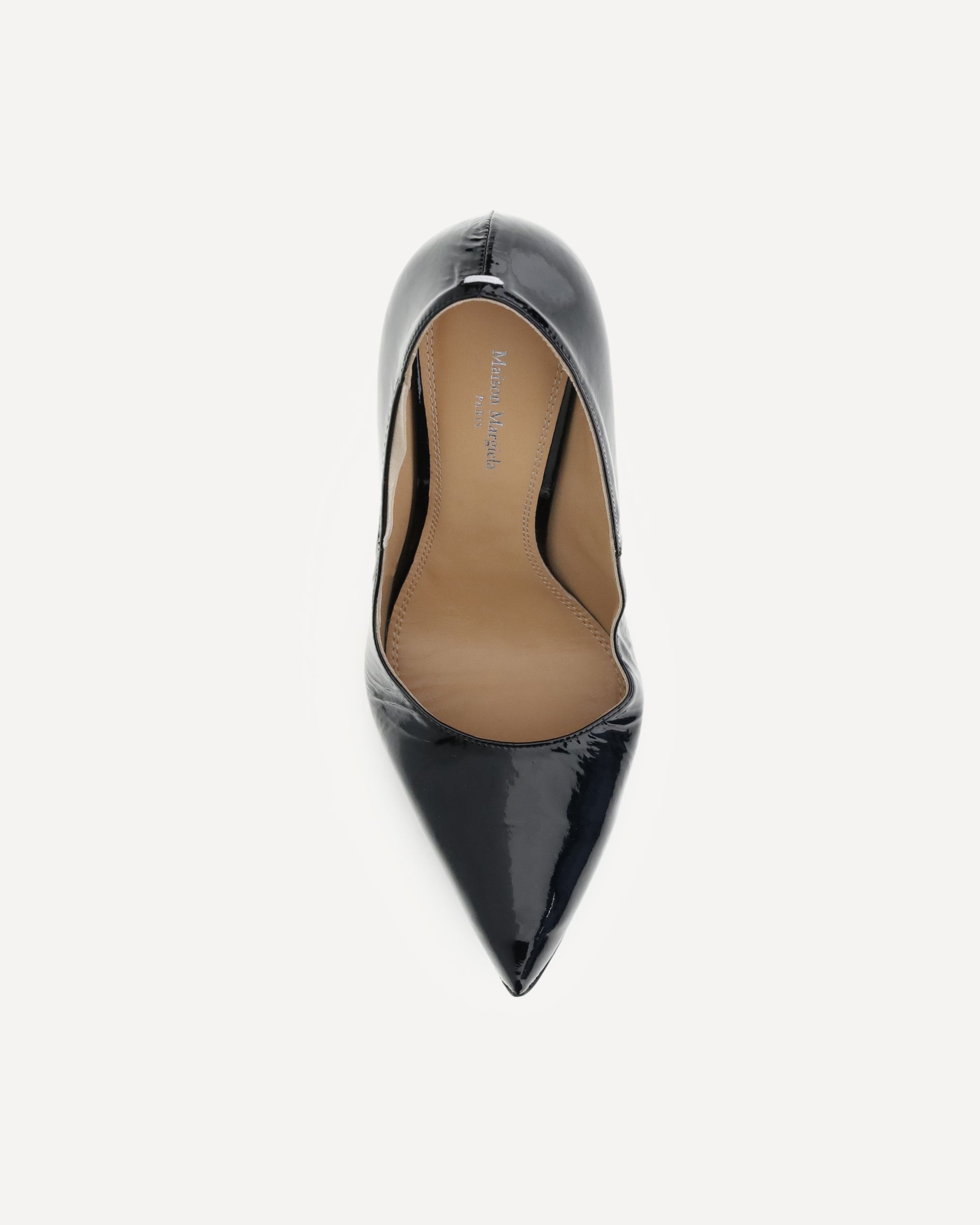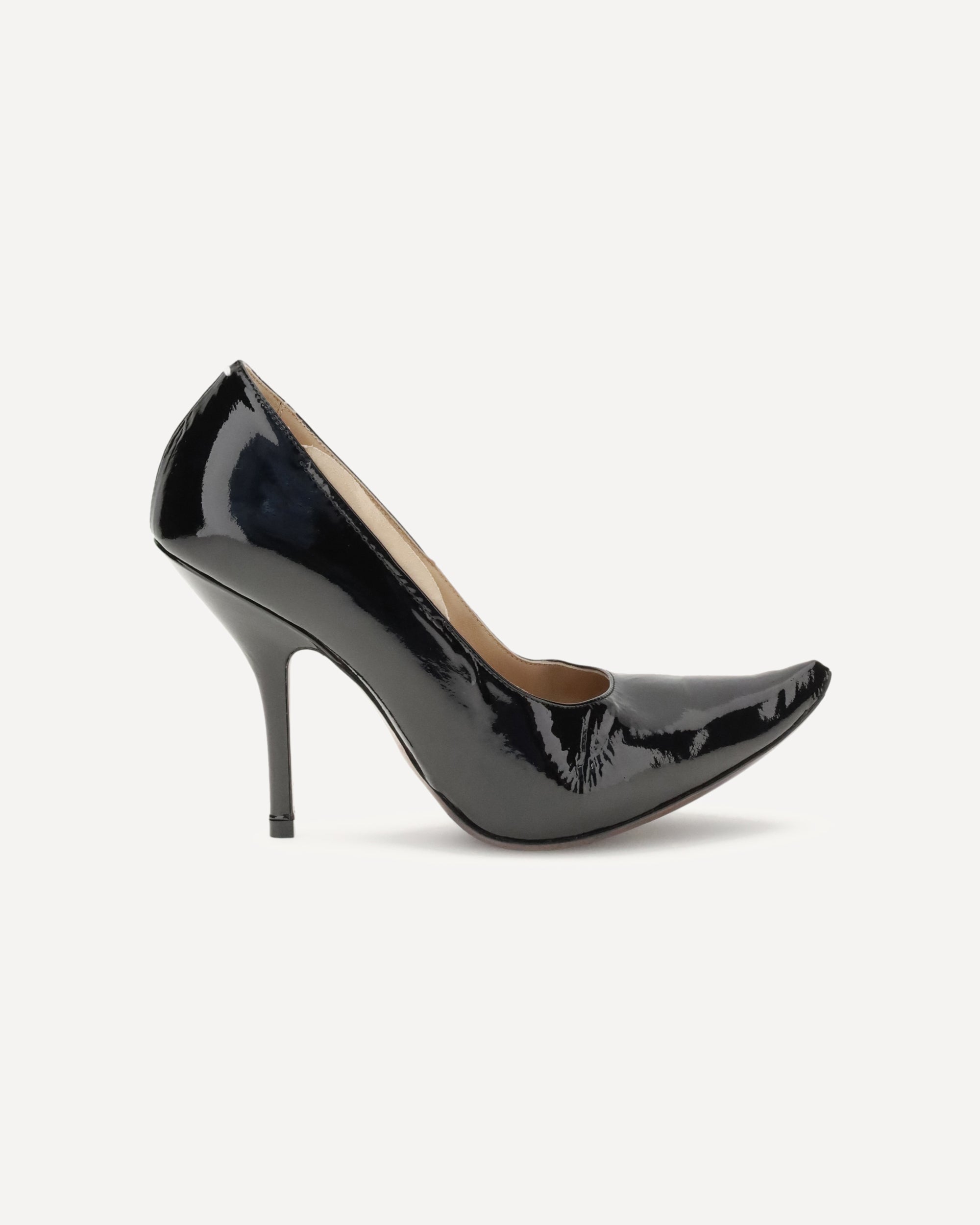 Le Décolleté Loved to Death di Margiela reinterpretano l’eleganza classica con un tocco narrativo e concettuale. Realizzate in pelle di capra verniciata lucida, presentano dettagli artigianali modellati a mano che evocano i segni del tempo, rendendo ogni paio unico. La silhouette affusolata è definita da una piega verso l’alto sulla punta, che dona slancio e carattere. La suola in pelle di vitello, verniciata a mano e leggermente sabbiata, racconta la “storia vissuta” della scarpa, mentre la caratteristica impuntura bianca sul retro firma con discrezione l’identità della maison.
