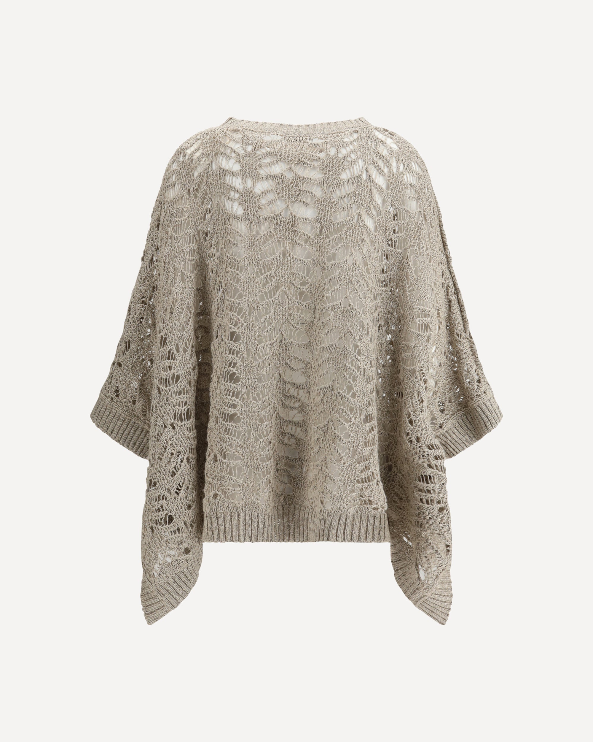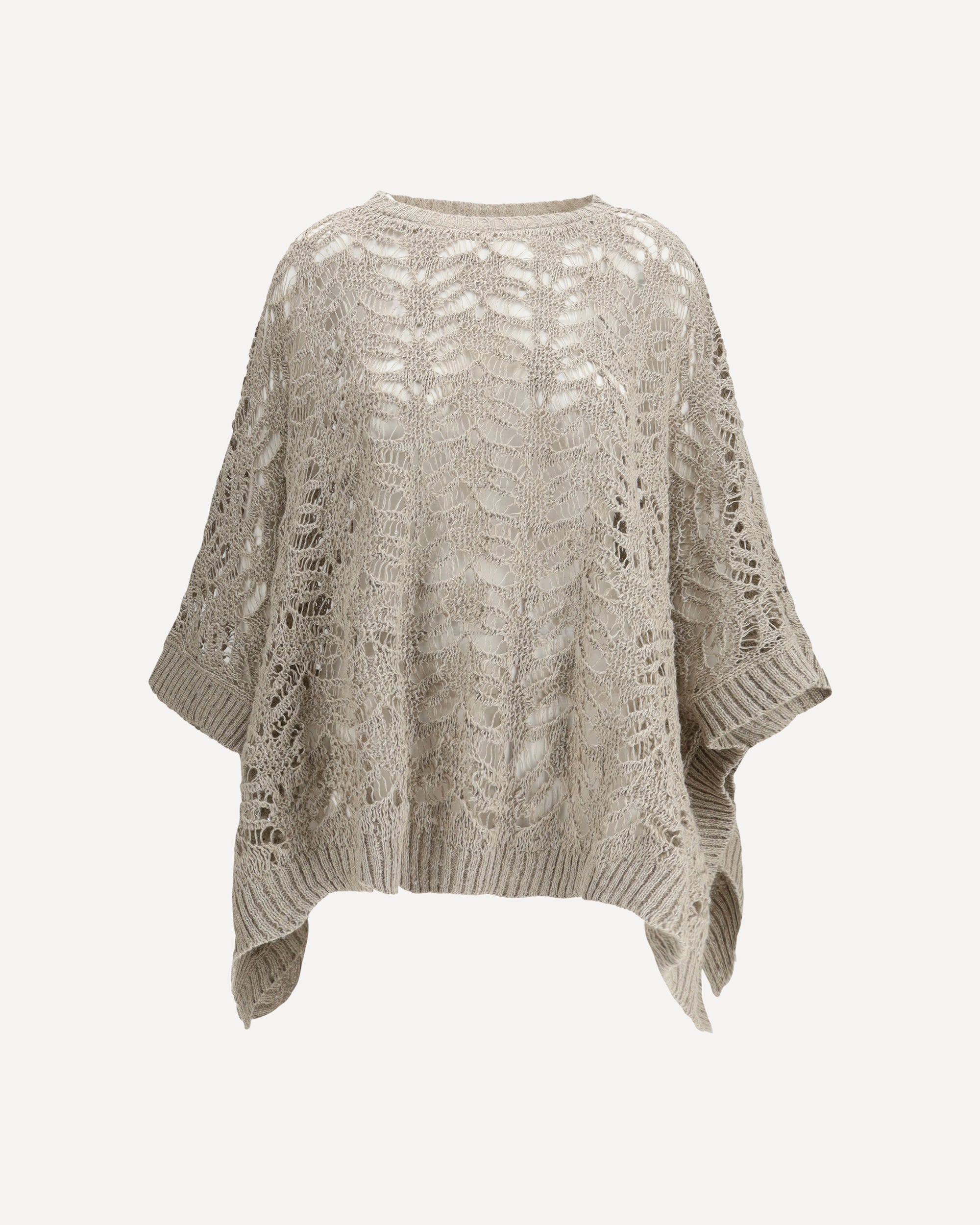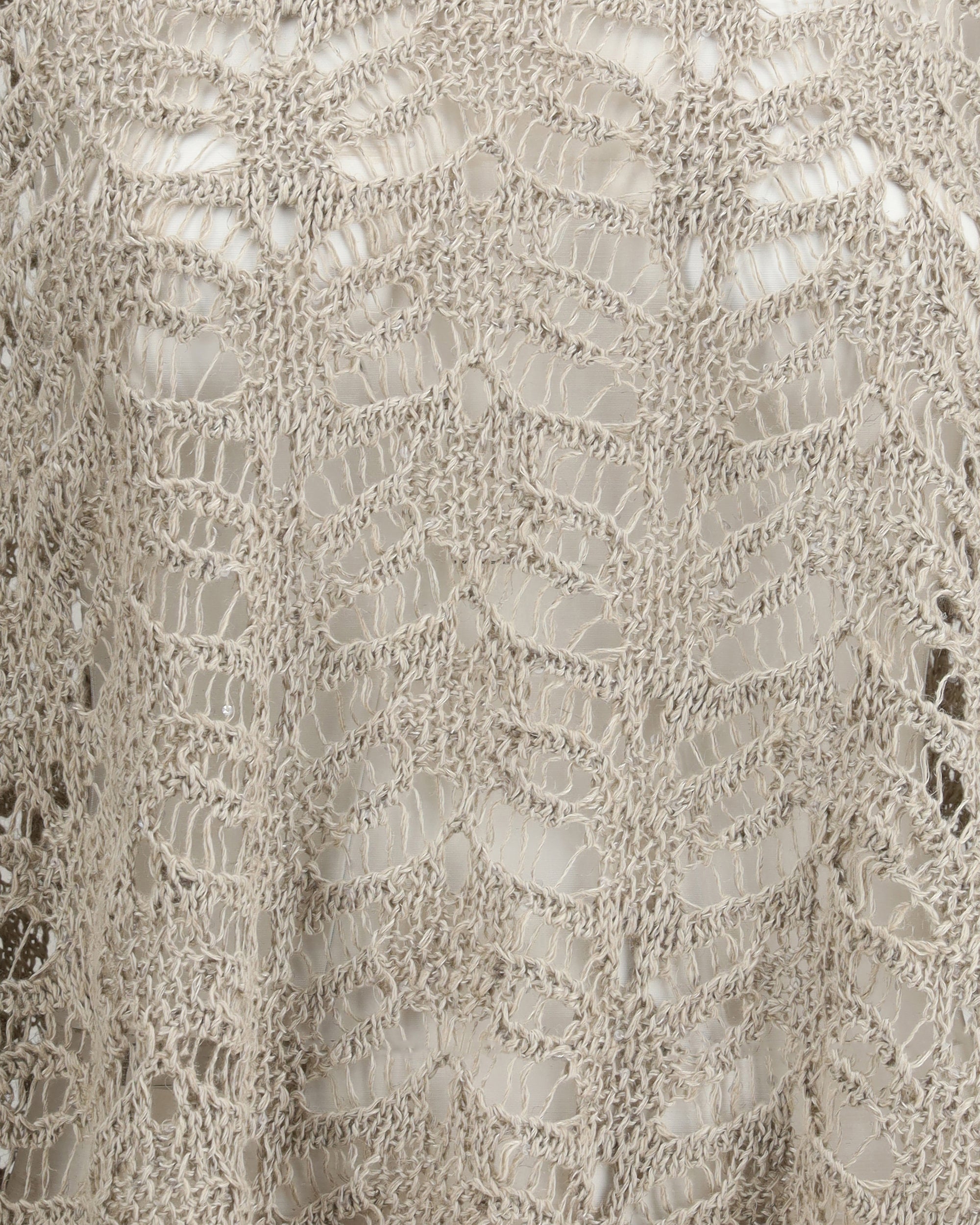 Il Poncho di Brunello Cucinelli è un capo raffinato e luminoso, che interpreta con eleganza lo stile artigianale. Realizzato con un delicato design traforato all’uncinetto, presenta un girocollo e un orlo a coste che donano struttura e definizione alla silhouette fluida del capo. L’intera superficie è impreziosita da piccole paillettes trasparenti cucite all-over, che riflettono la luce con discrezione, regalando un effetto brillante ma mai eccessivo. Un poncho sofisticato, perfetto per aggiungere un tocco di classe e femminilità a ogni look, sia di giorno che di sera.
