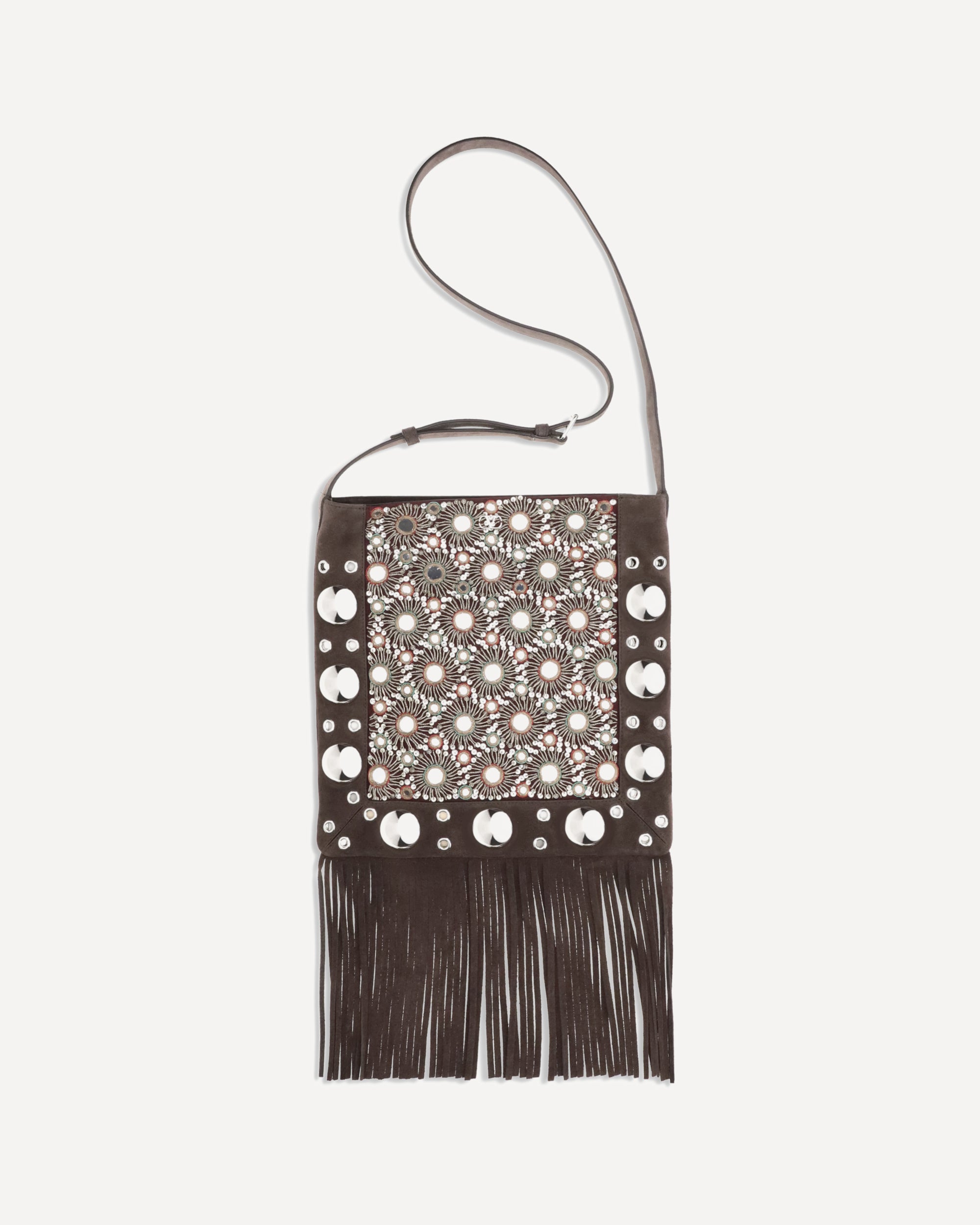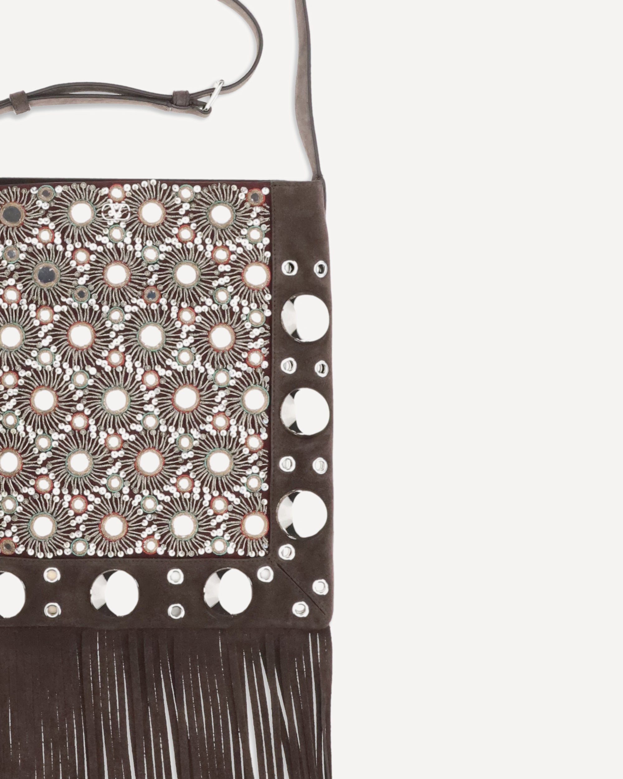 La Borsa a Spalla Nellcôte di Valentino Garavani è un accessorio dallo spirito boho-chic, impreziosito da un ricercato ricamo di specchietti in resina e strass, completato da frange decorative che ne esaltano il movimento. Il profilo in suede è rifinito con borchie a sfera e rivetti, per un tocco grintoso ma raffinato. Dotata di una tracolla regolabile in suede, può essere indossata comodamente a spalla o cross-body. Le parti metalliche con finitura palladio e il piccolo dettaglio con VLogo Signature aggiungono un accento iconico, mentre la fodera interna in suede completa il design con eleganza.