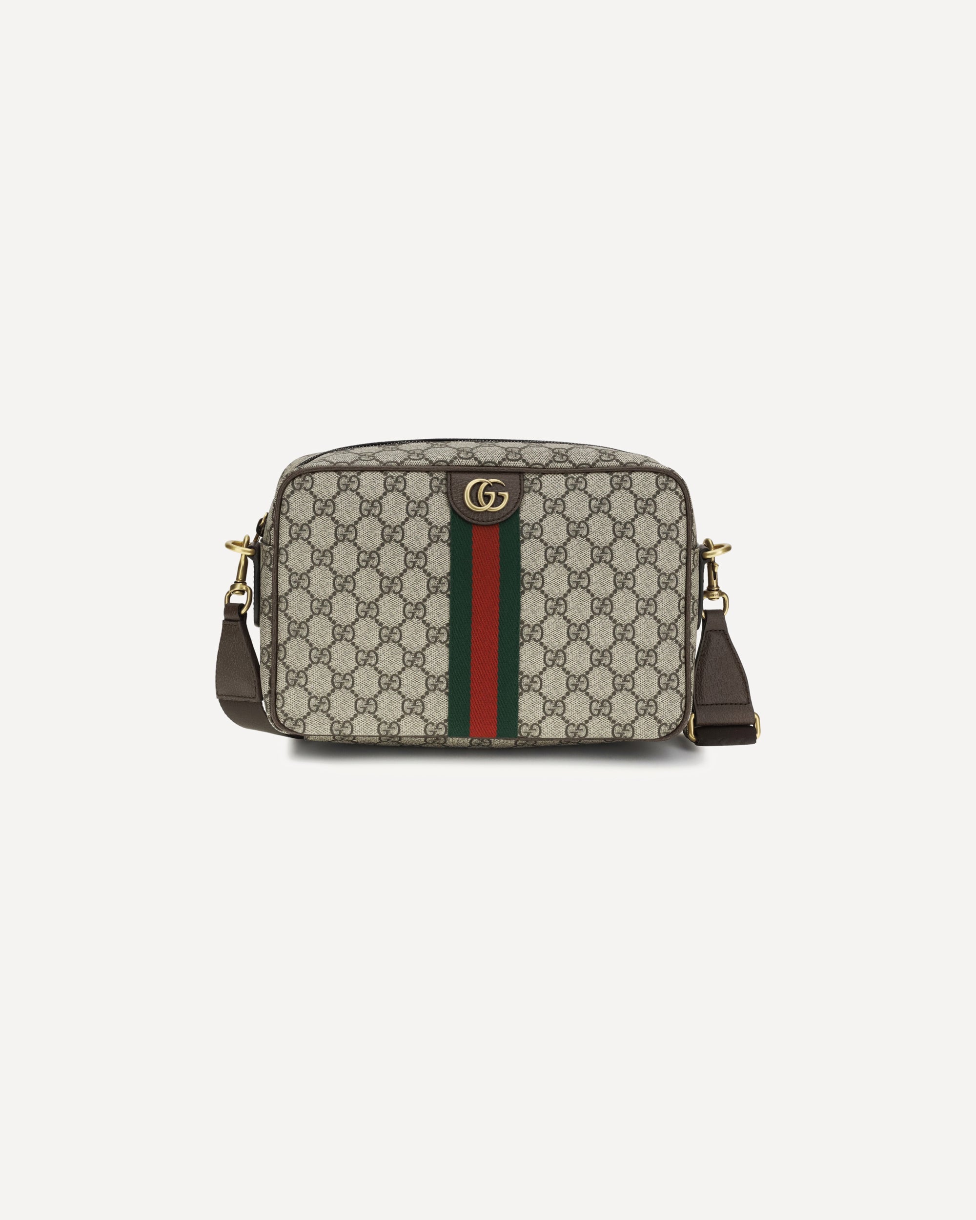 La Borsa a Tracolla in tela stampata di Gucci è realizzata in tela rivestita con motivo GG su tutta la superficie e arricchita da un dettaglio metallico GG sul davanti. Dotata di tracolla regolabile e removibile in tessuto, chiusura con zip e interno foderato con una tasca a zip, unisce funzionalità e stile iconico.