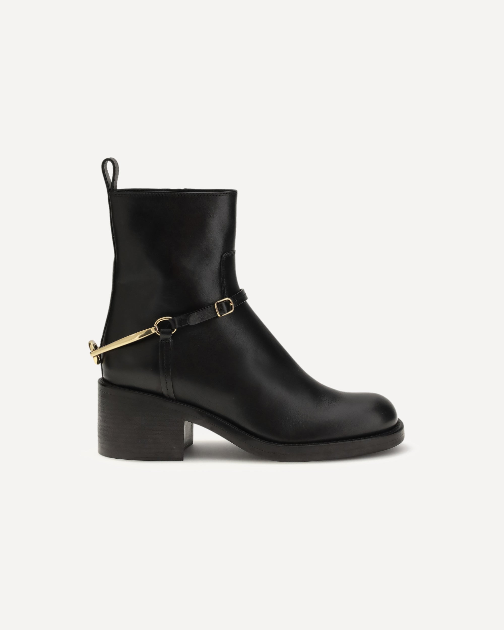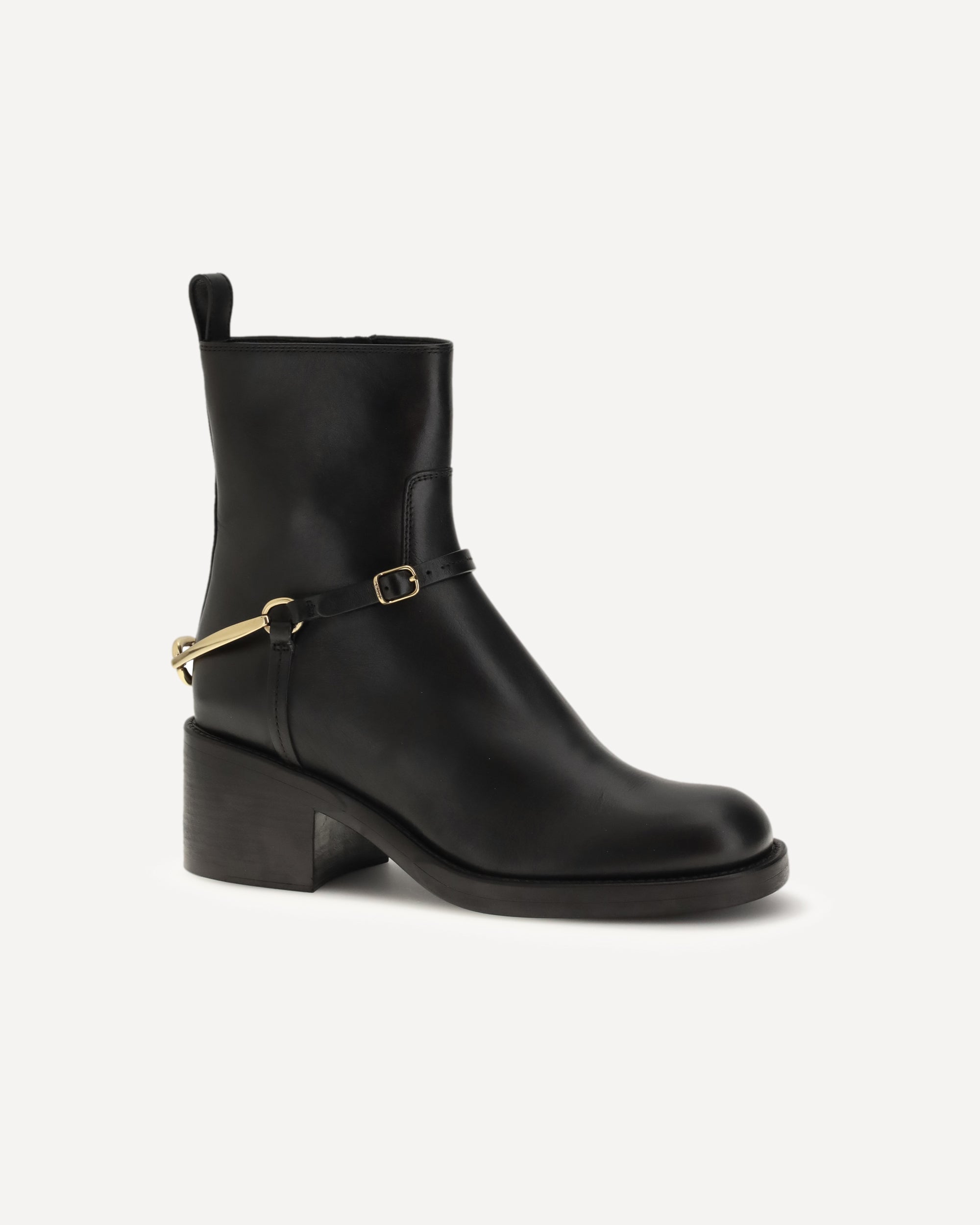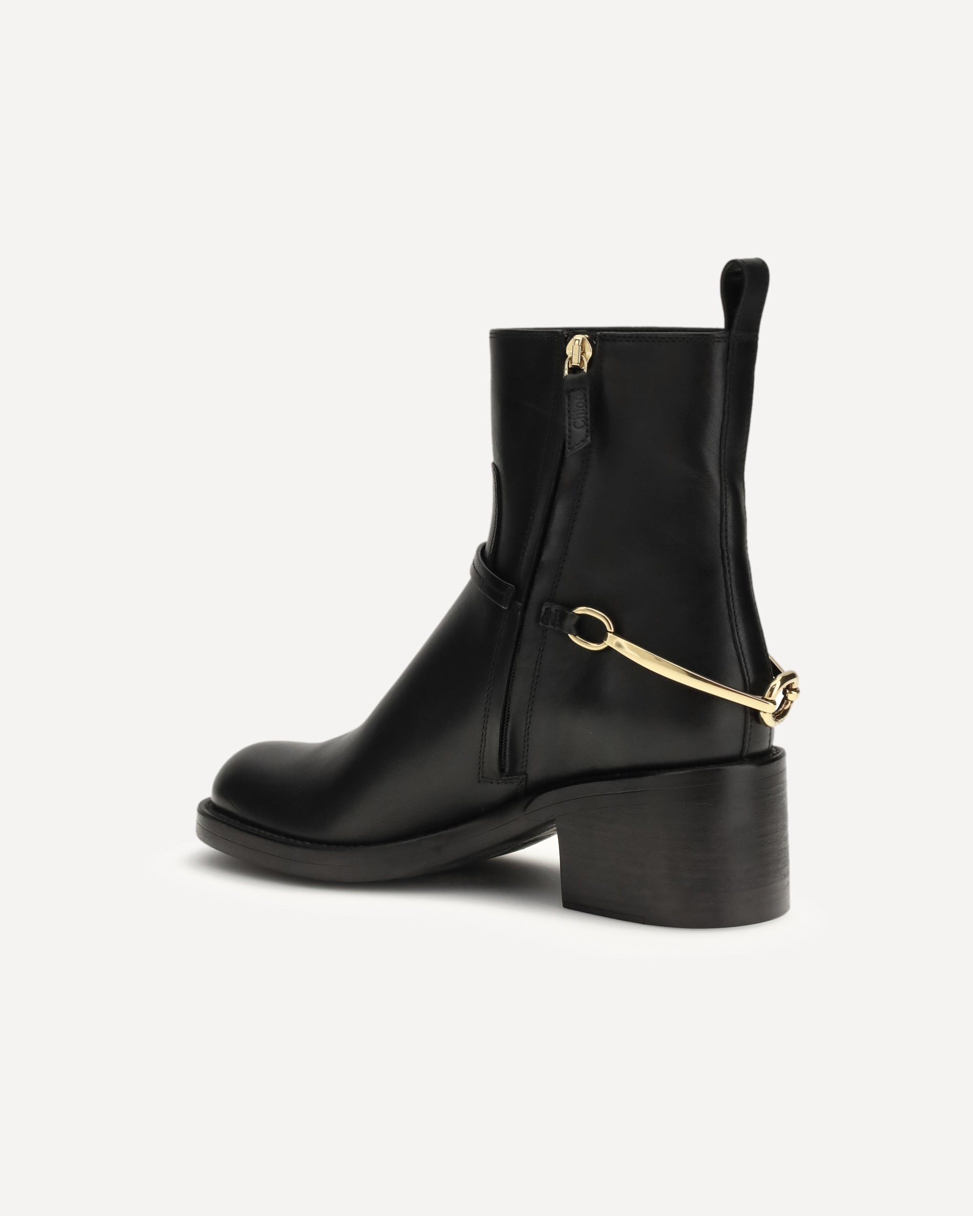 Gli Stivaletti Dakota di Chloé reinterpretano i classici stivali da equitazione in pelle di vitello semi-lucida, con tacco impilato e gamba dal taglio basso per comfort e stabilità. Le cinghie e i dettagli in metallo dorato con logo aggiungono un tocco distintivo, mentre la chiusura con zip completa il modello. Realizzati con pelle certificata Leather Working Group, con processi sostenibili e responsabili.